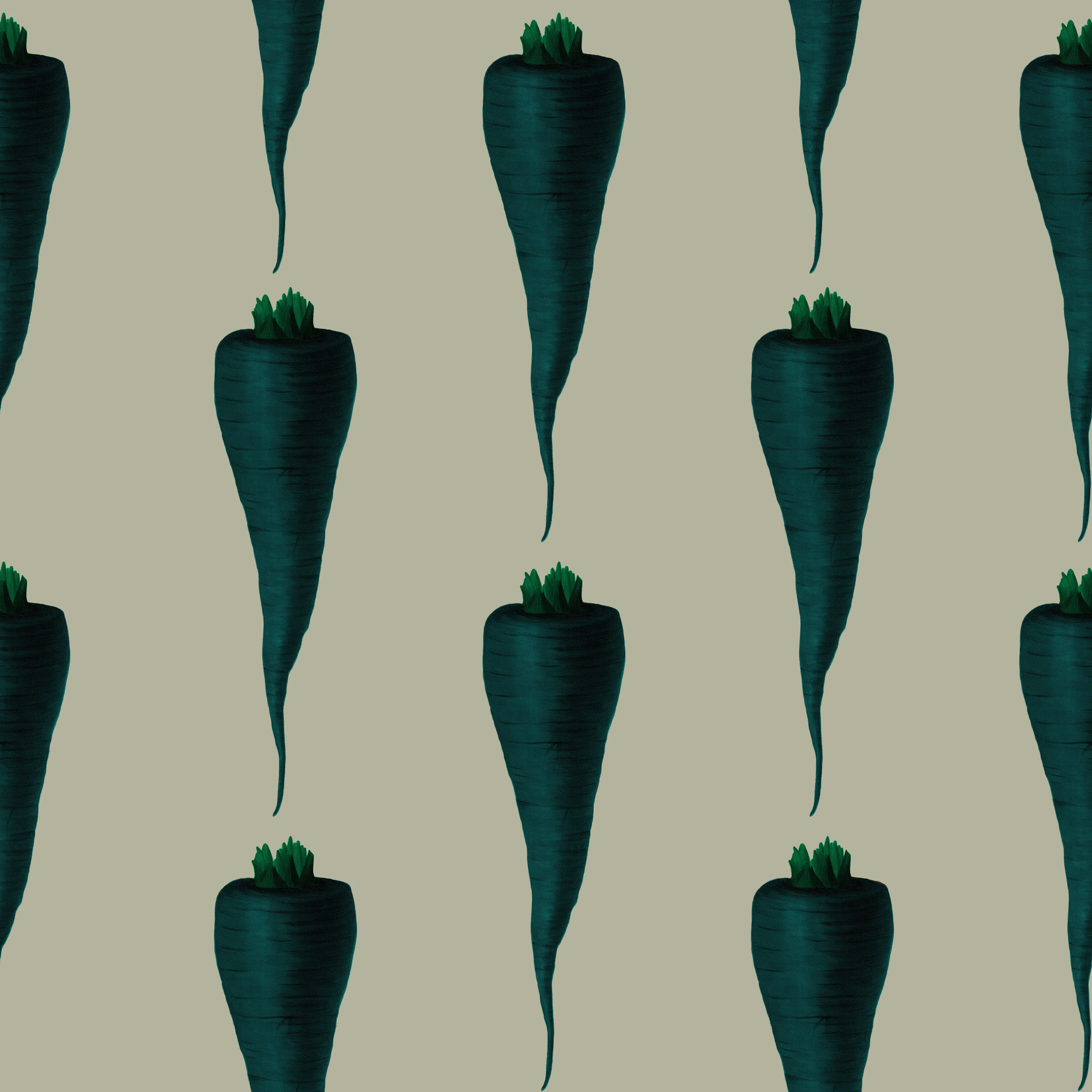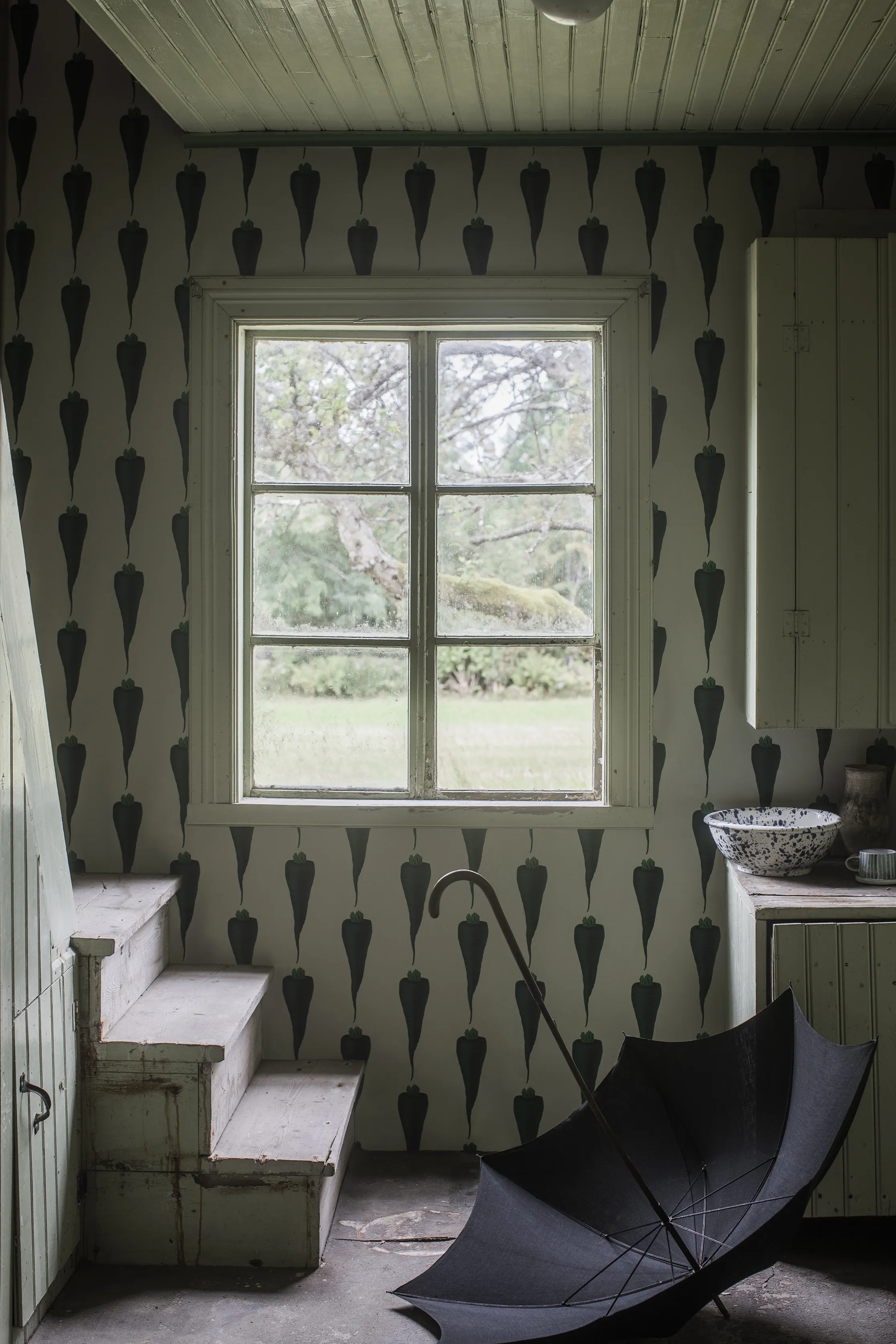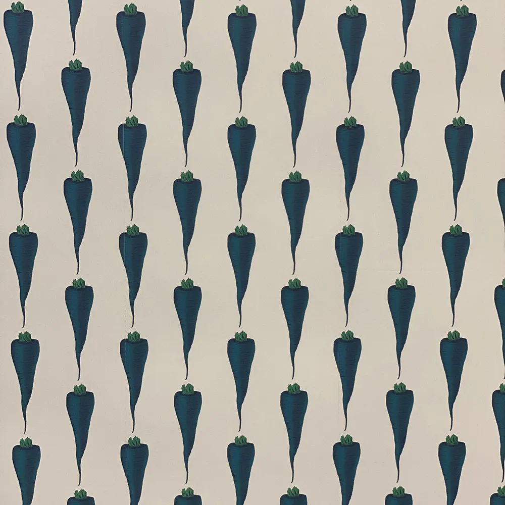 Studio Lisa Bengtsson's wallpaper Carey Carrot with large, blue-green carrots is a cool, retro-inspired wallpaper for the hallway, youth room, or kitchen.
