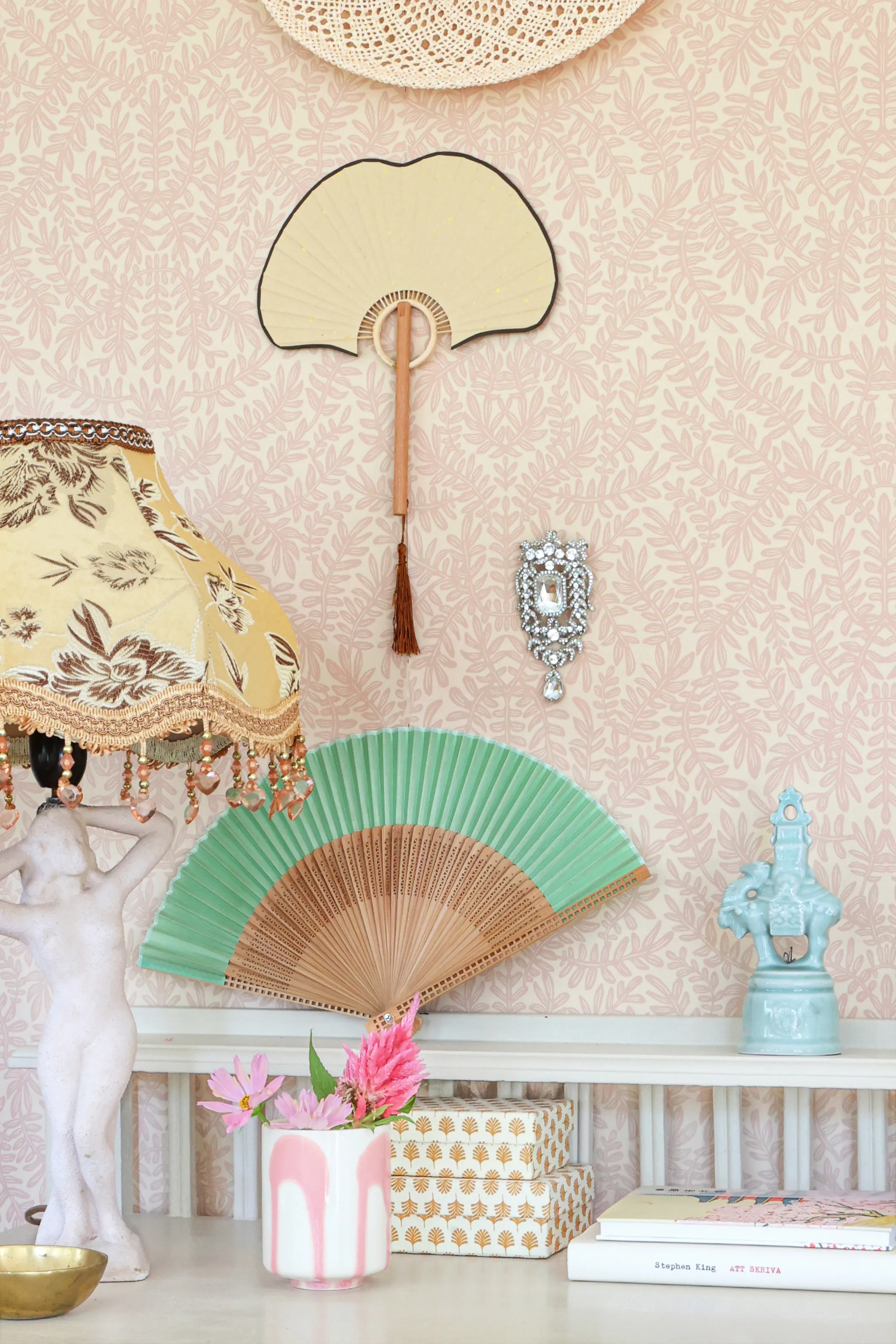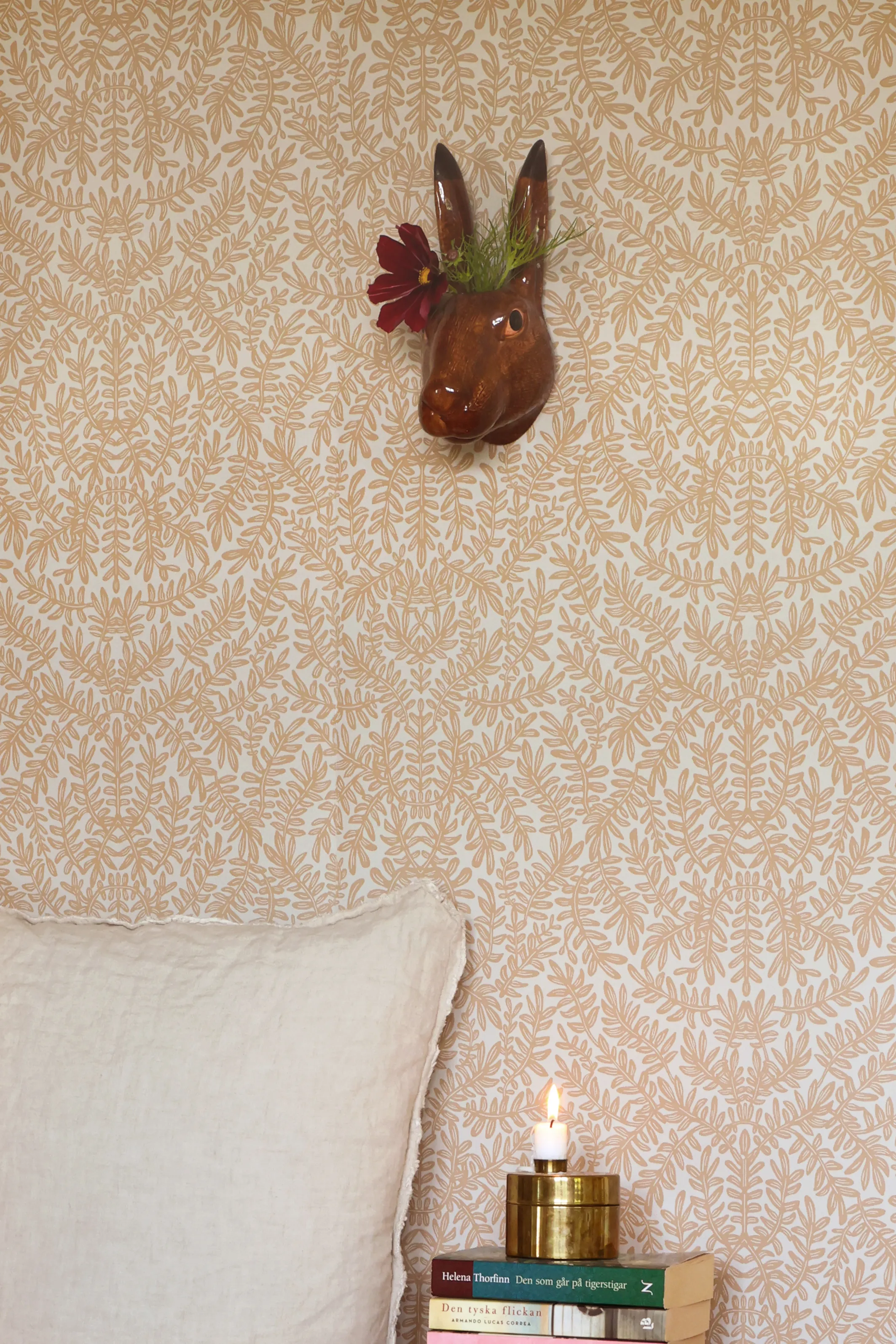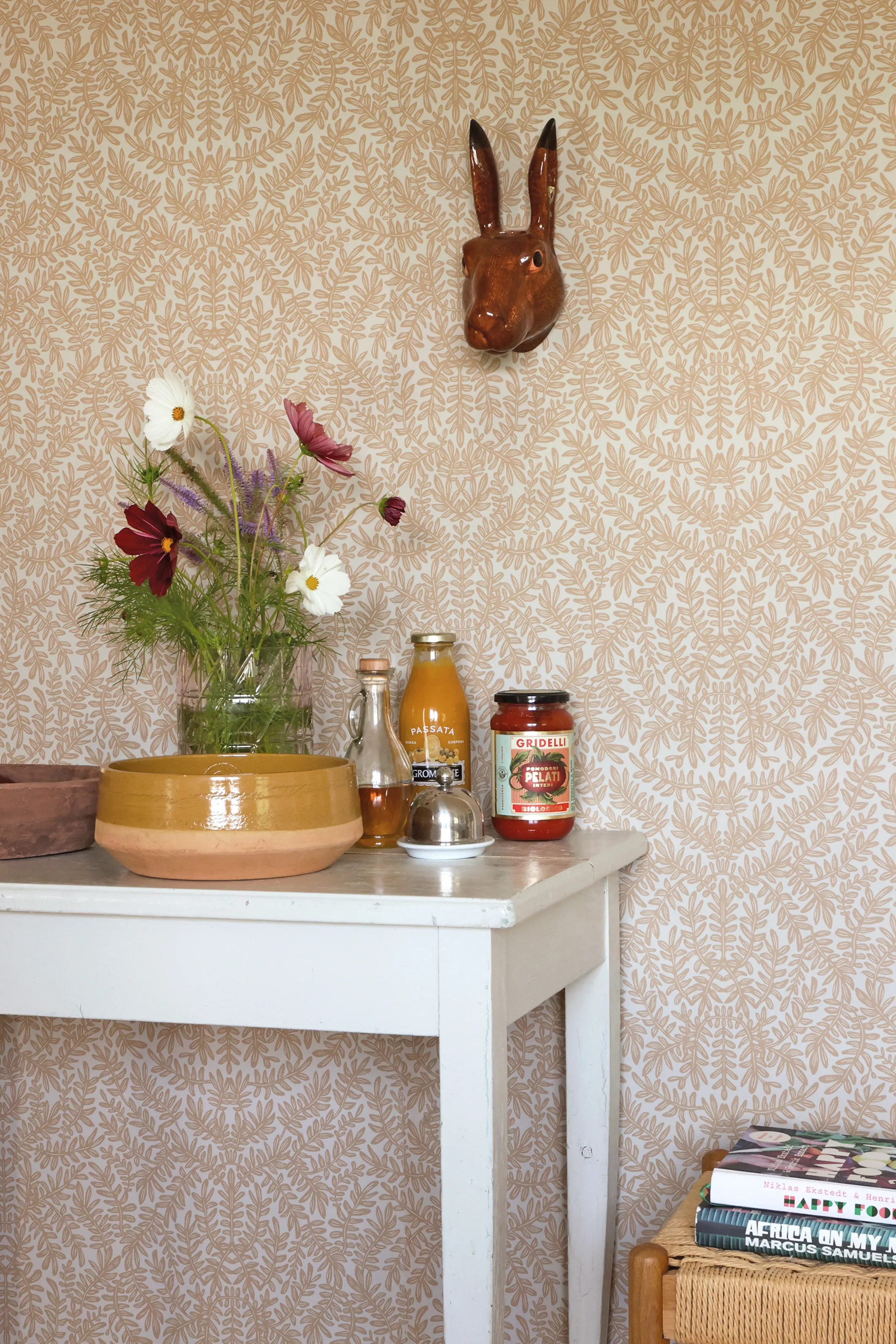 Majvillan’s Bellini wallpaper is a celebration of everyday beauty – light, balanced, and timelessly elegant. The pattern features hand-drawn flowers framed by curved leafy arches, creating a calm, rhythmic surface that feels both classic and fresh. It’s a modern interpretation of the traditional medallion motif – soft, airy, and perfectly proportioned.