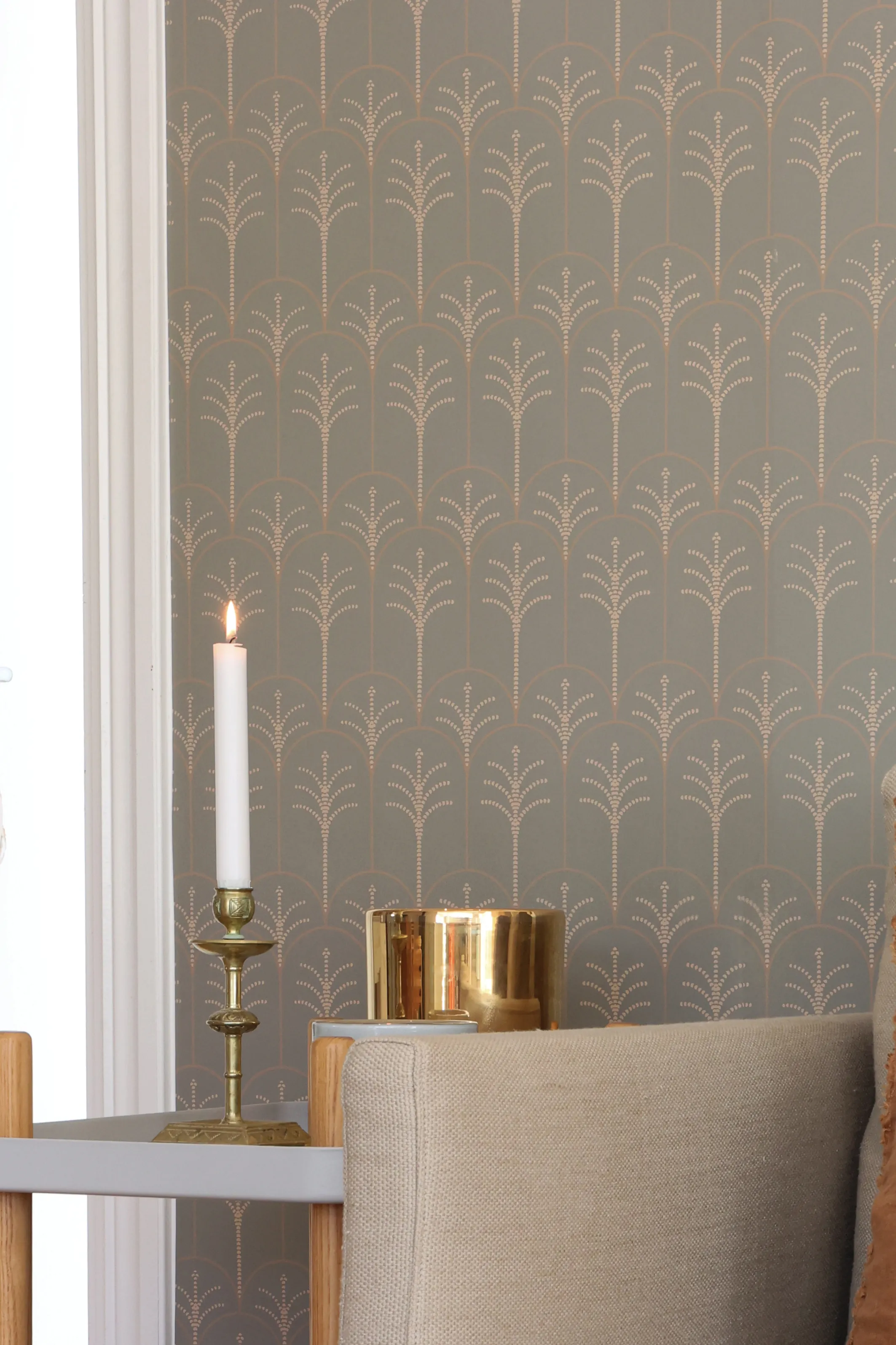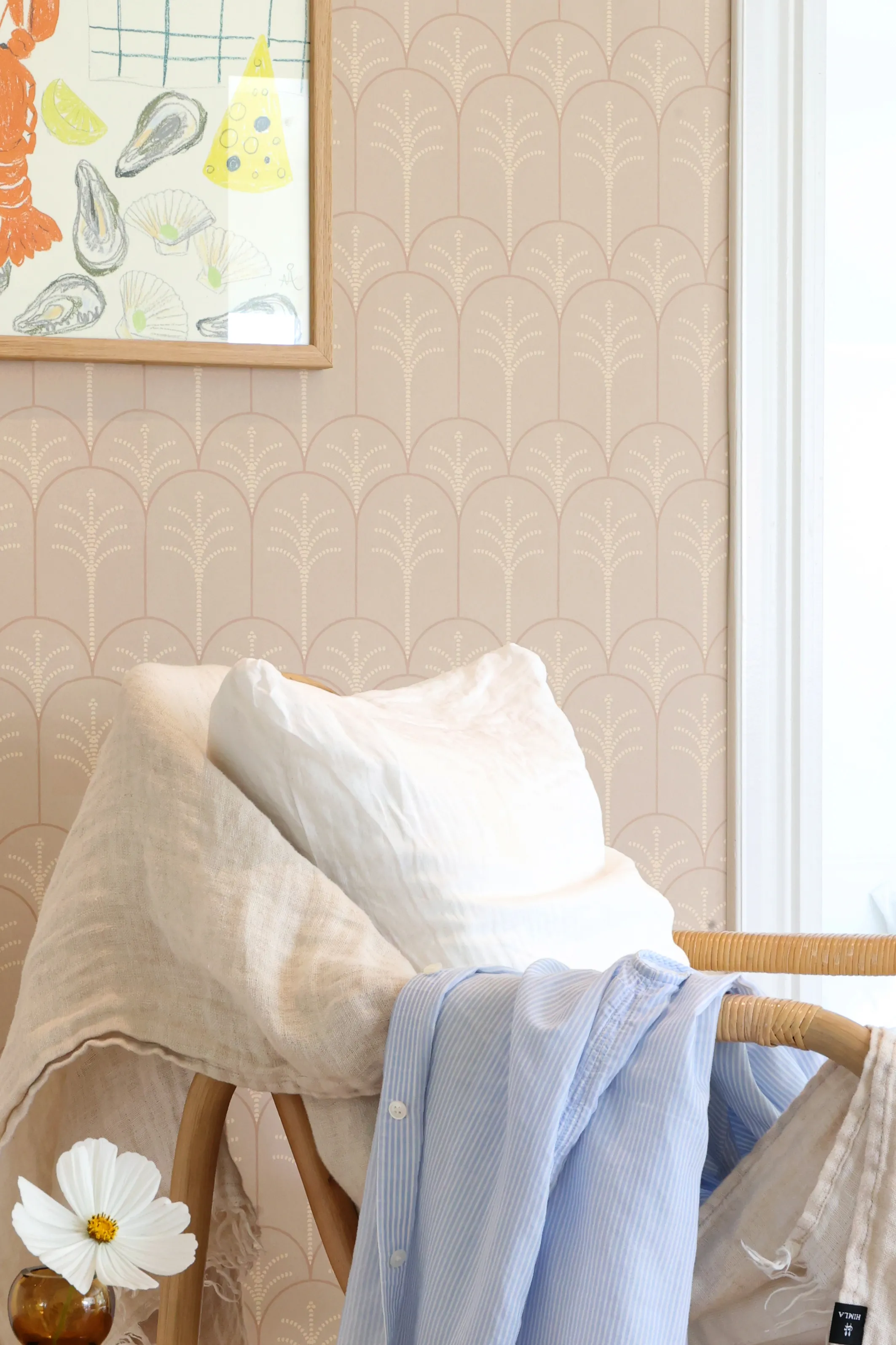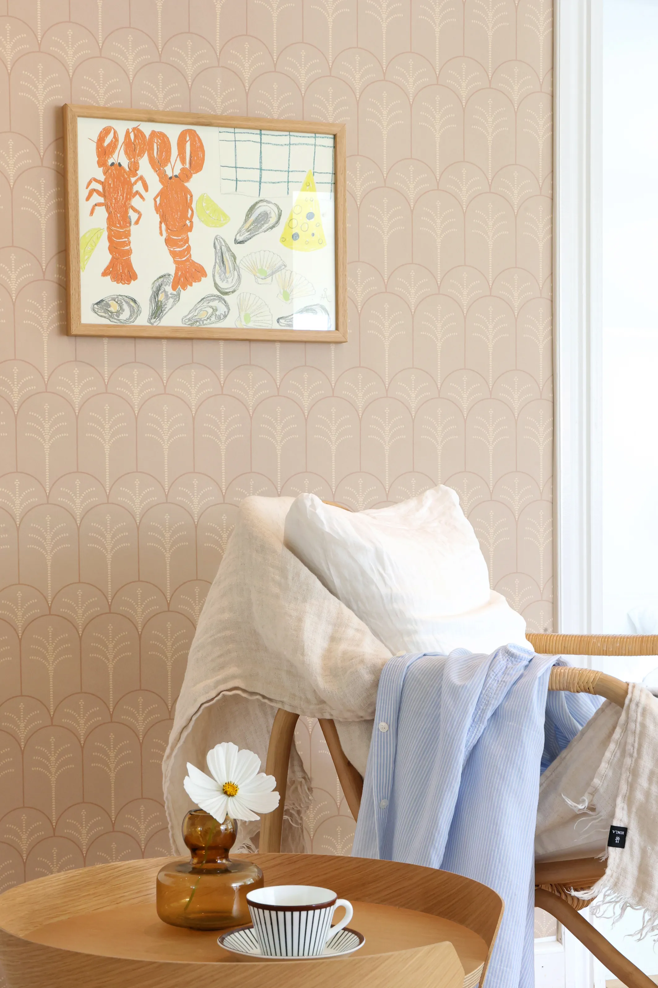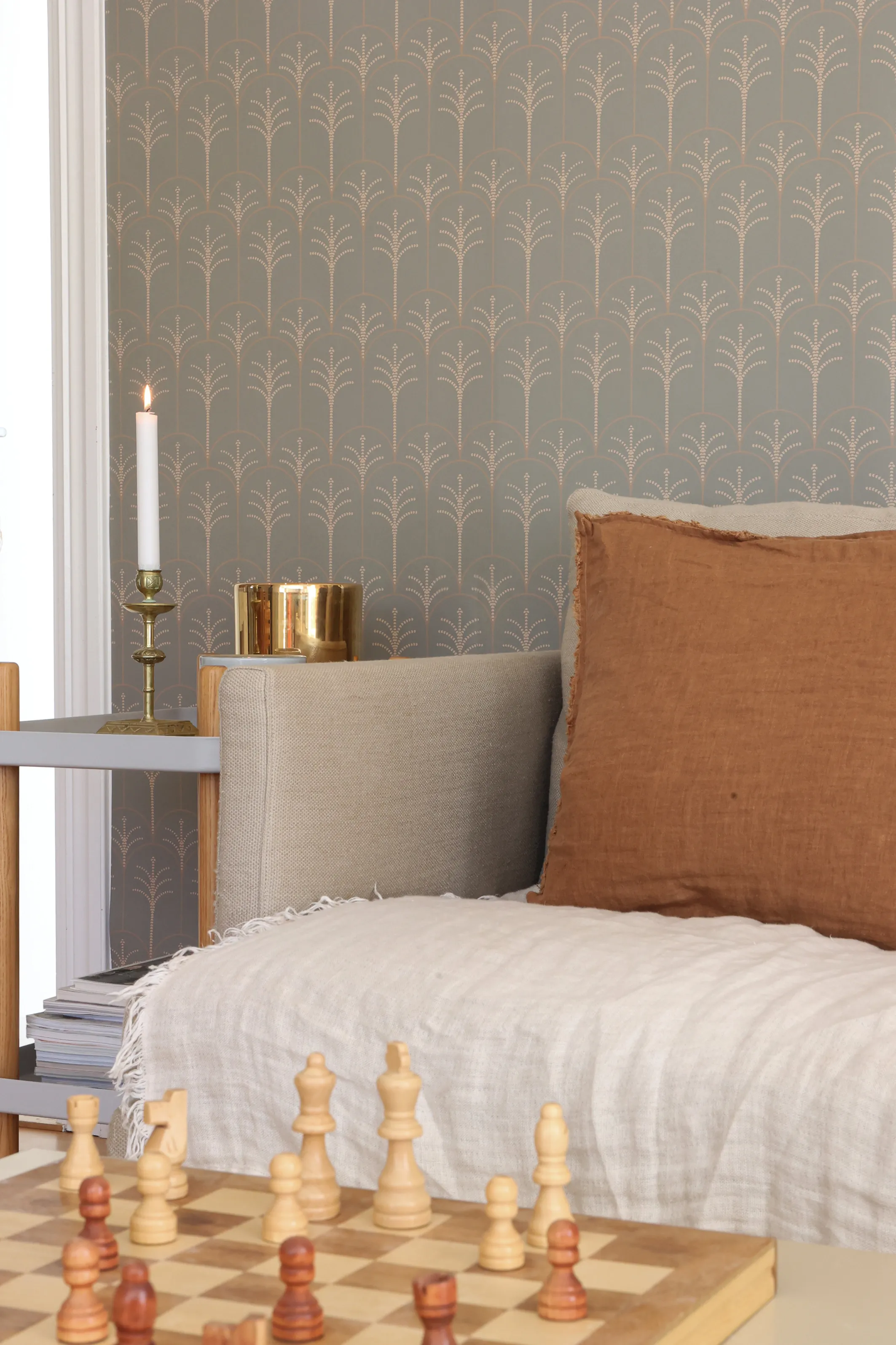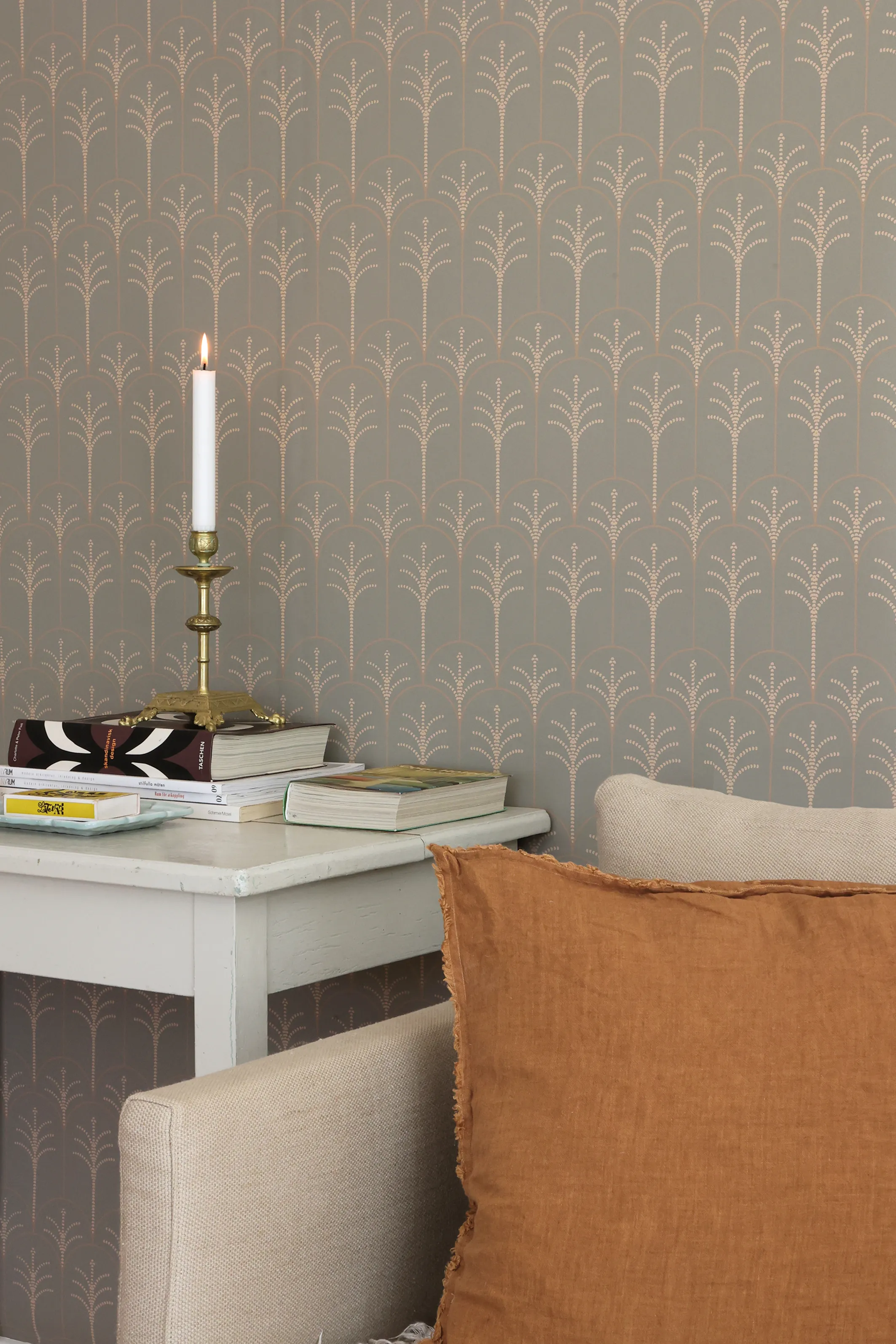 The Lolo wallpaper by Majvillan feels like a gentle pause in the day. Its softly arched, repeating pattern resembles delicate plant forms reaching towards the light. The design brings natural calm and refined rhythm, giving the room a balanced and inviting atmosphere.
