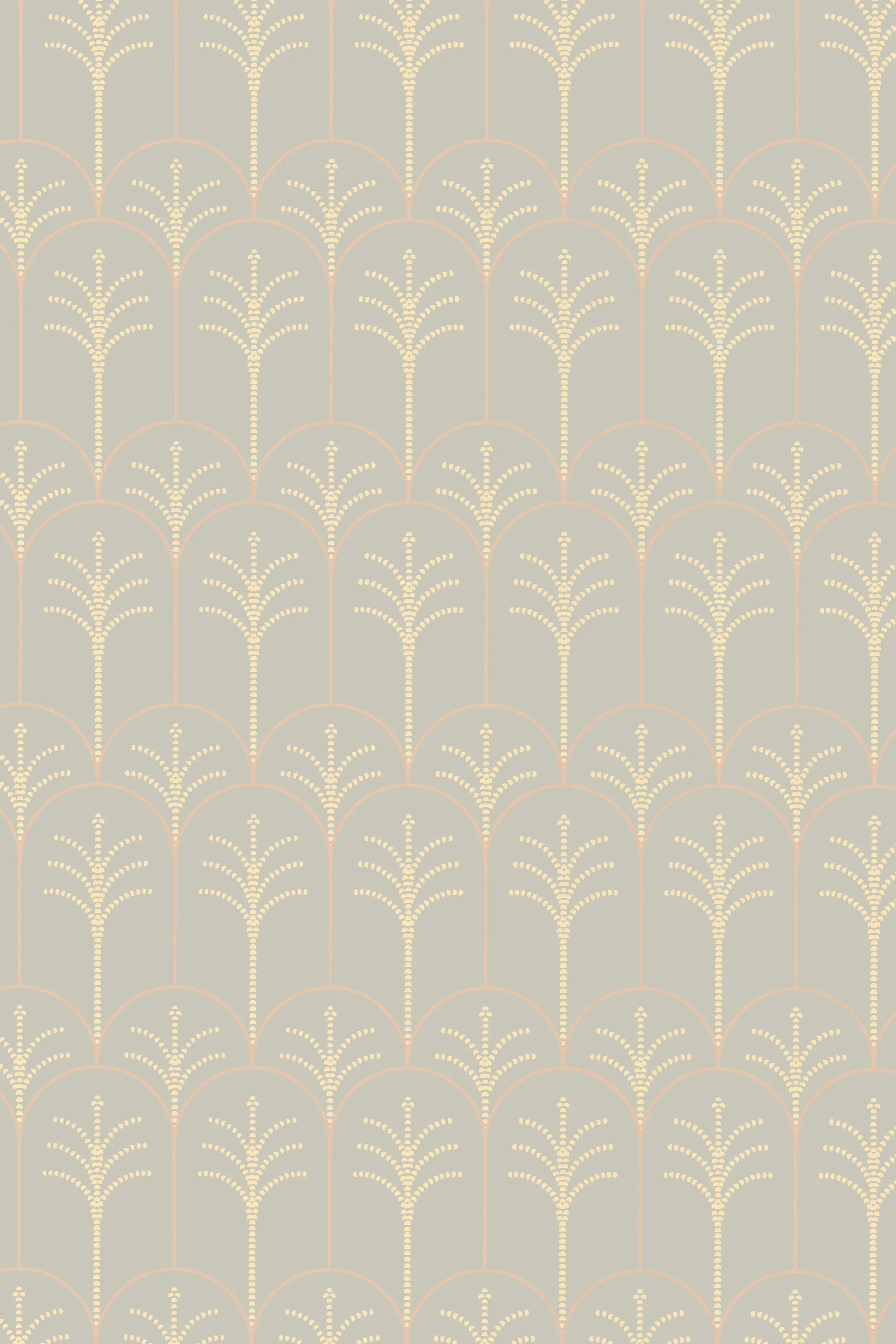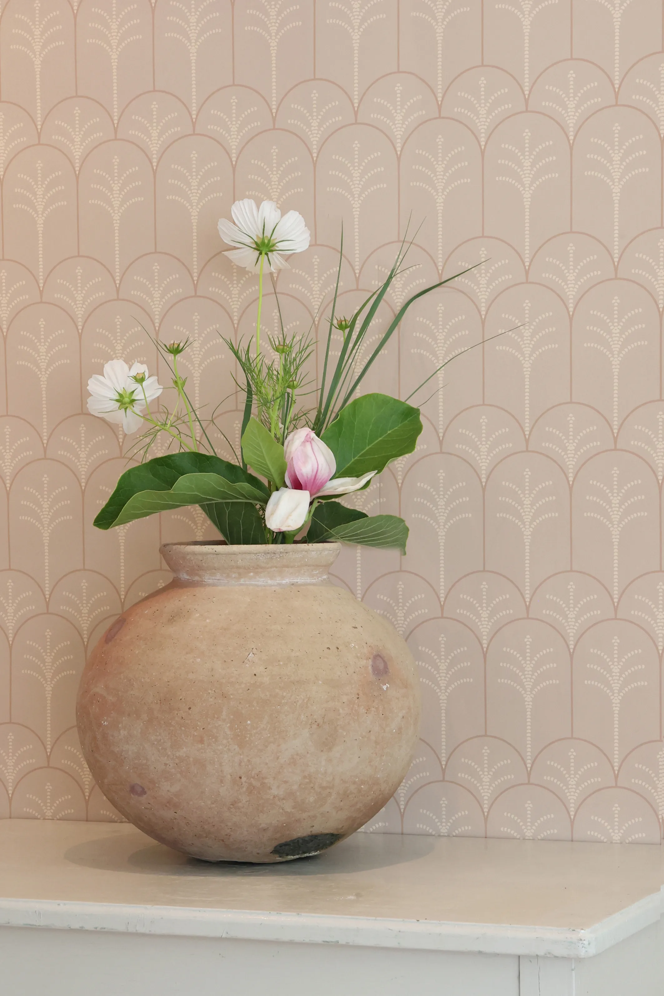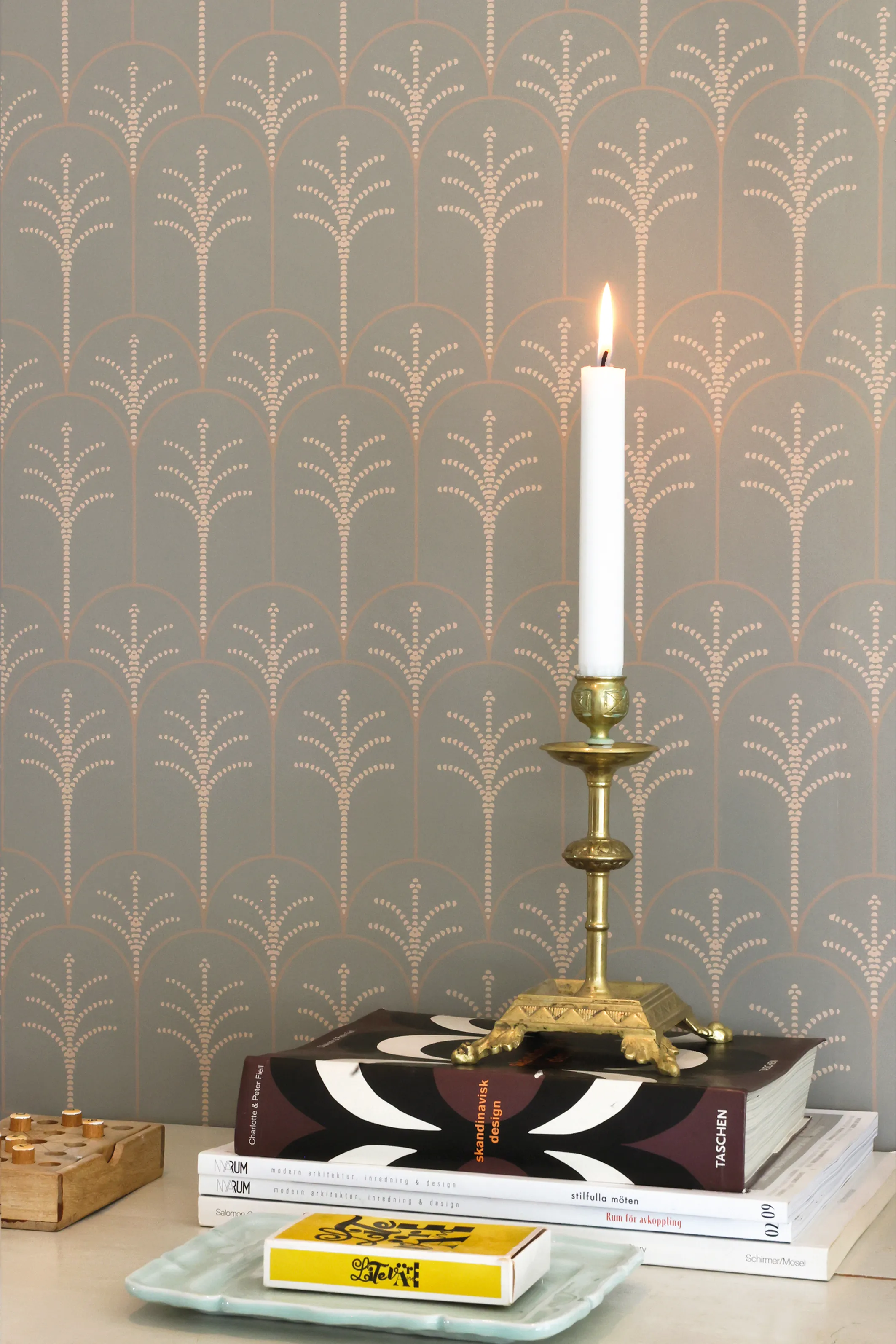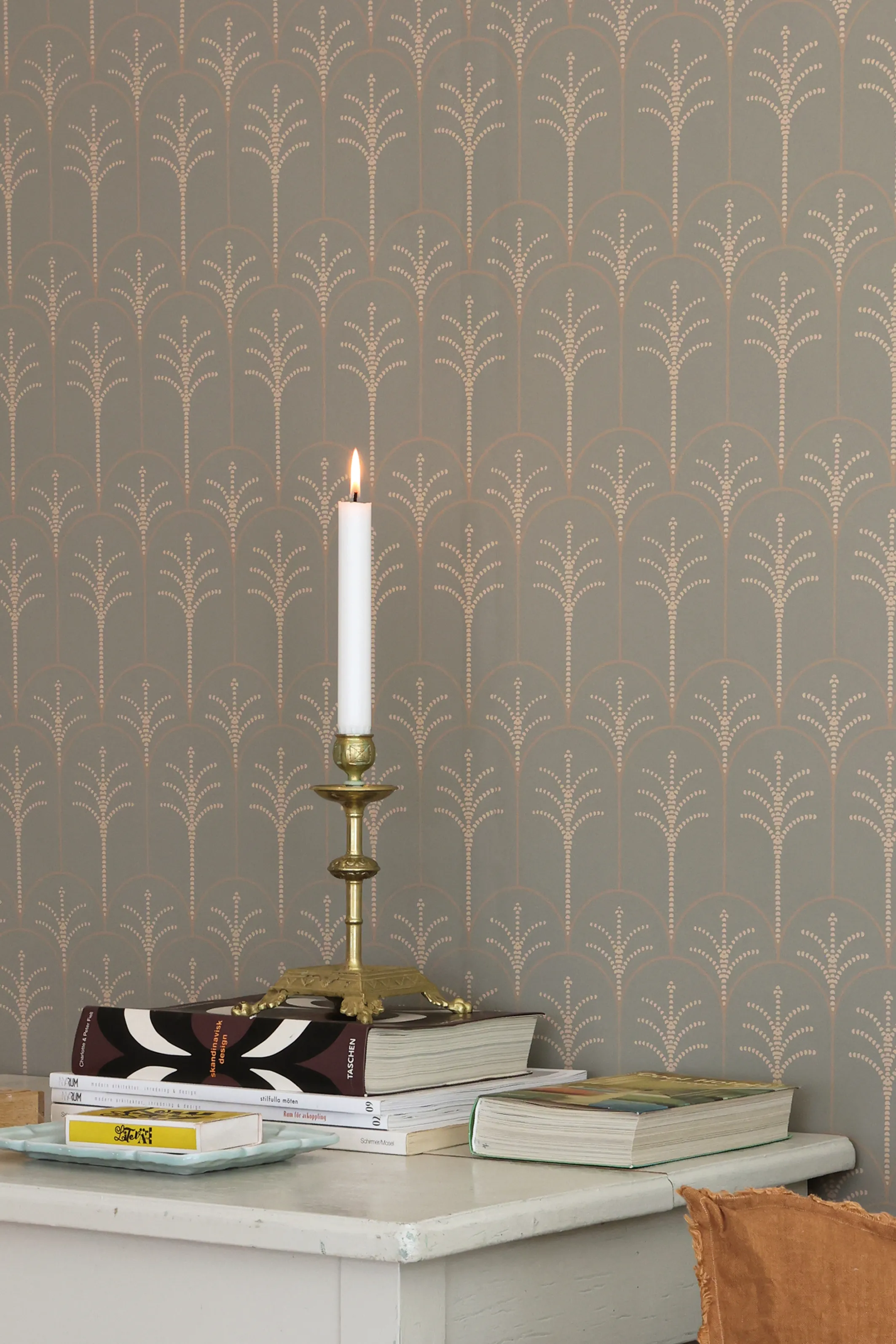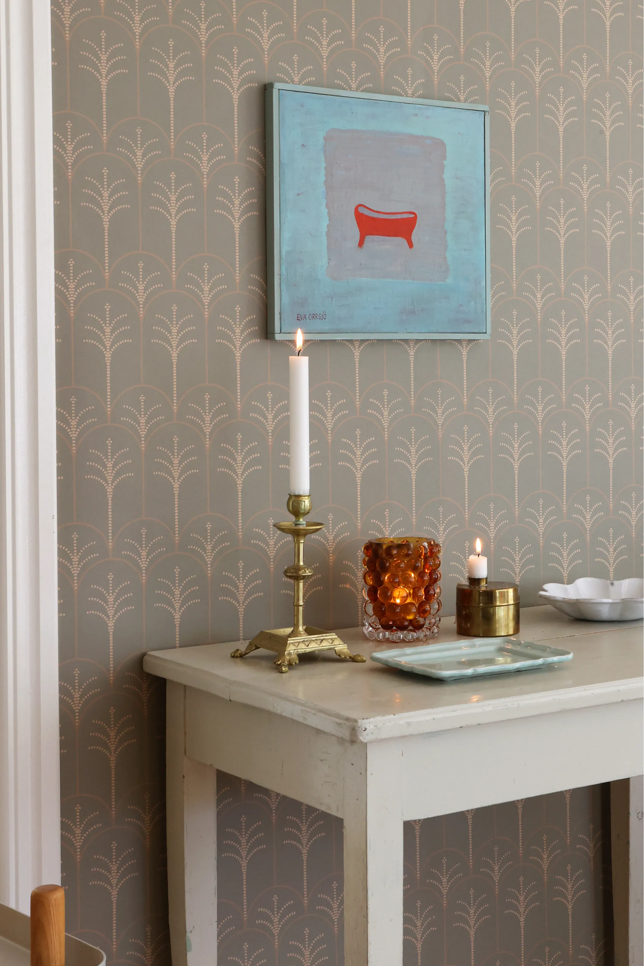 The Lolo wallpaper by Majvillan feels like a gentle pause in the day. Its softly arched, repeating pattern resembles delicate plant forms reaching towards the light. The design brings natural calm and refined rhythm, giving the room a balanced and inviting atmosphere.