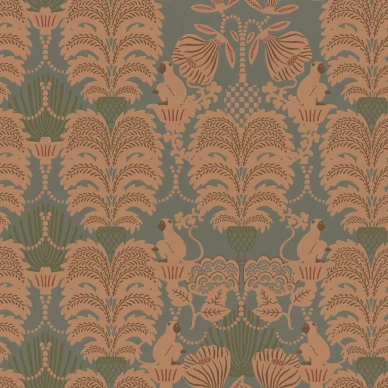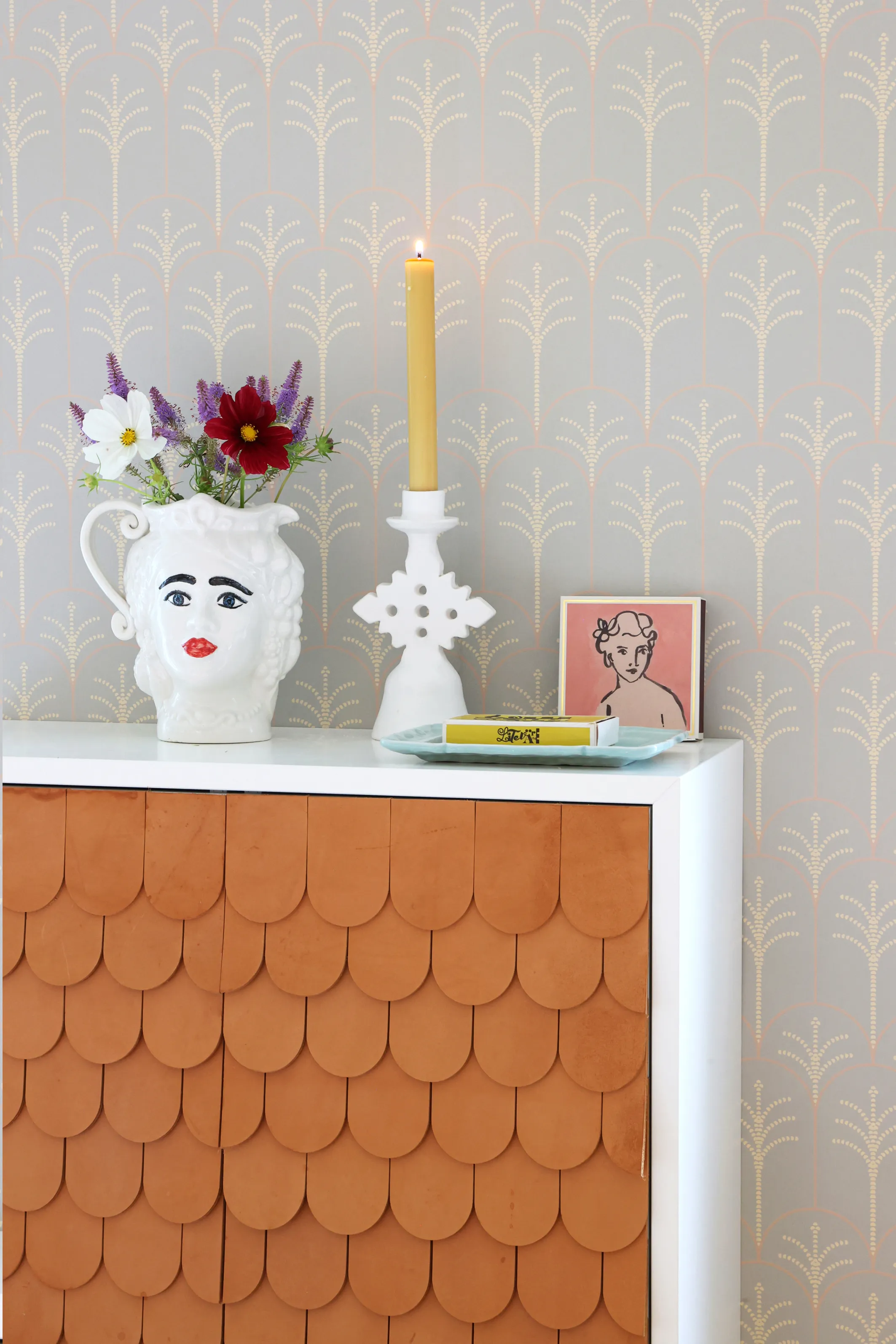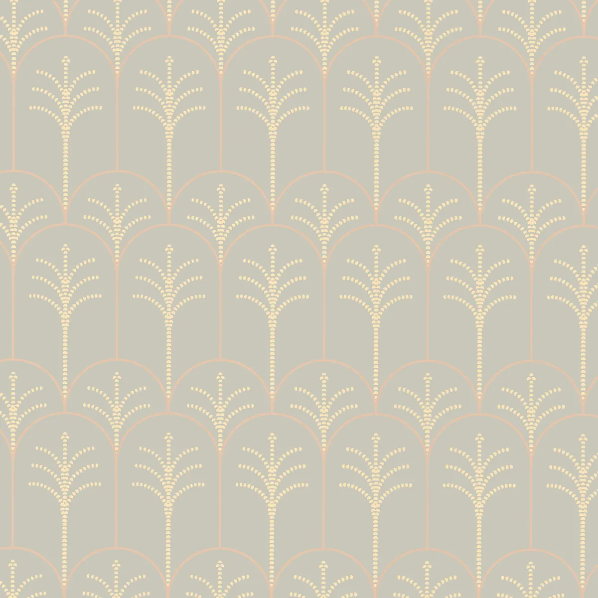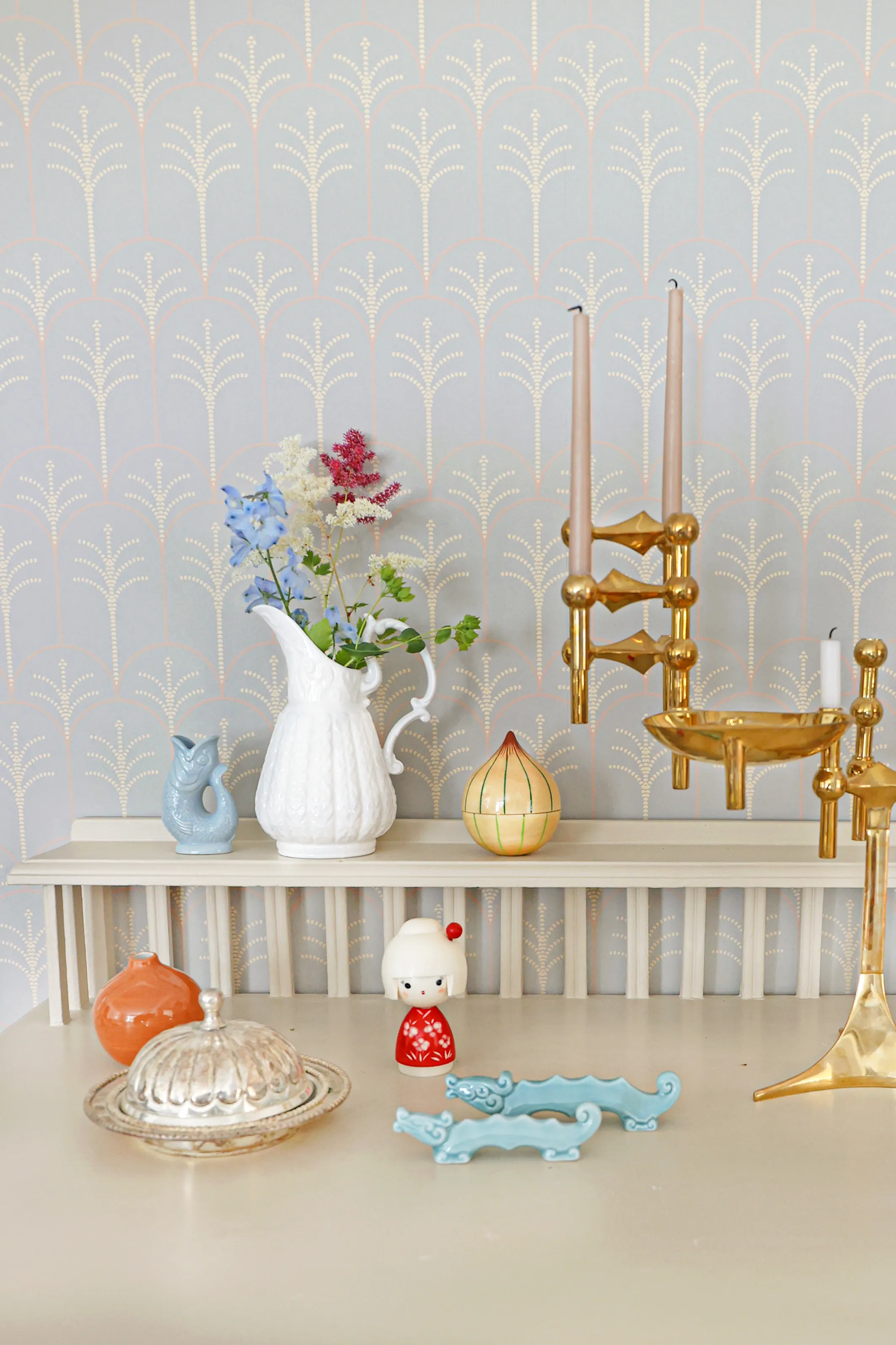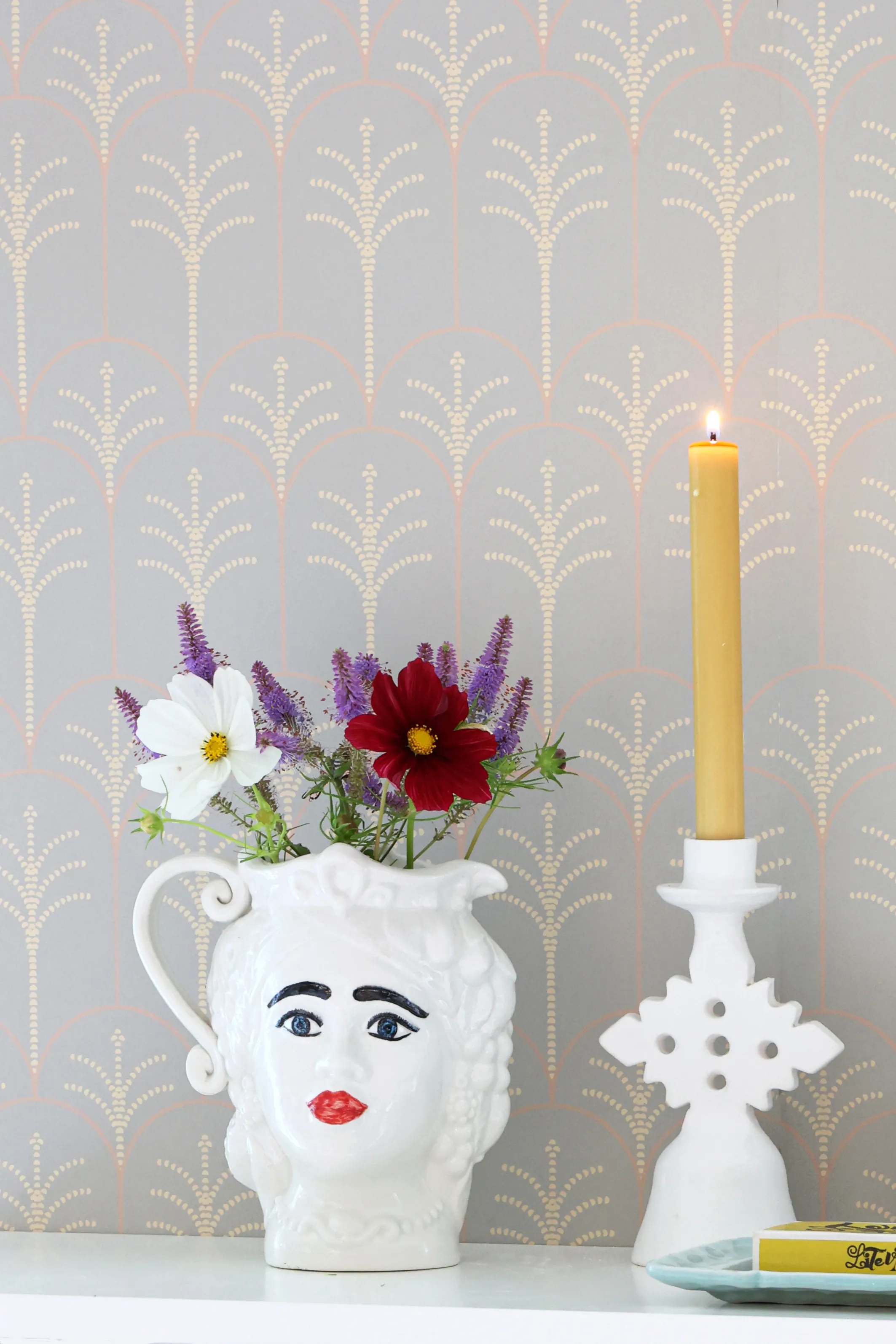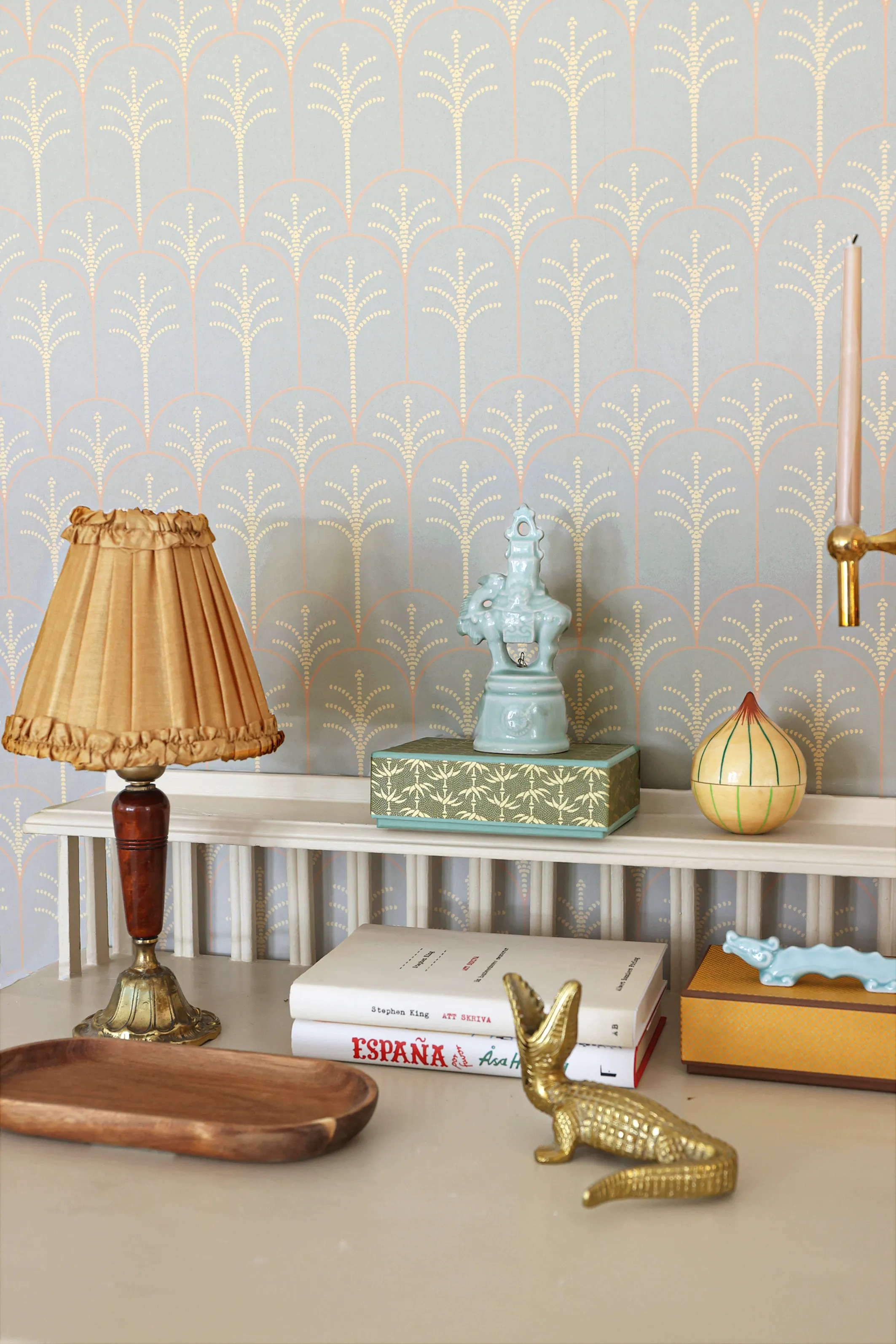 The Lolo wallpaper by Majvillan feels like a gentle pause in the day. Its softly arched, repeating pattern resembles delicate plant forms reaching towards the light. The design brings natural calm and refined rhythm, giving the room a balanced and inviting atmosphere.
