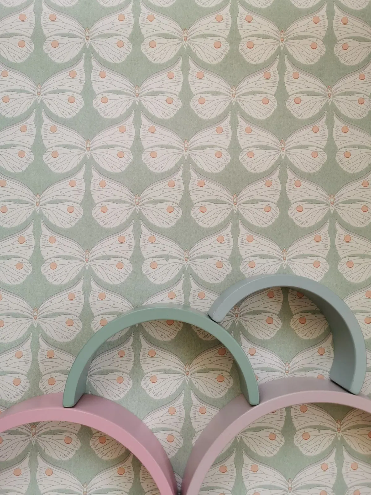 Ritva Kronlund's classic butterfly wallpaper Perhonen is a timeless retro classic with a 1960s and 1970s feel. The wallpaper is suitable for the dining room, living room, bedroom, or hallway.
