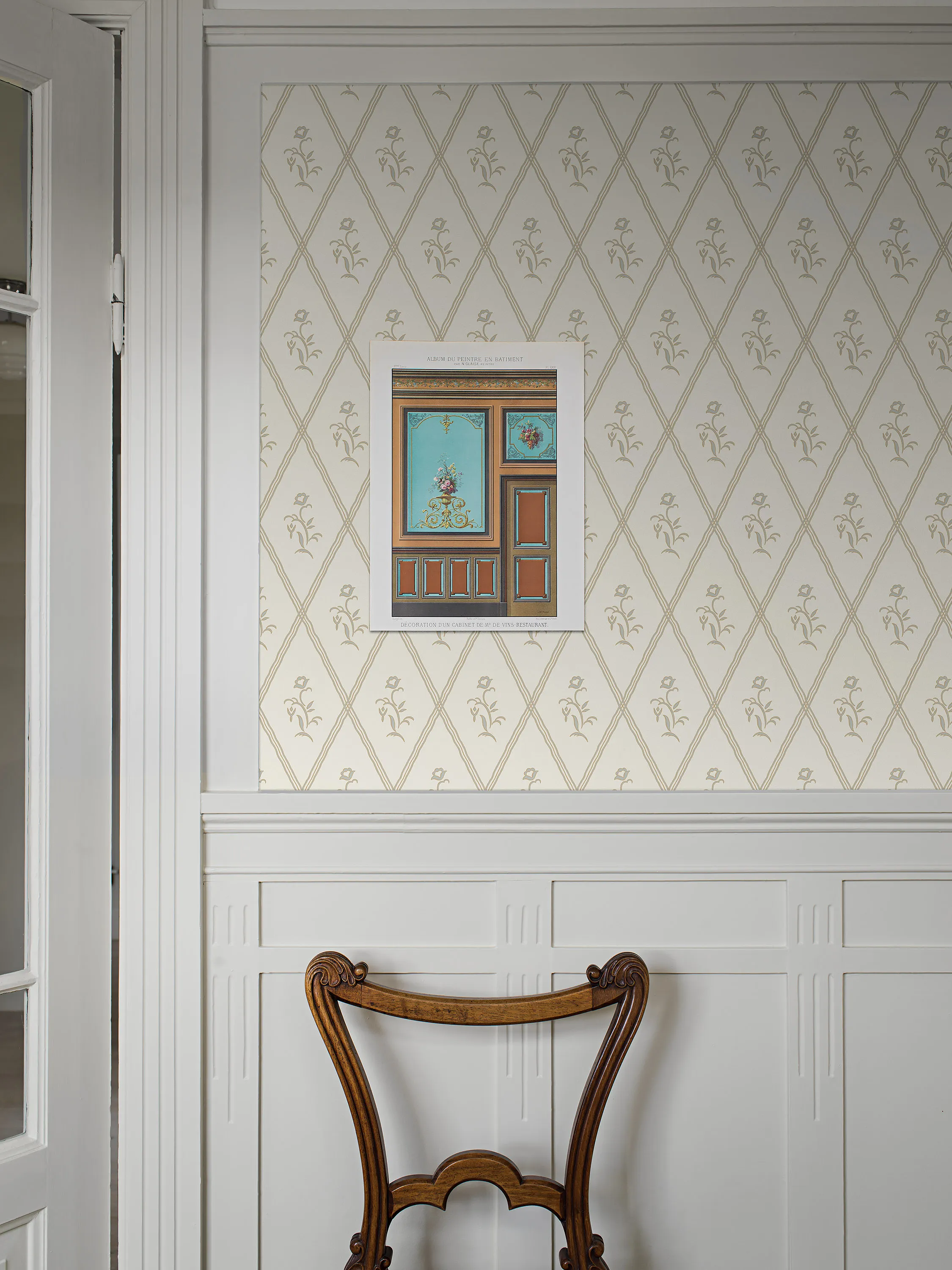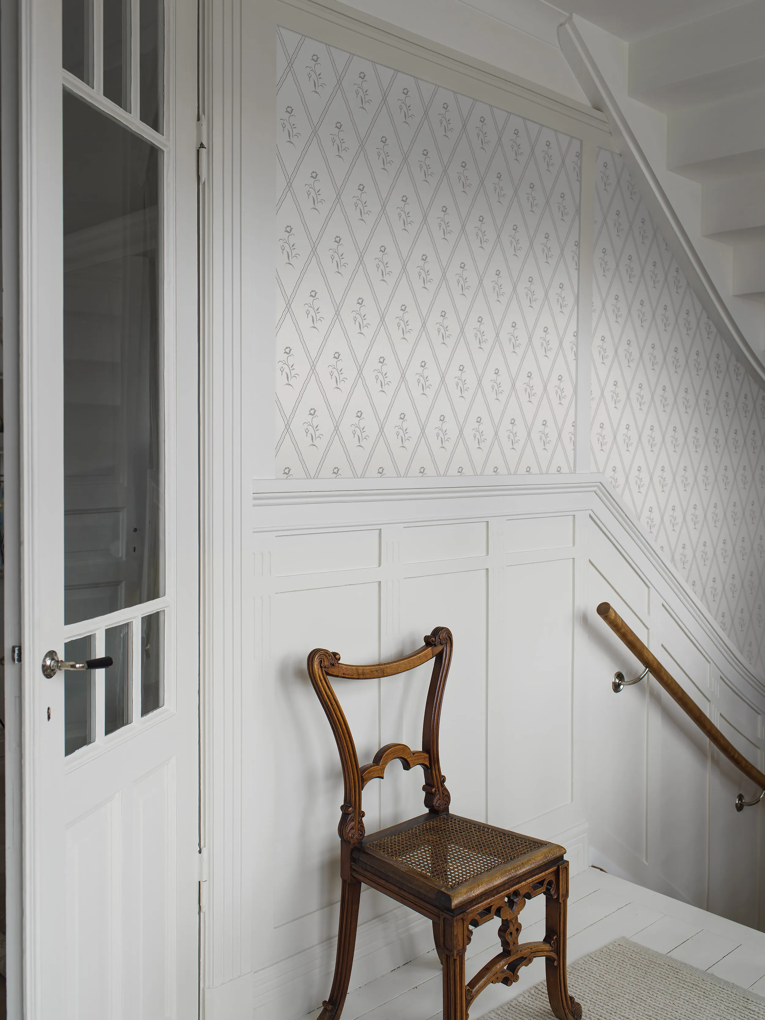 Signe is a classic checkered wallpaper that echoes the 1920s Swedish Grace style. The pattern consists of soft diagonal lines and sweet little floral motifs, making it a timeless and elegant choice for home decor. Signe's airy checkered pattern is simple, yet it is elegant and stylish. The wallpaper is printed with traditional techniques, giving it a unique and traditional character. The Signe wallpaper is like a window to a bygone era, yet it fits perfectly into a modern home environment, creating atmosphere and elegance.