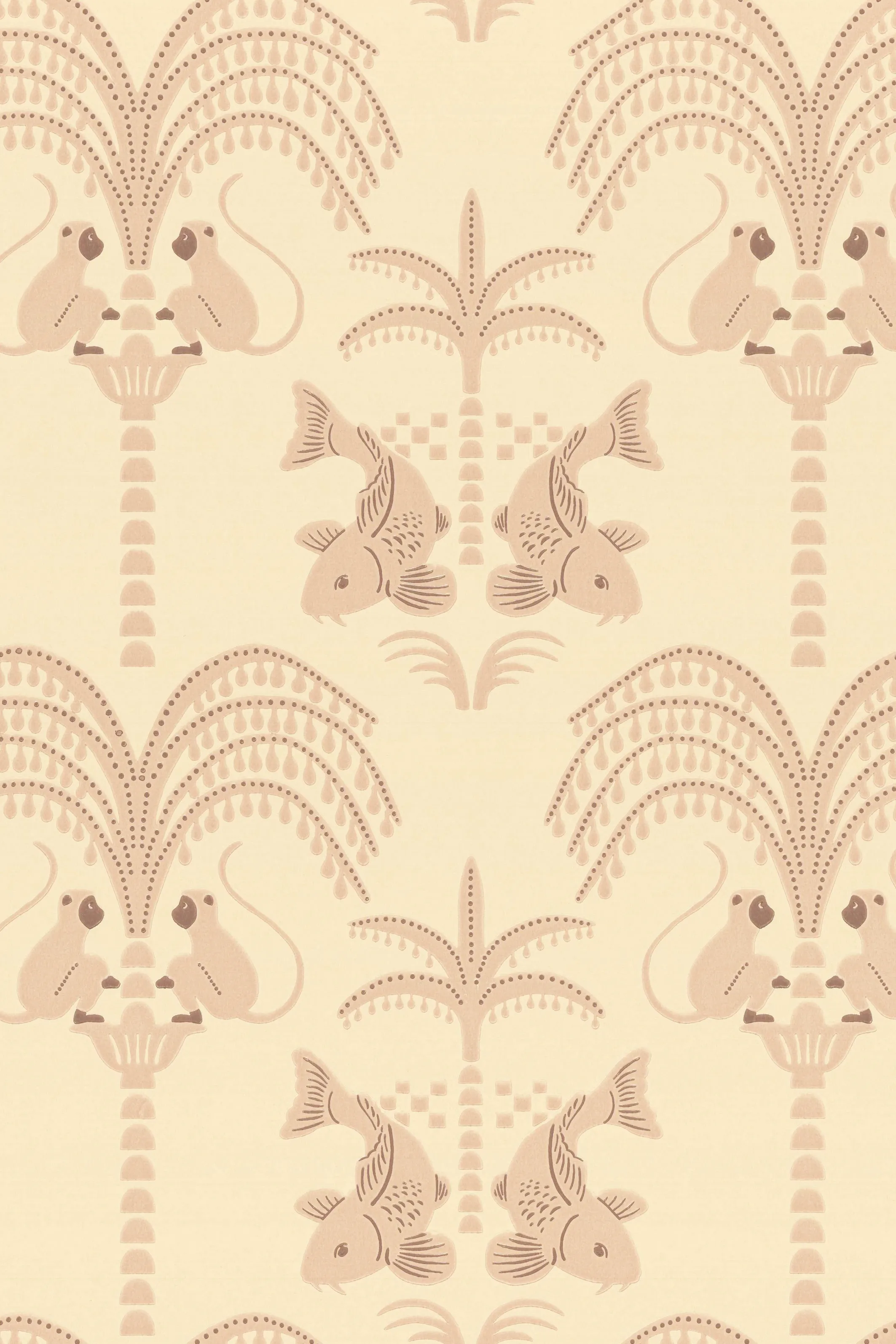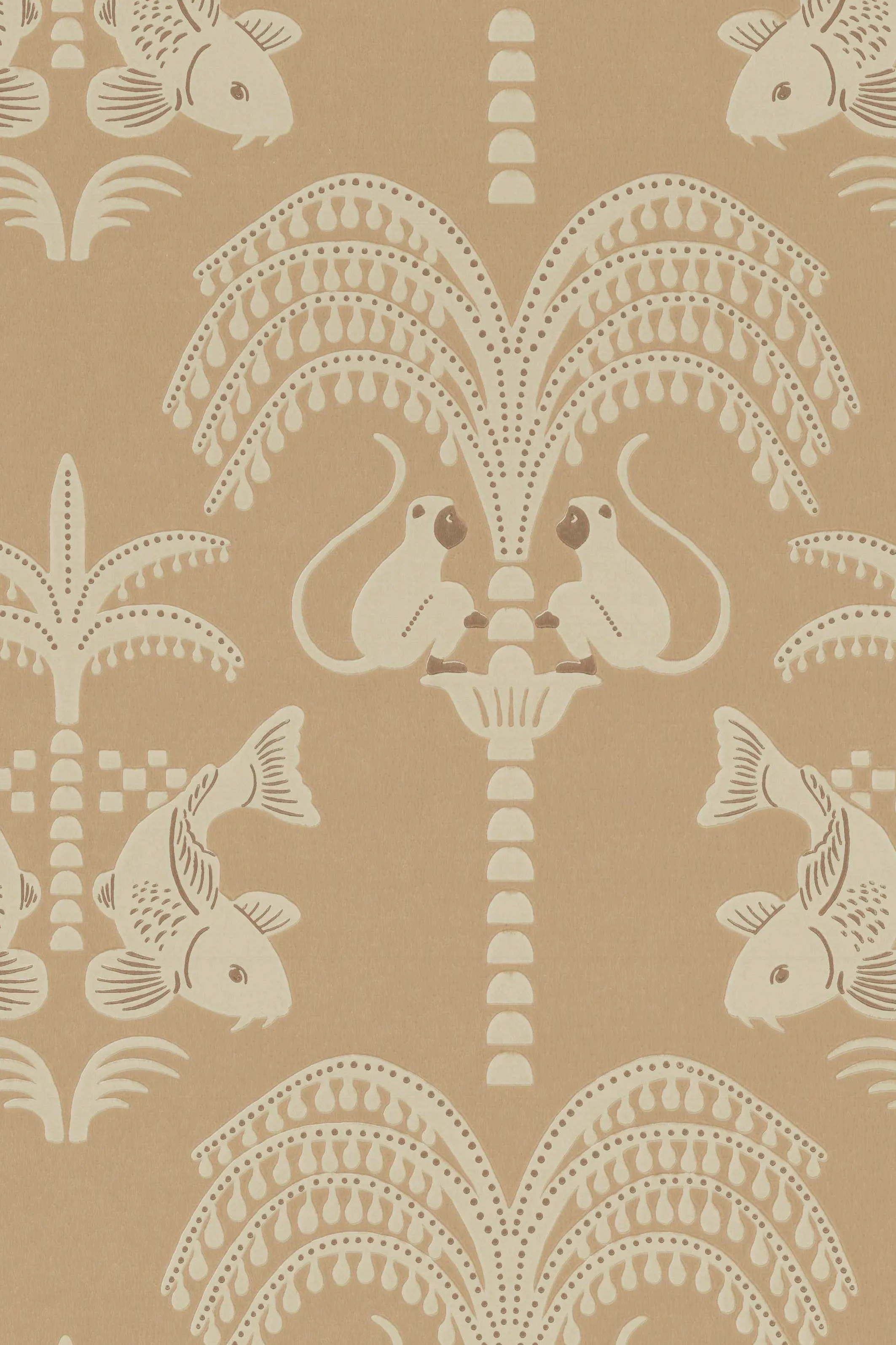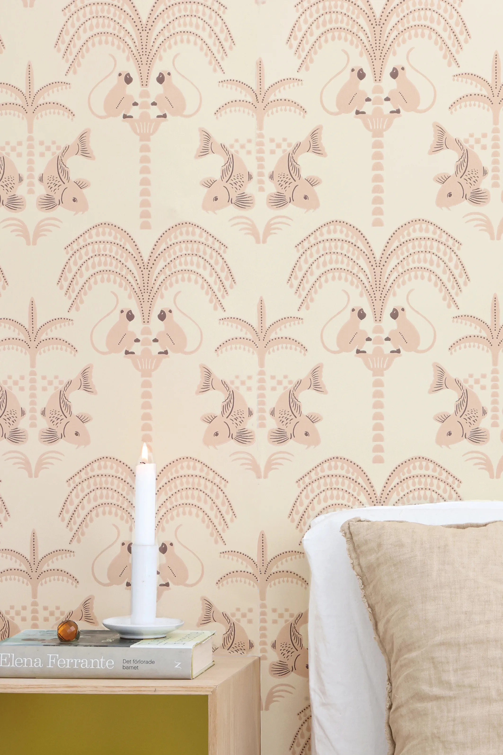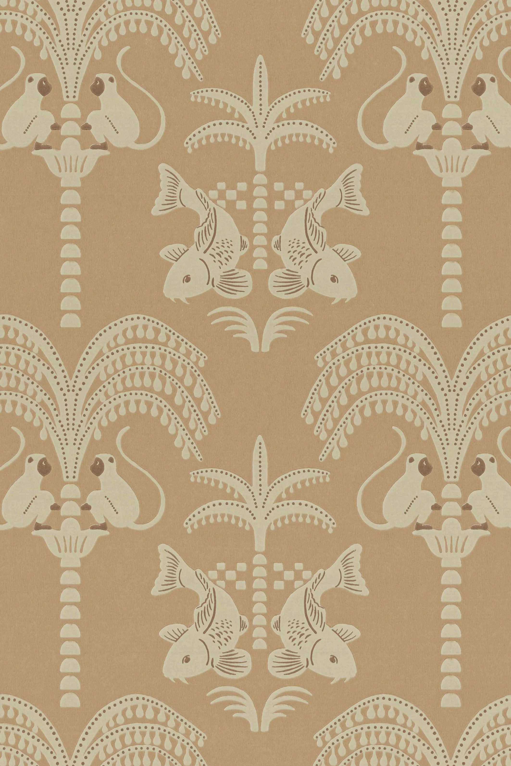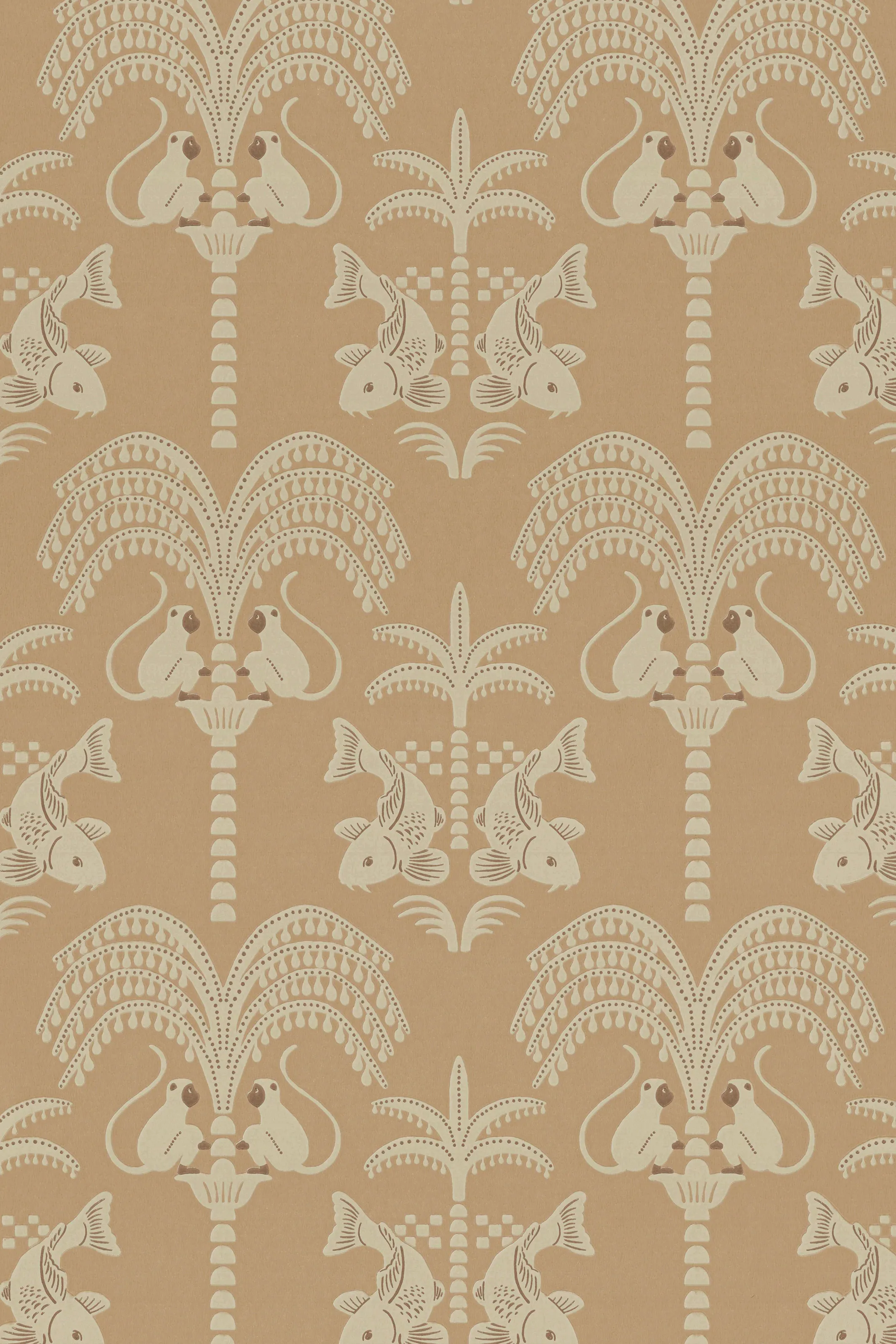 Majvillan’s Sunset Gold wallpaper is a warm tribute to light, nature, and the beauty of peaceful moments. The pattern features decorative palm trees, playful monkeys, and graceful fish, all arranged in a balanced, storytelling rhythm that evokes a sense of calm joy.