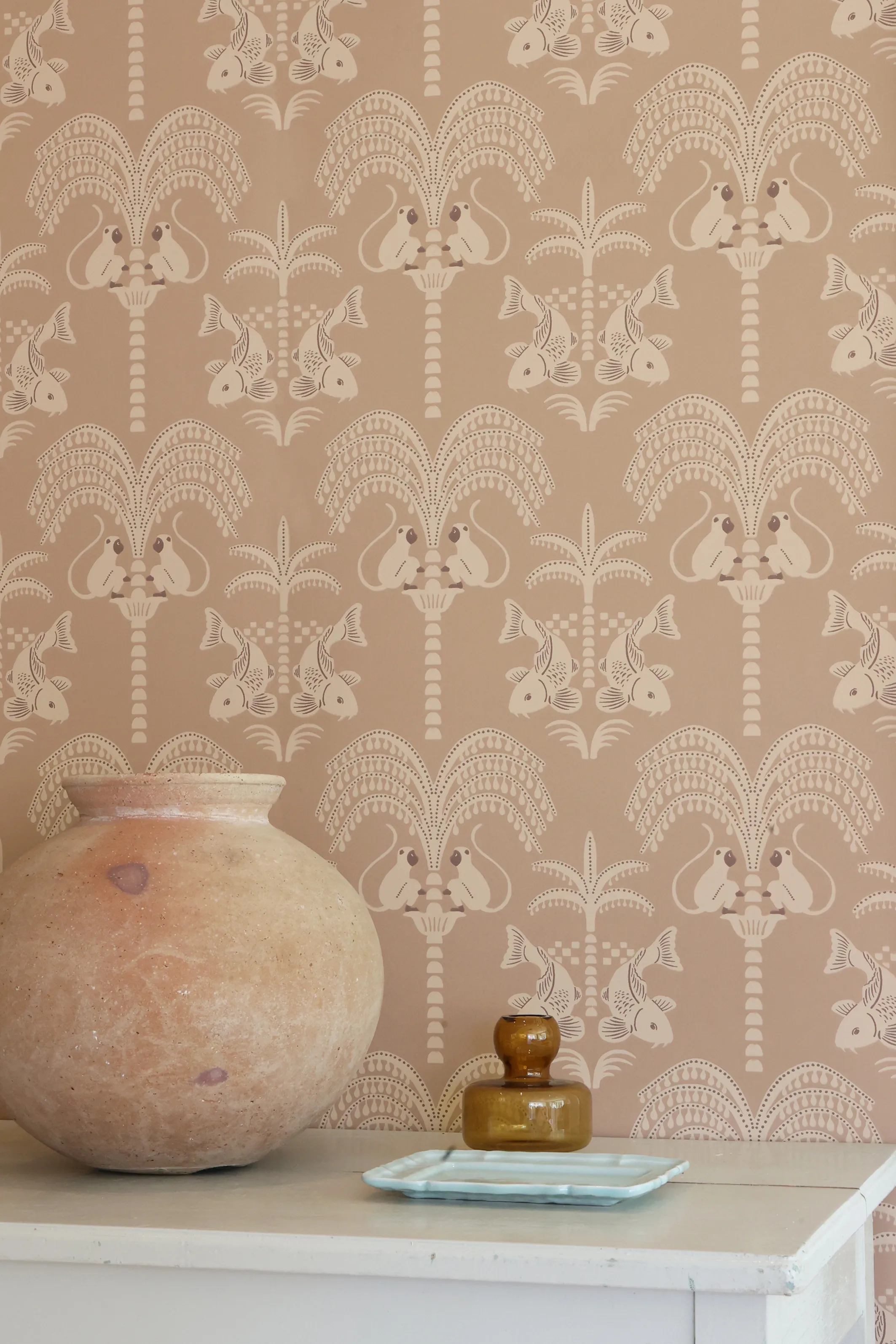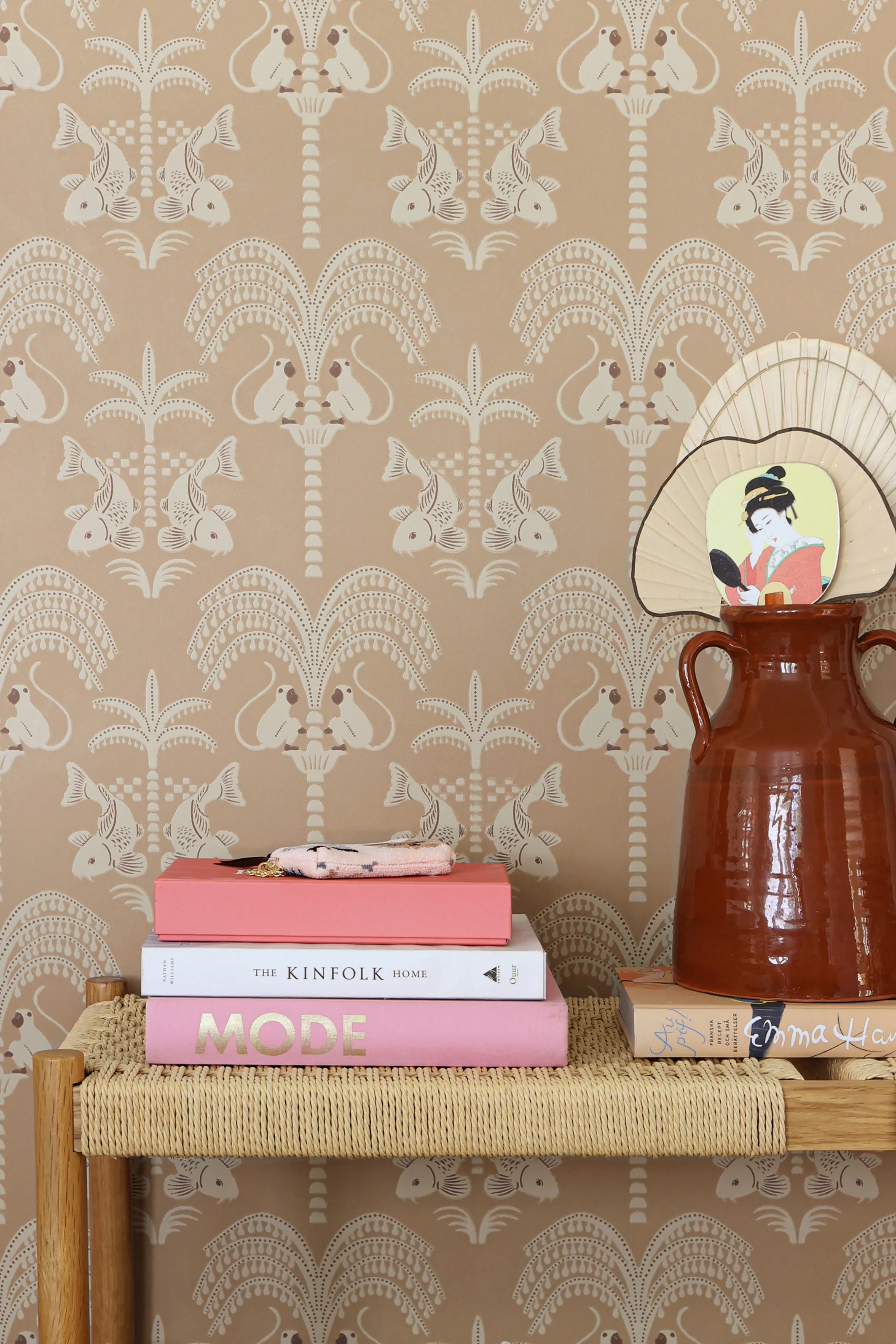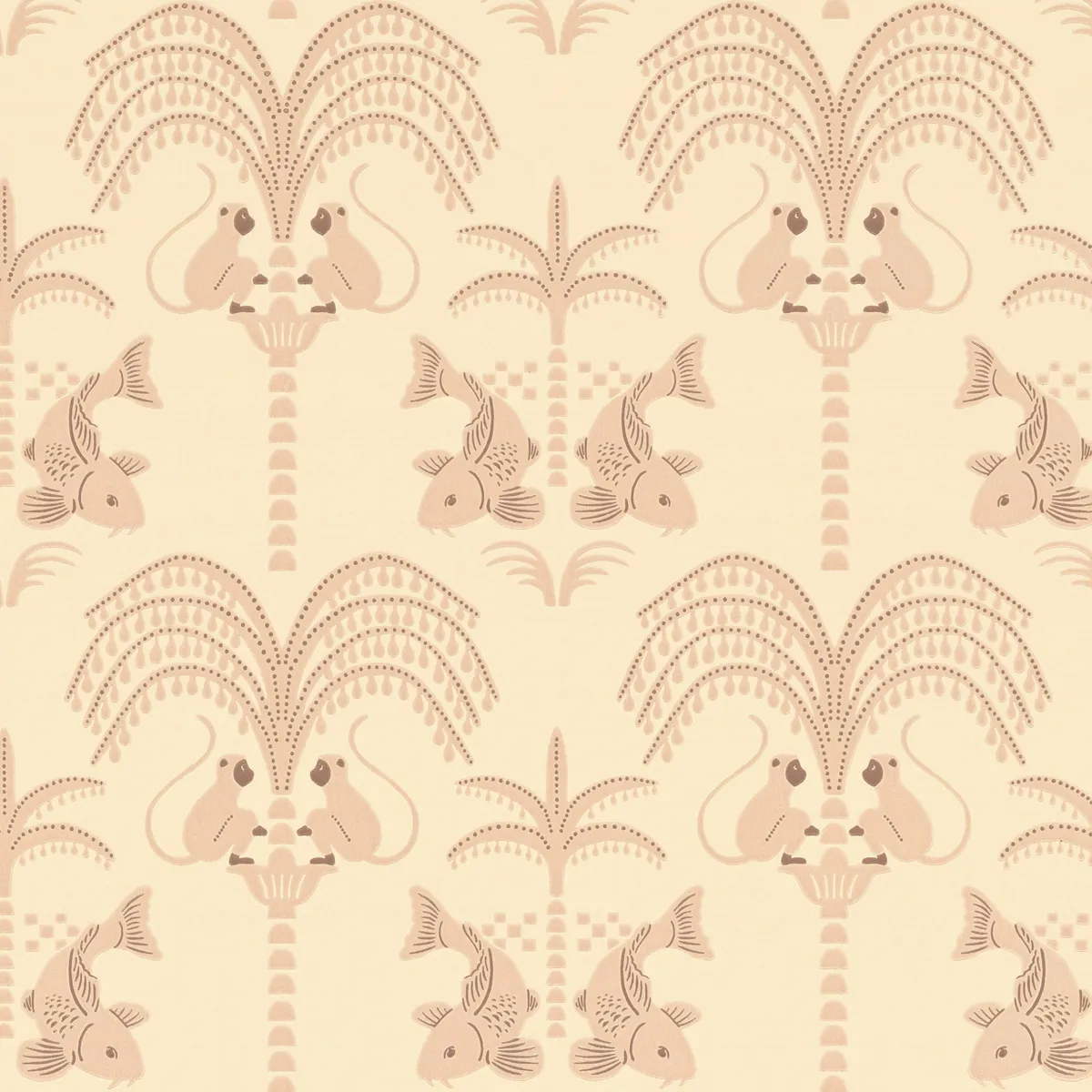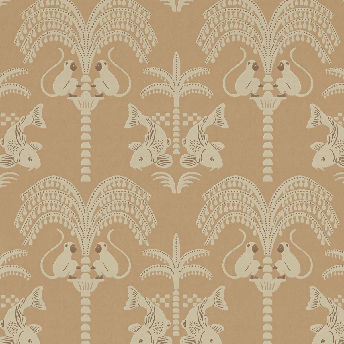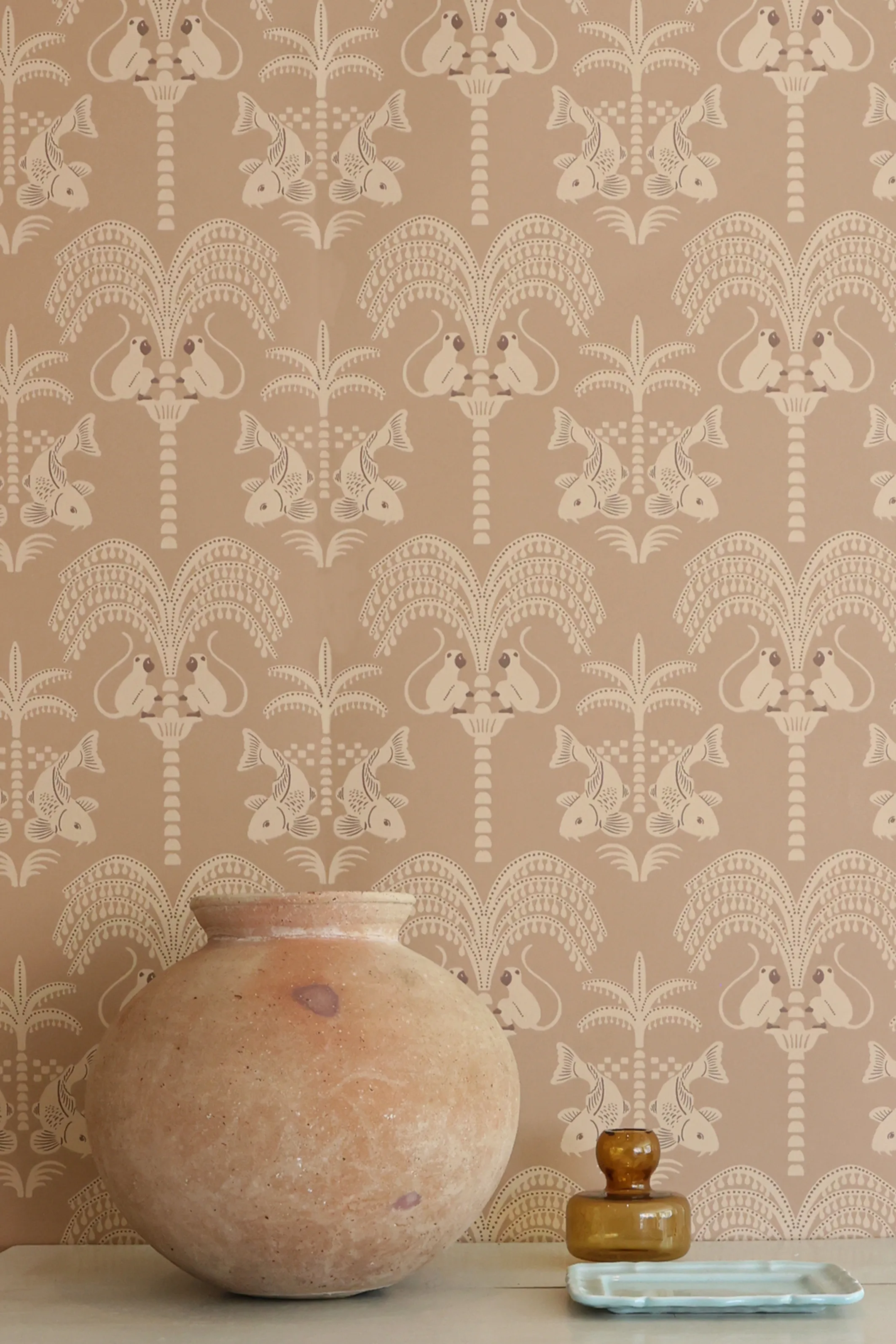 Majvillan’s Sunset Gold wallpaper is a warm tribute to light, nature, and the beauty of peaceful moments. The pattern features decorative palm trees, playful monkeys, and graceful fish, all arranged in a balanced, storytelling rhythm that evokes a sense of calm joy.