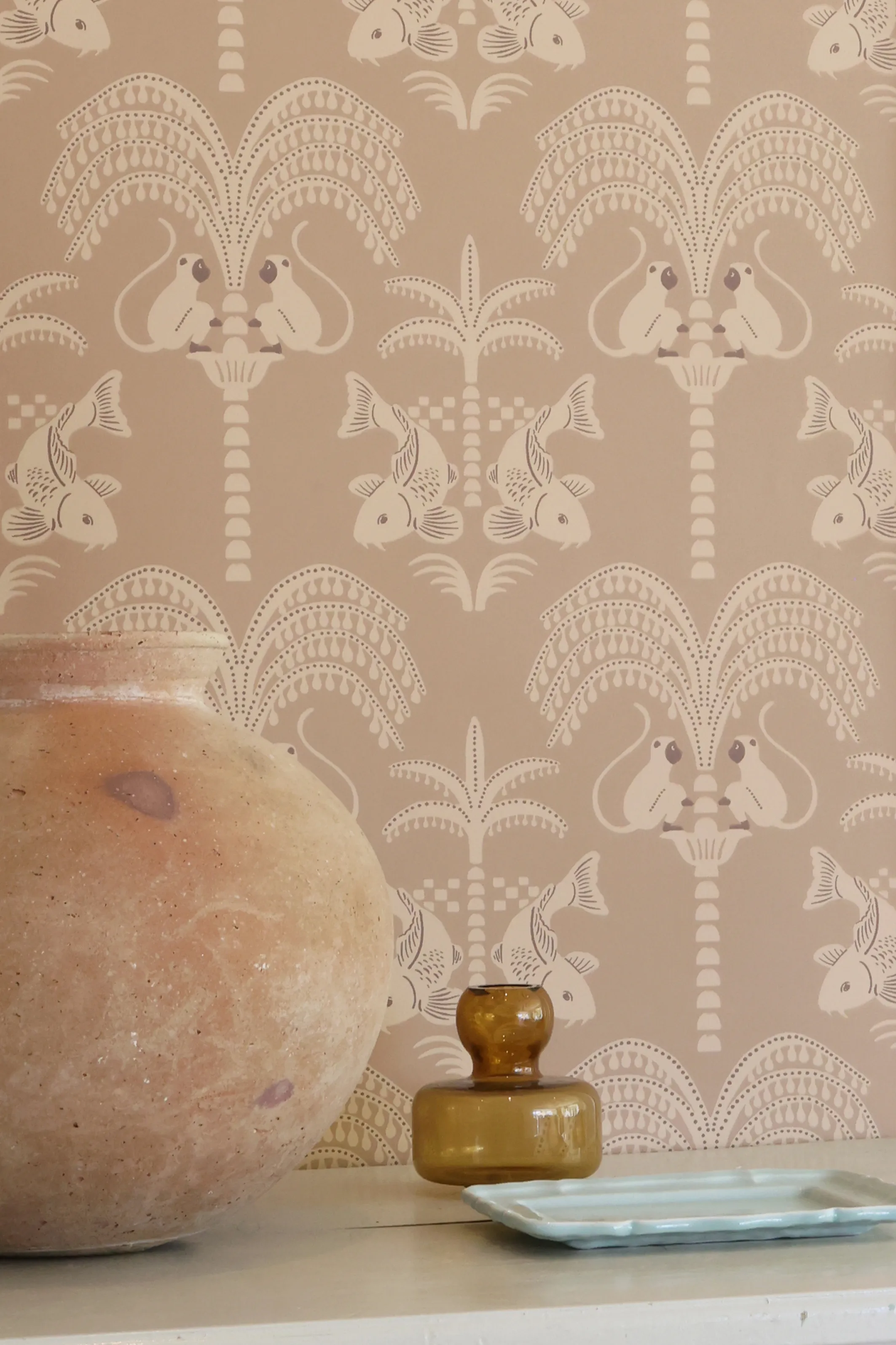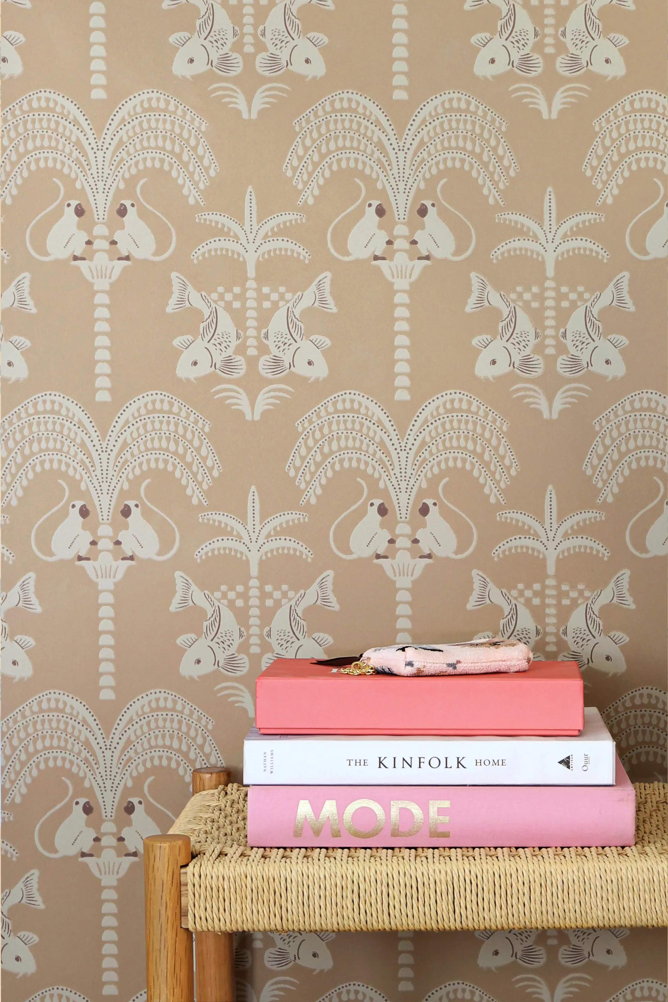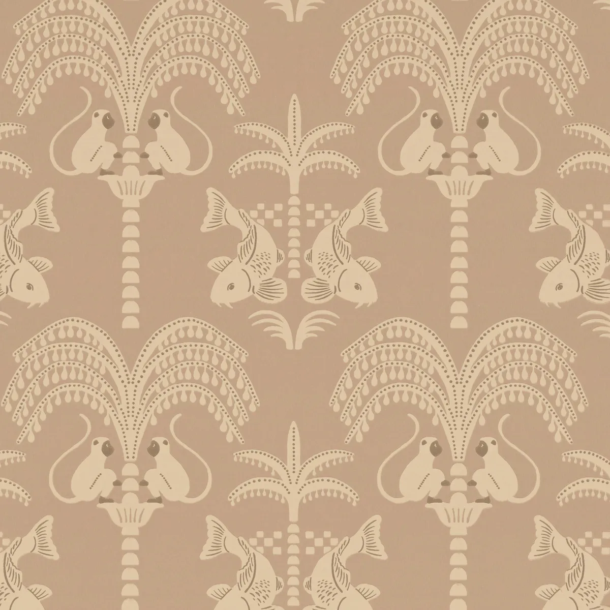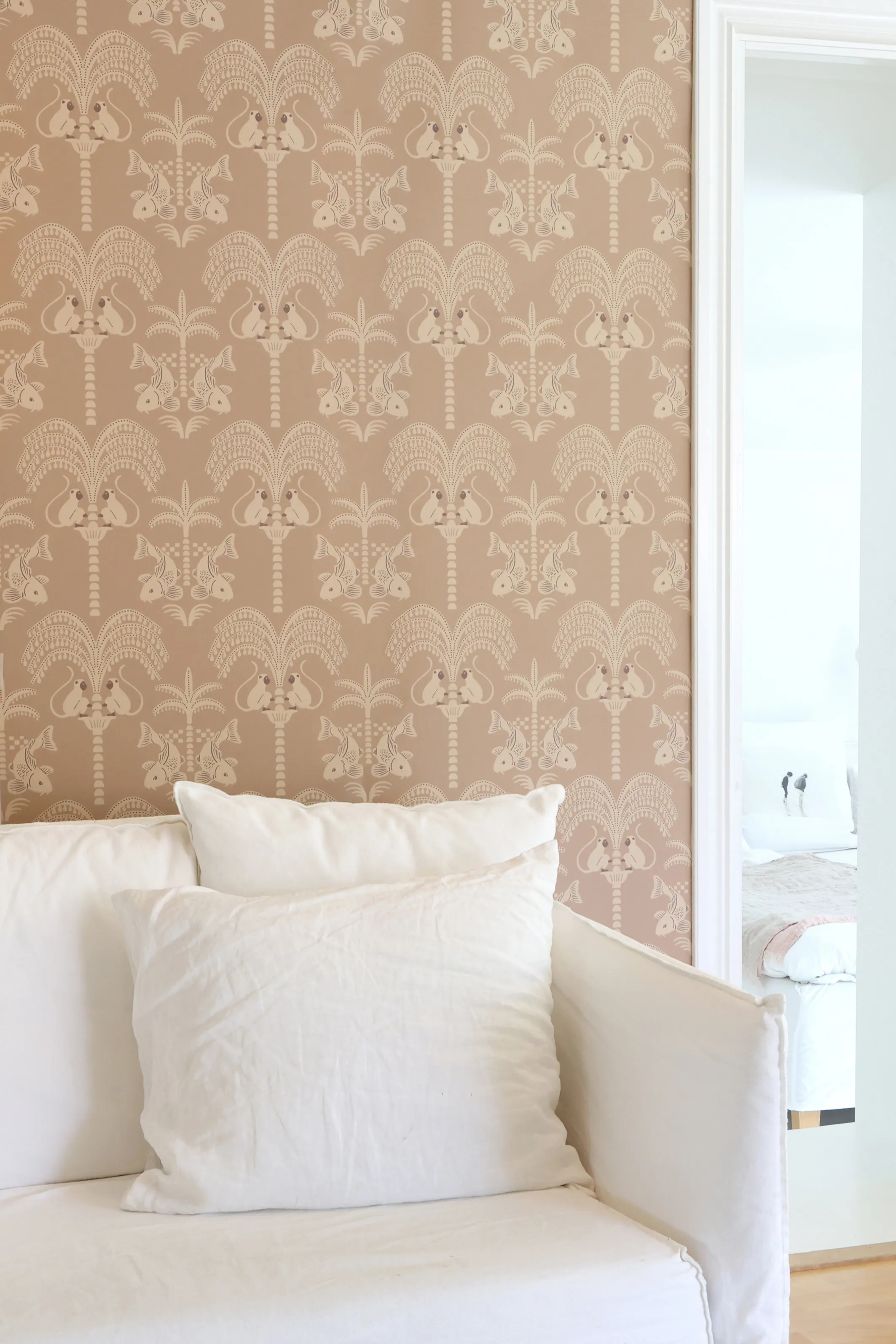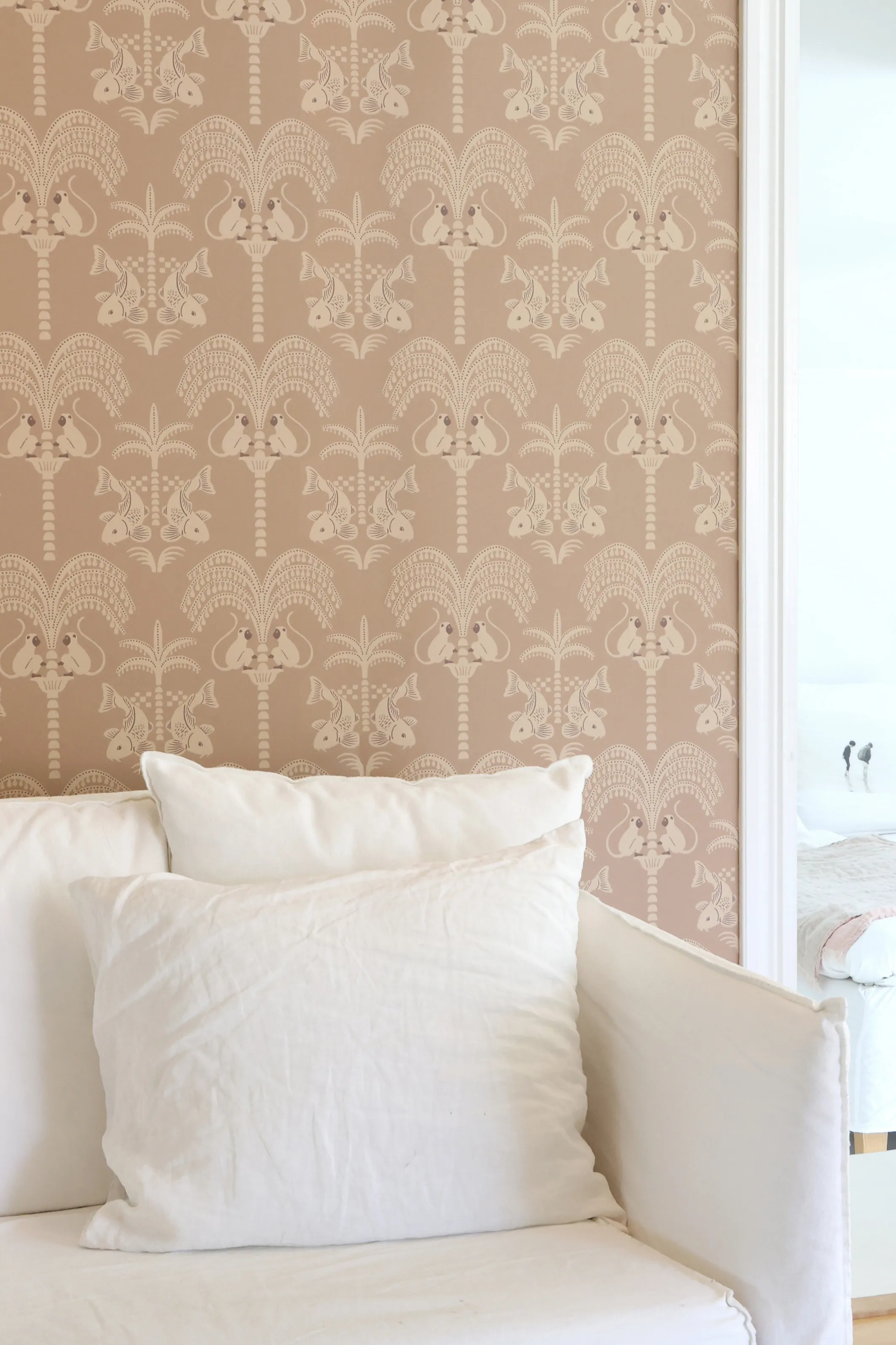 Majvillan’s Sunset Gold wallpaper is a warm tribute to light, nature, and the beauty of peaceful moments. The pattern features decorative palm trees, playful monkeys, and graceful fish, all arranged in a balanced, storytelling rhythm that evokes a sense of calm joy.