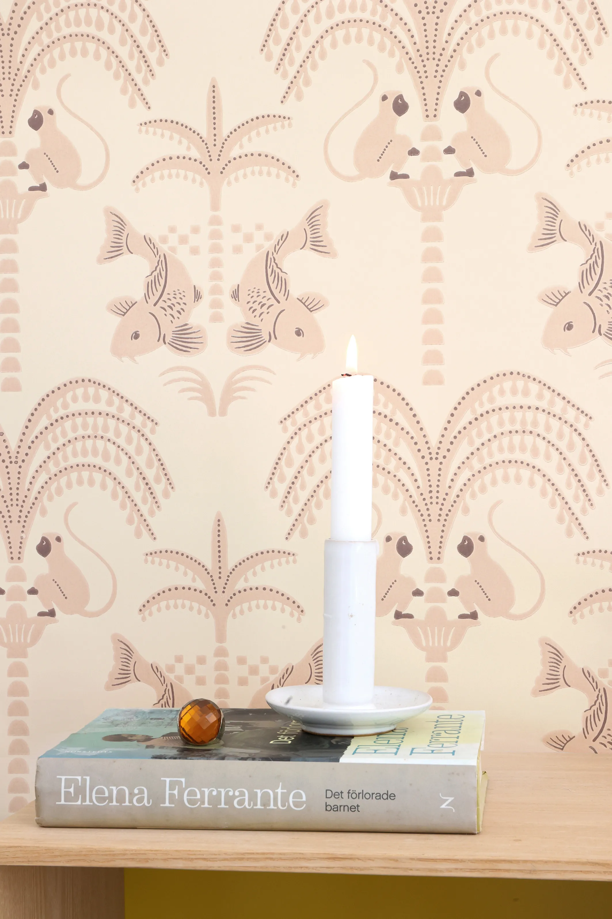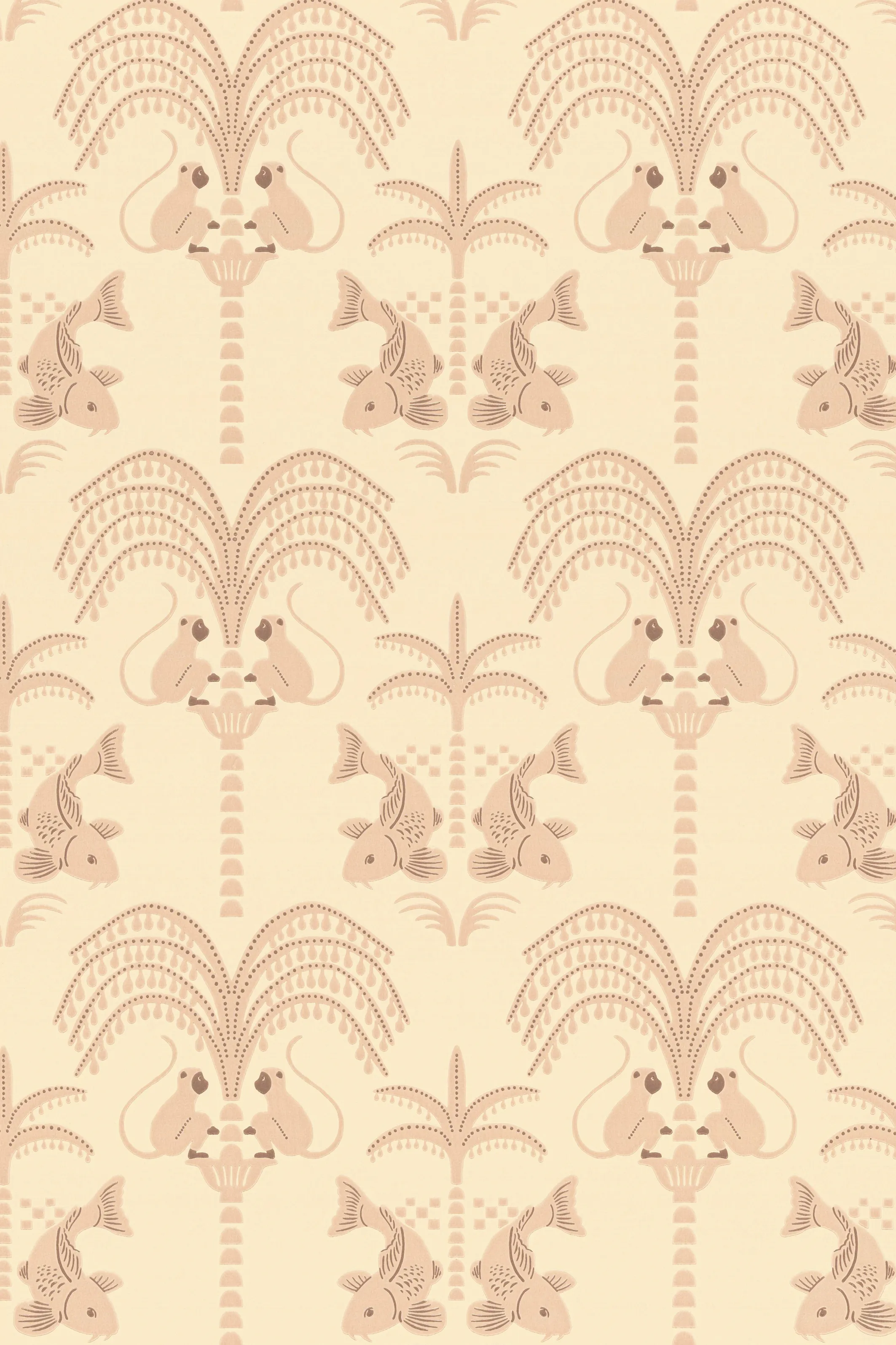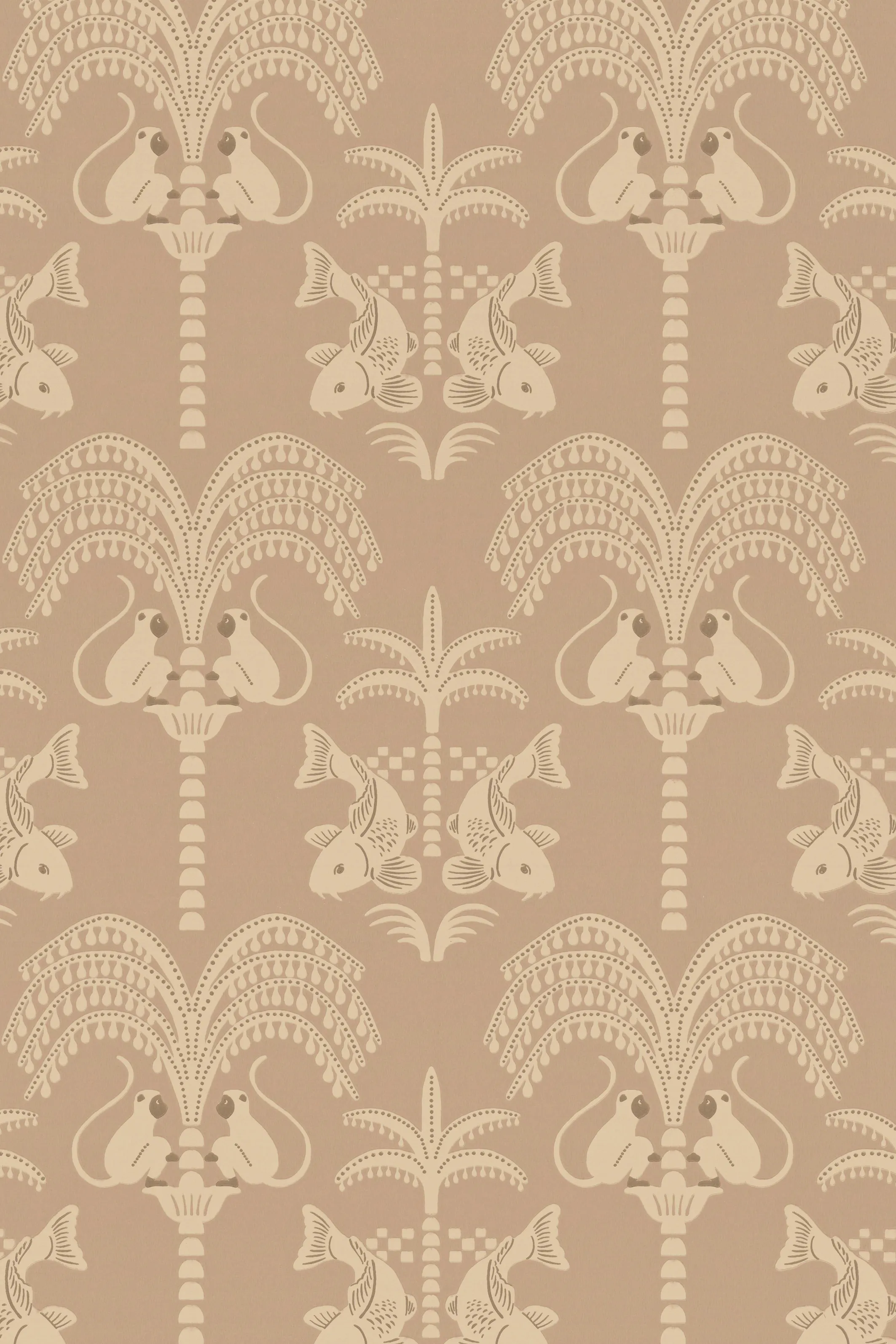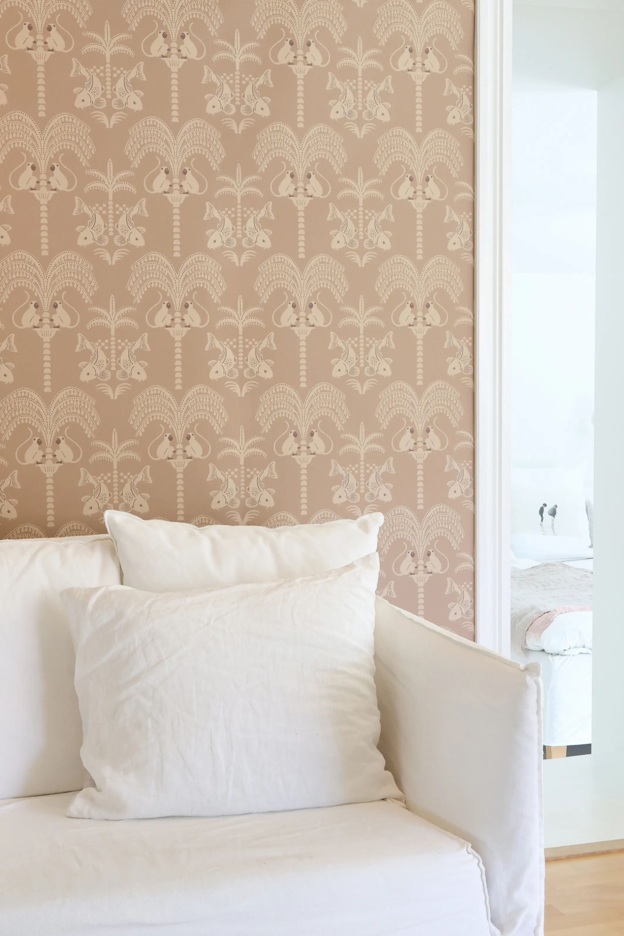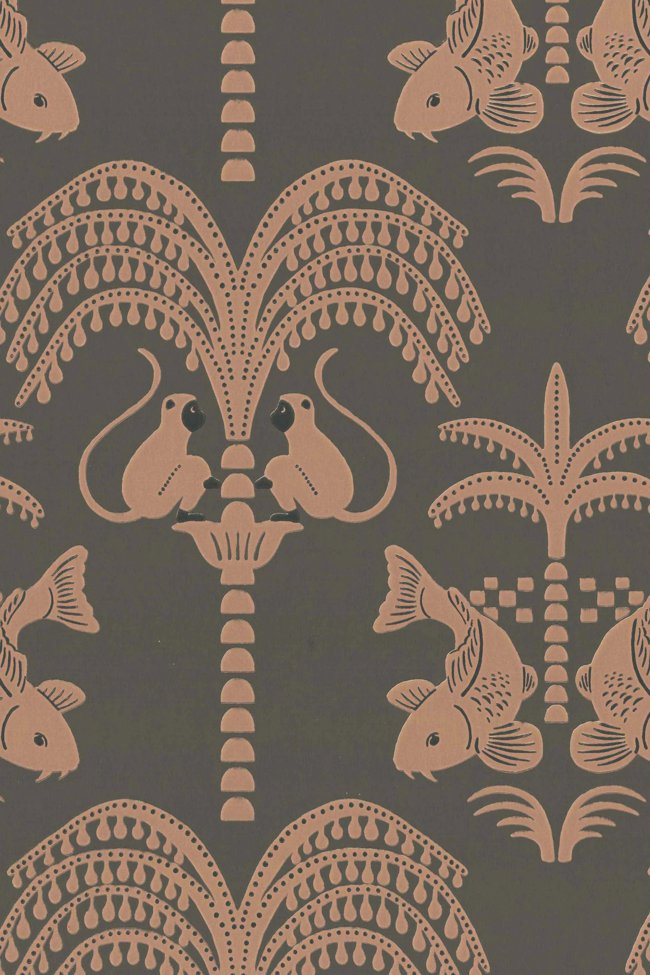 Majvillan’s Sunset Gold wallpaper is a warm tribute to light, nature, and the beauty of peaceful moments. The pattern features decorative palm trees, playful monkeys, and graceful fish, all arranged in a balanced, storytelling rhythm that evokes a sense of calm joy.