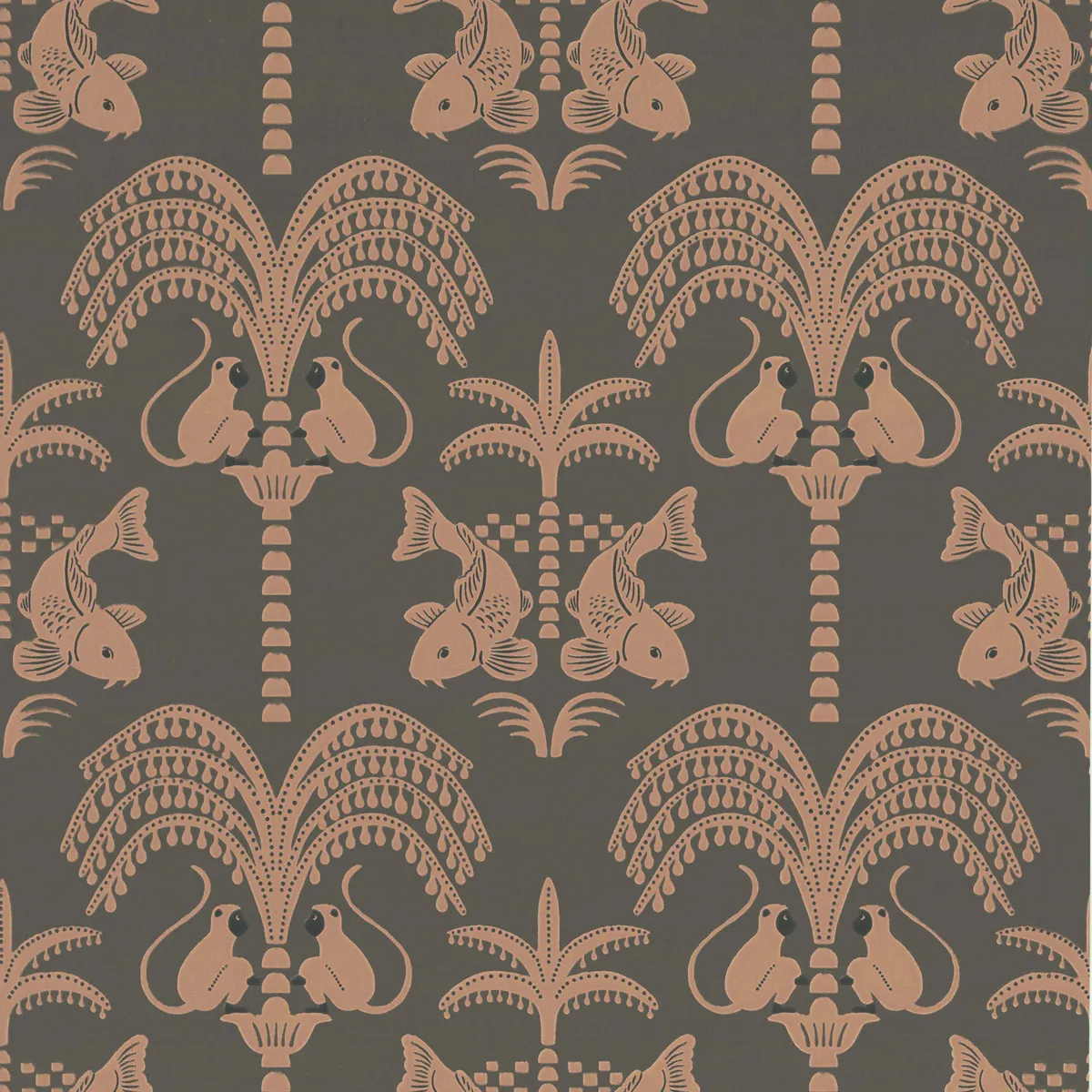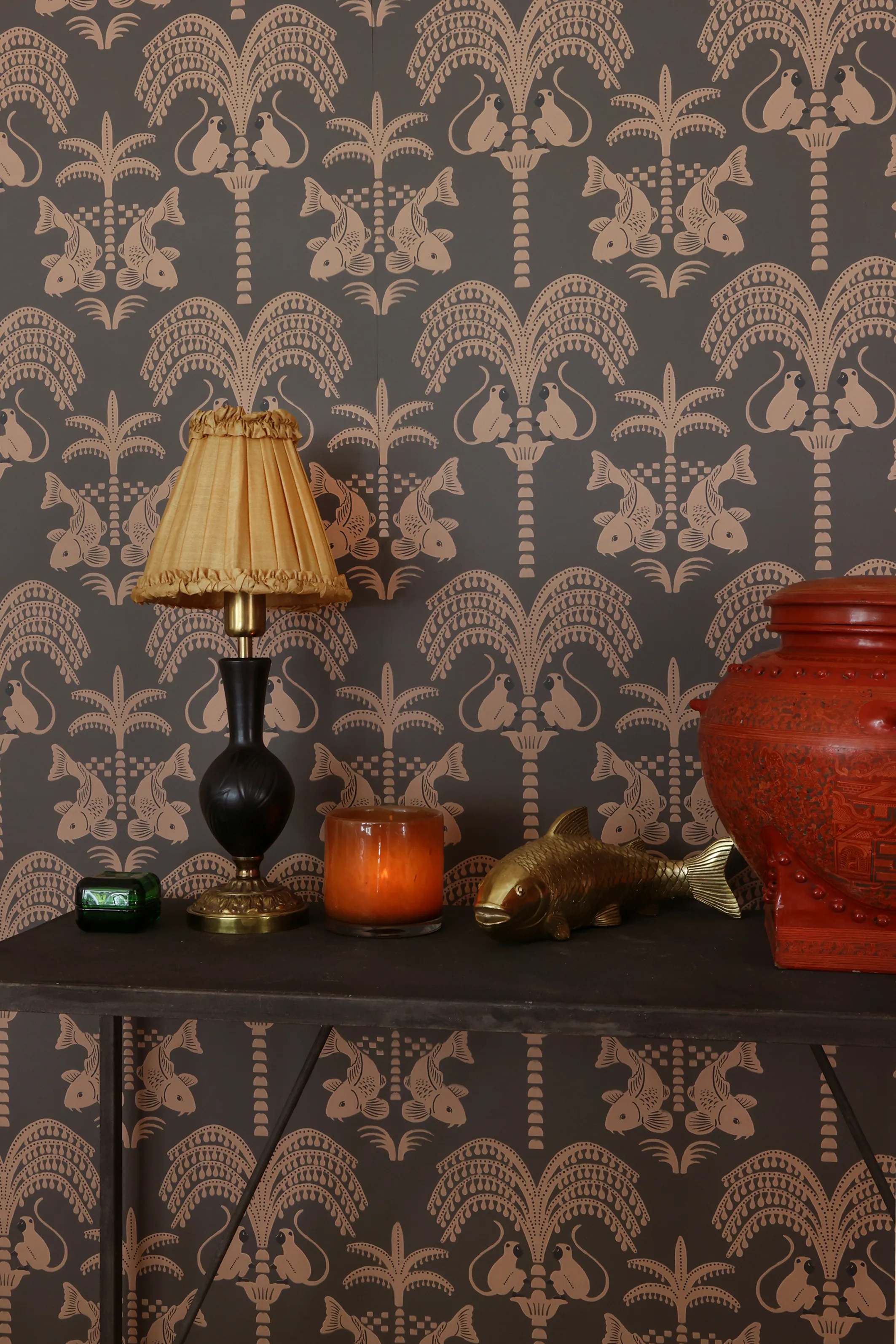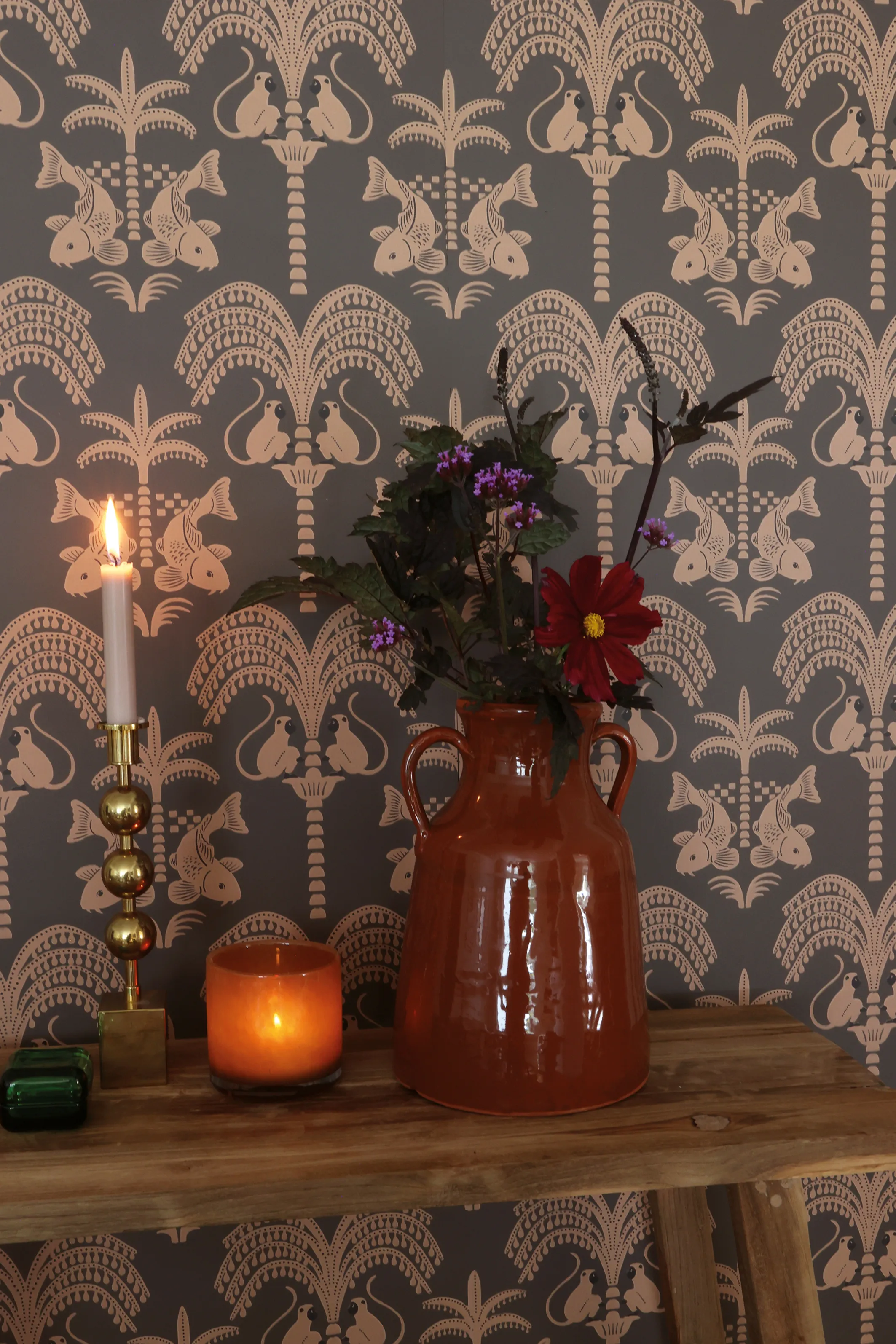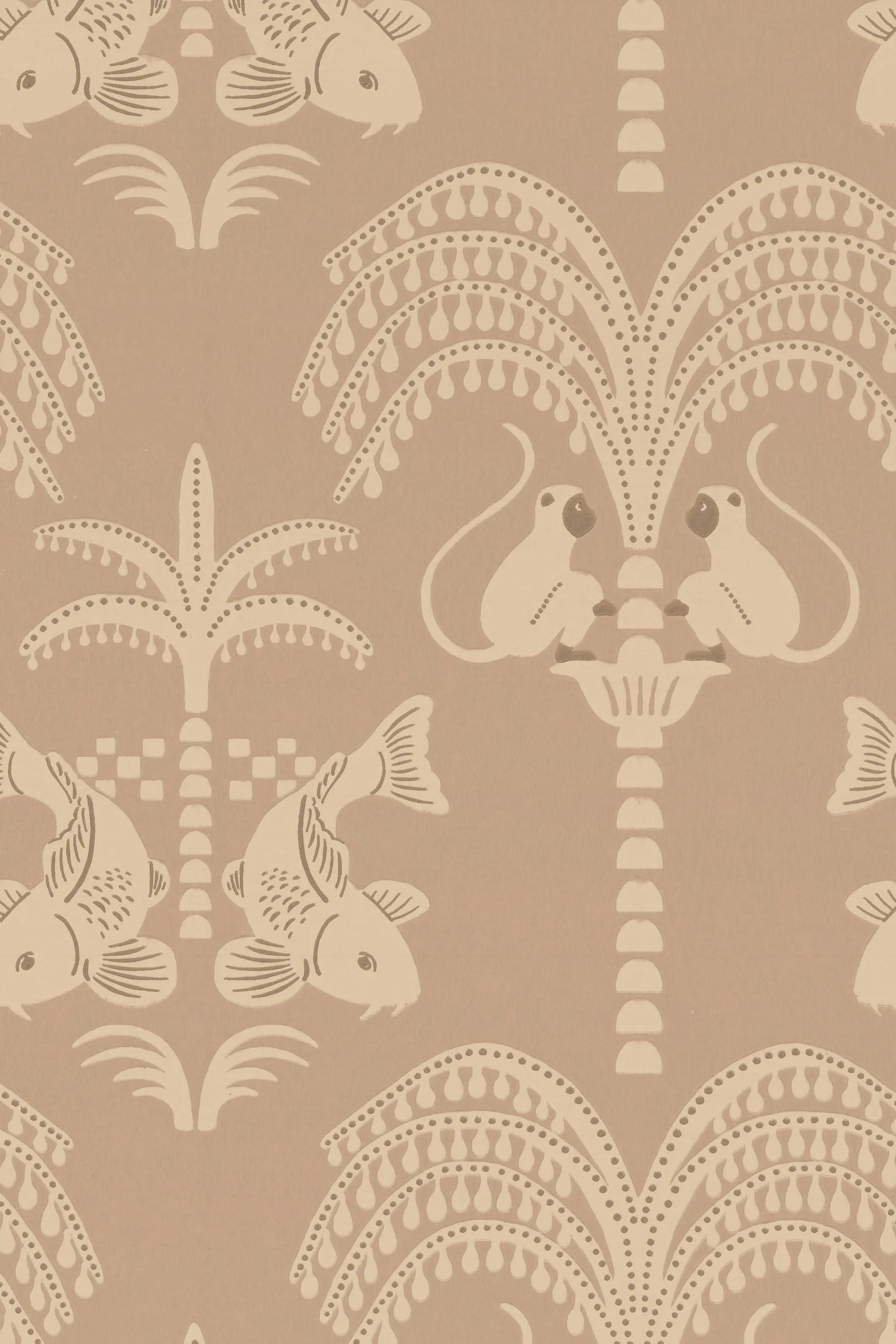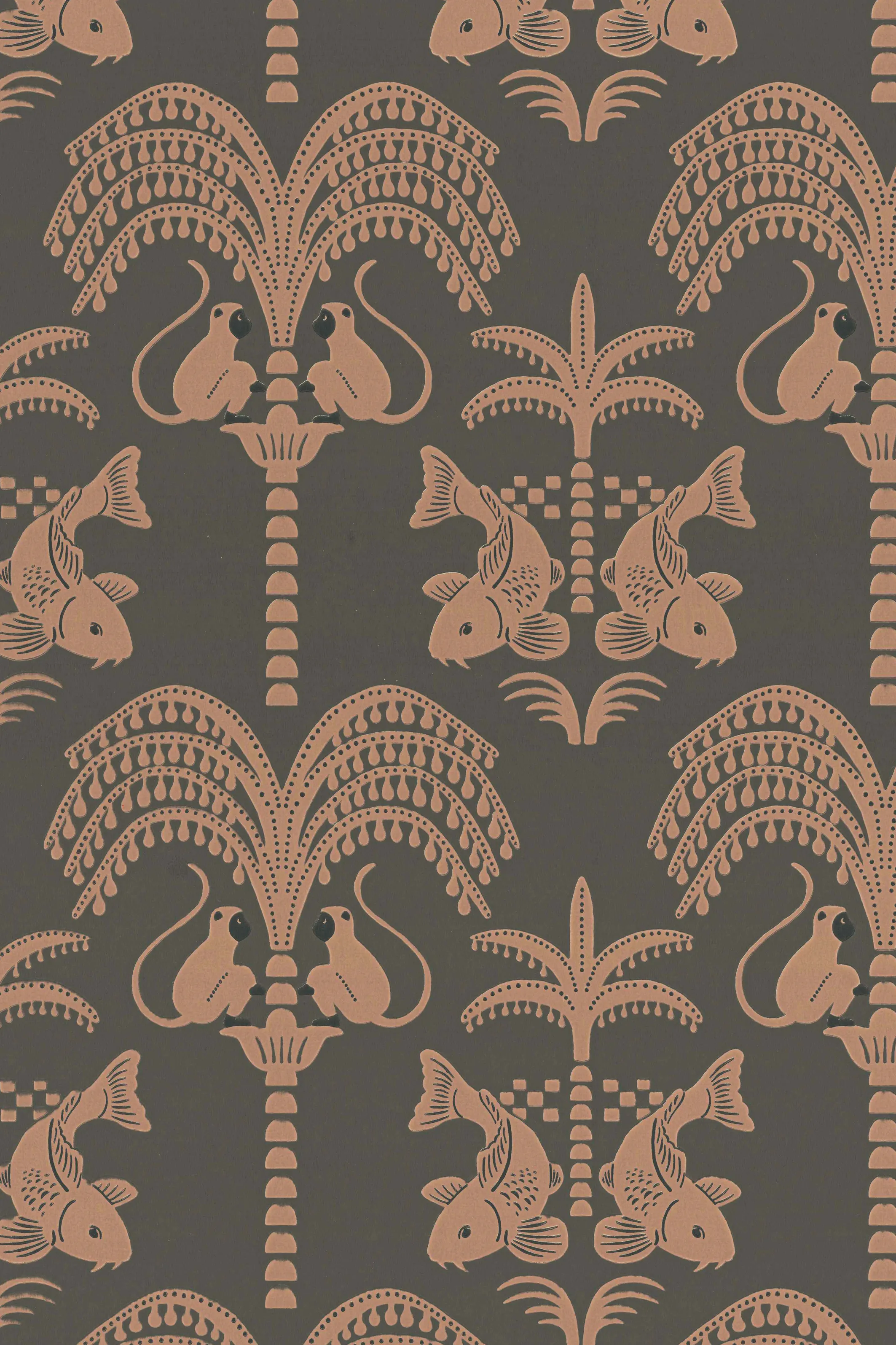 Majvillan’s Sunset Gold wallpaper is a warm tribute to light, nature, and the beauty of peaceful moments. The pattern features decorative palm trees, playful monkeys, and graceful fish, all arranged in a balanced, storytelling rhythm that evokes a sense of calm joy.