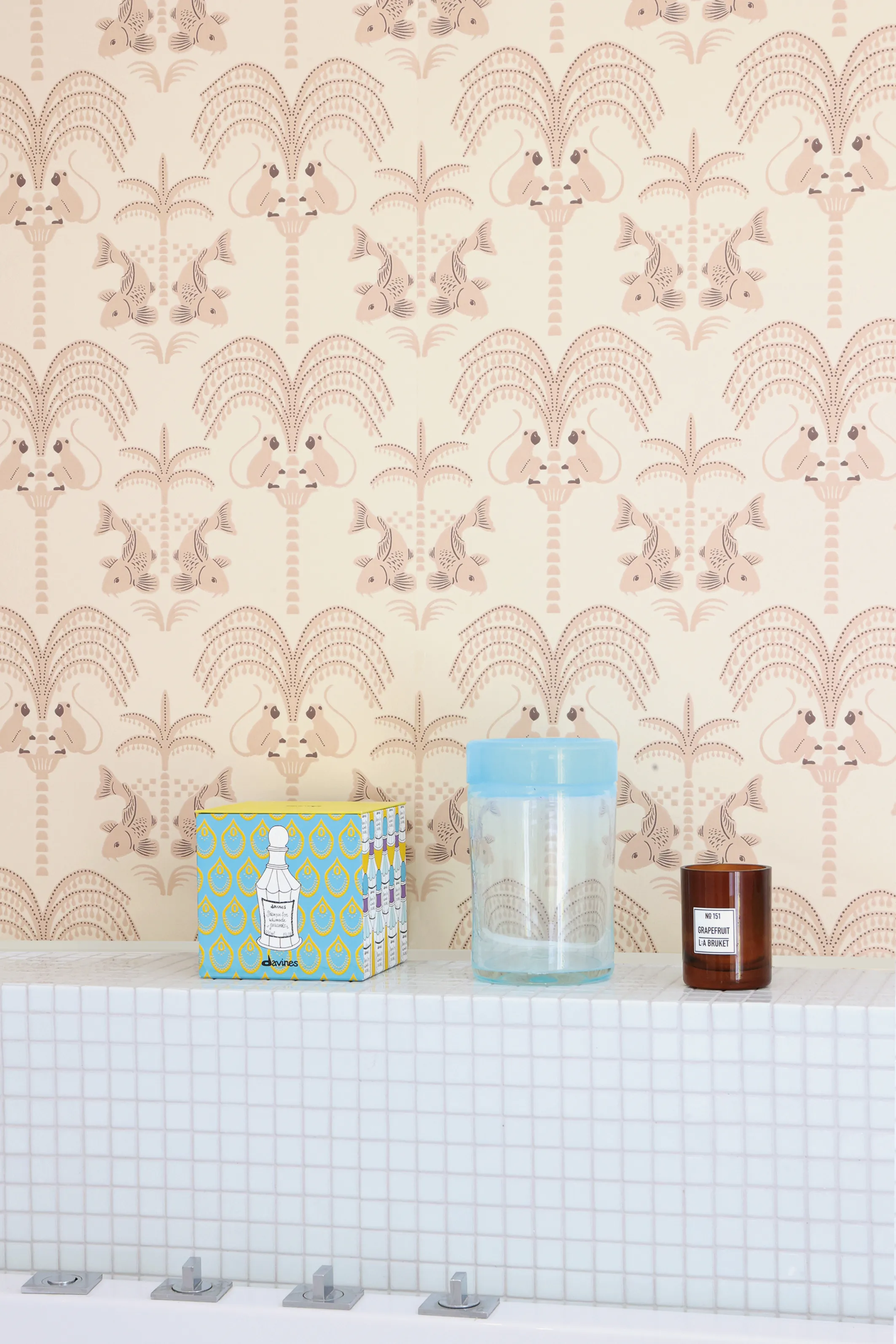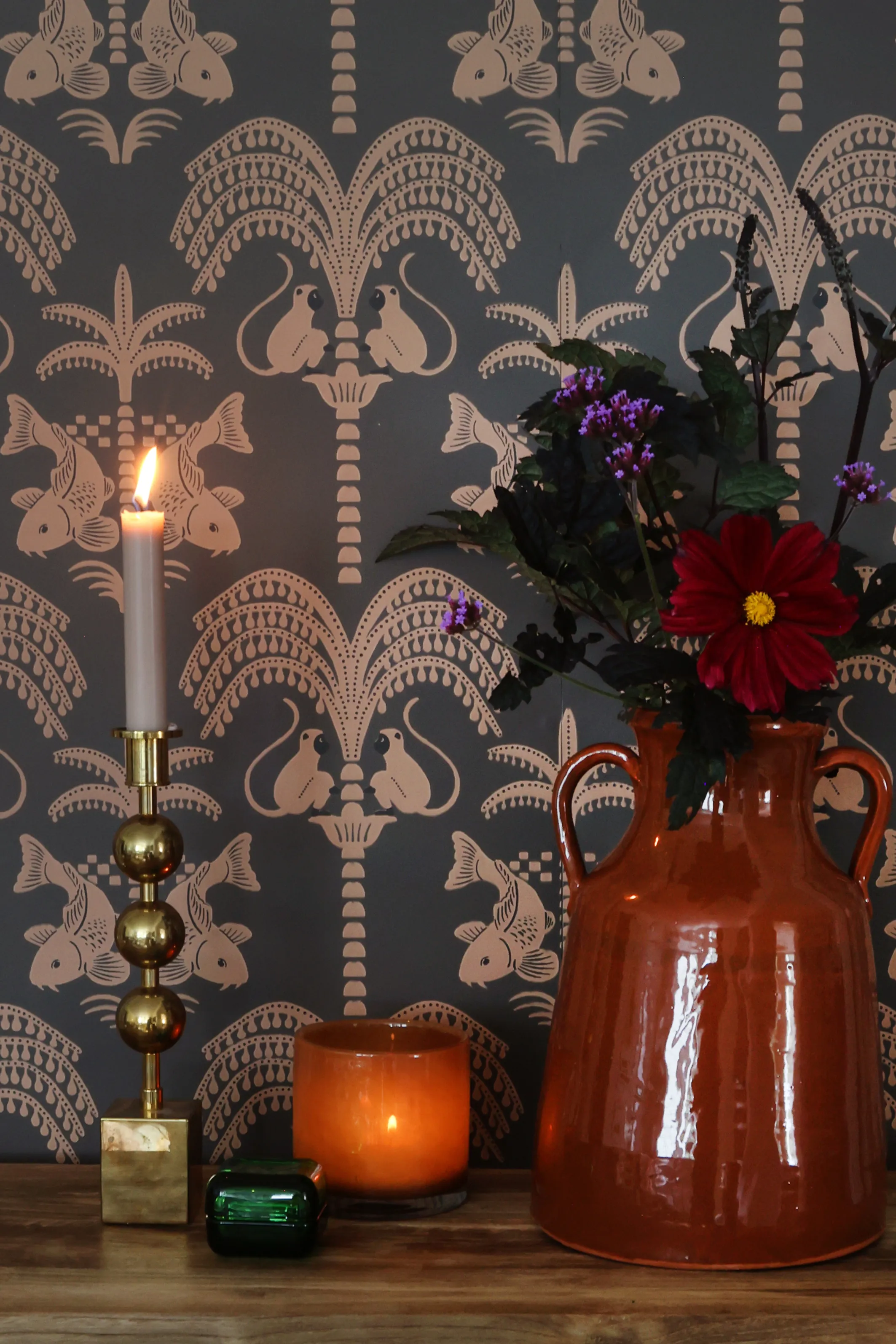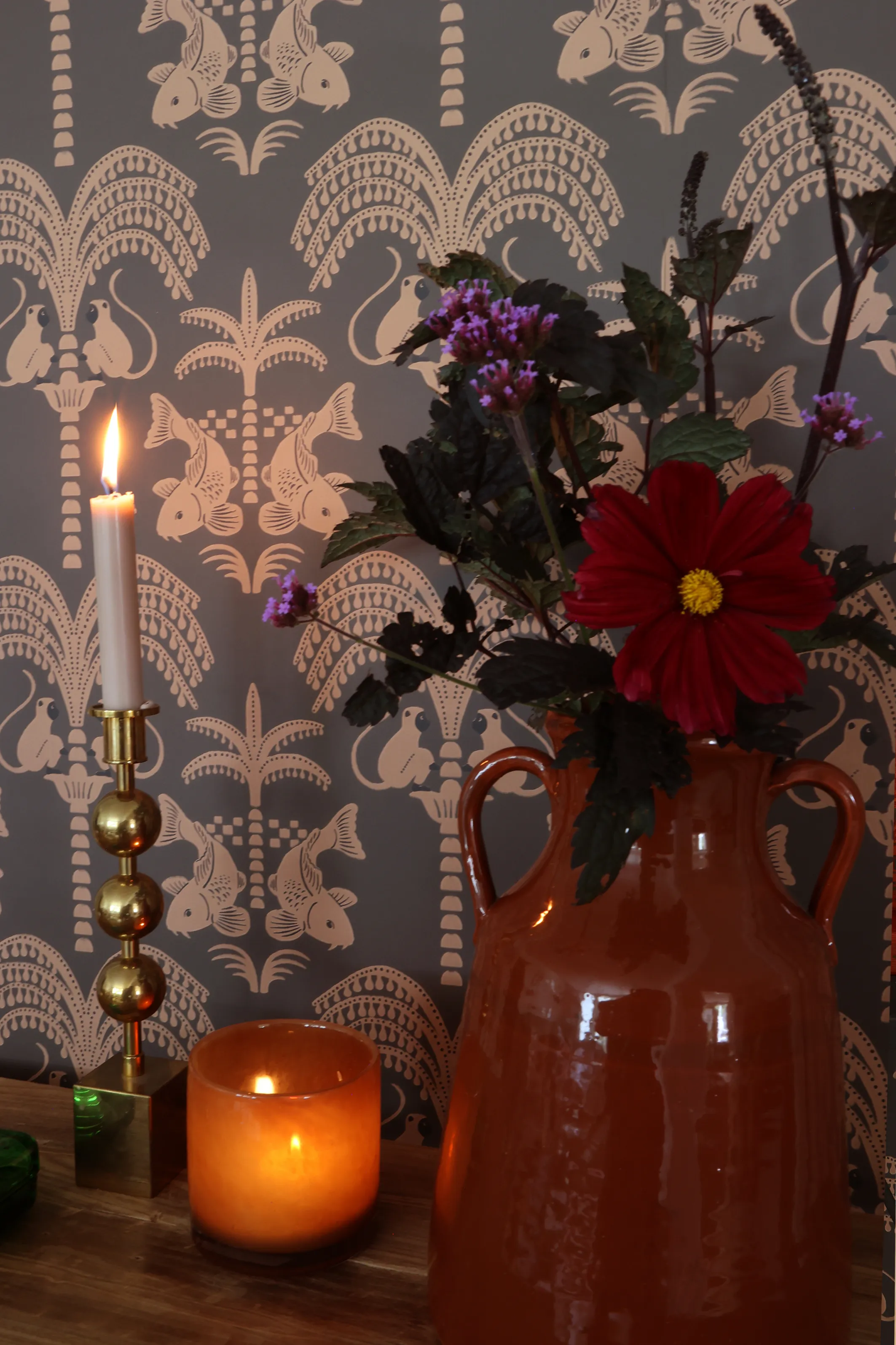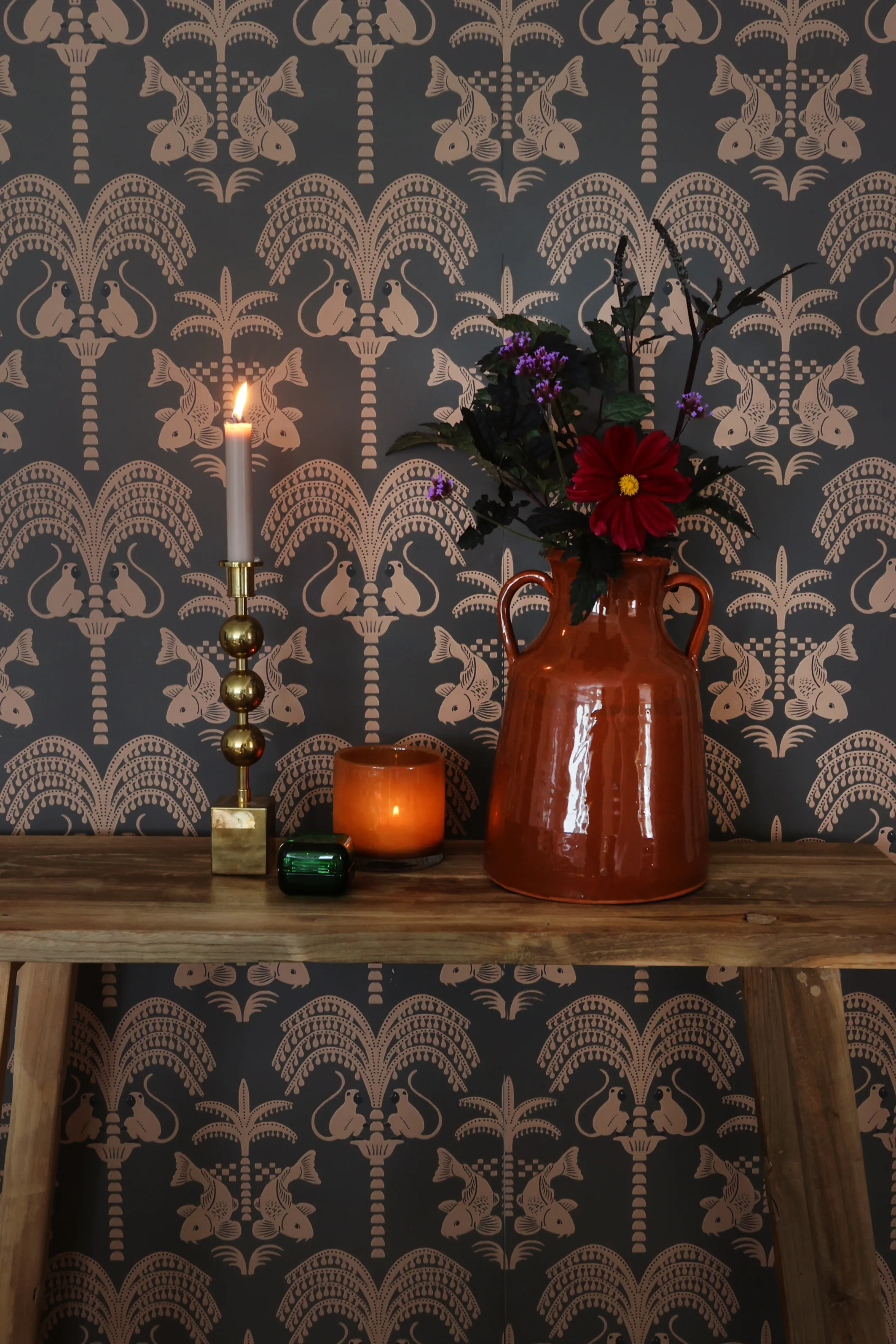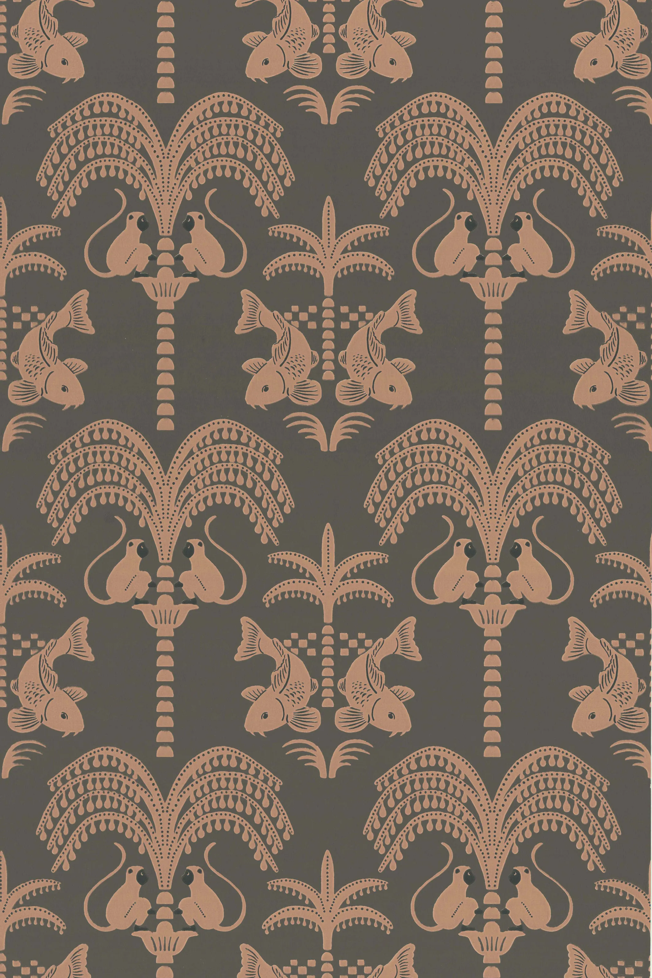 Majvillan’s Sunset Gold wallpaper is a warm tribute to light, nature, and the beauty of peaceful moments. The pattern features decorative palm trees, playful monkeys, and graceful fish, all arranged in a balanced, storytelling rhythm that evokes a sense of calm joy.