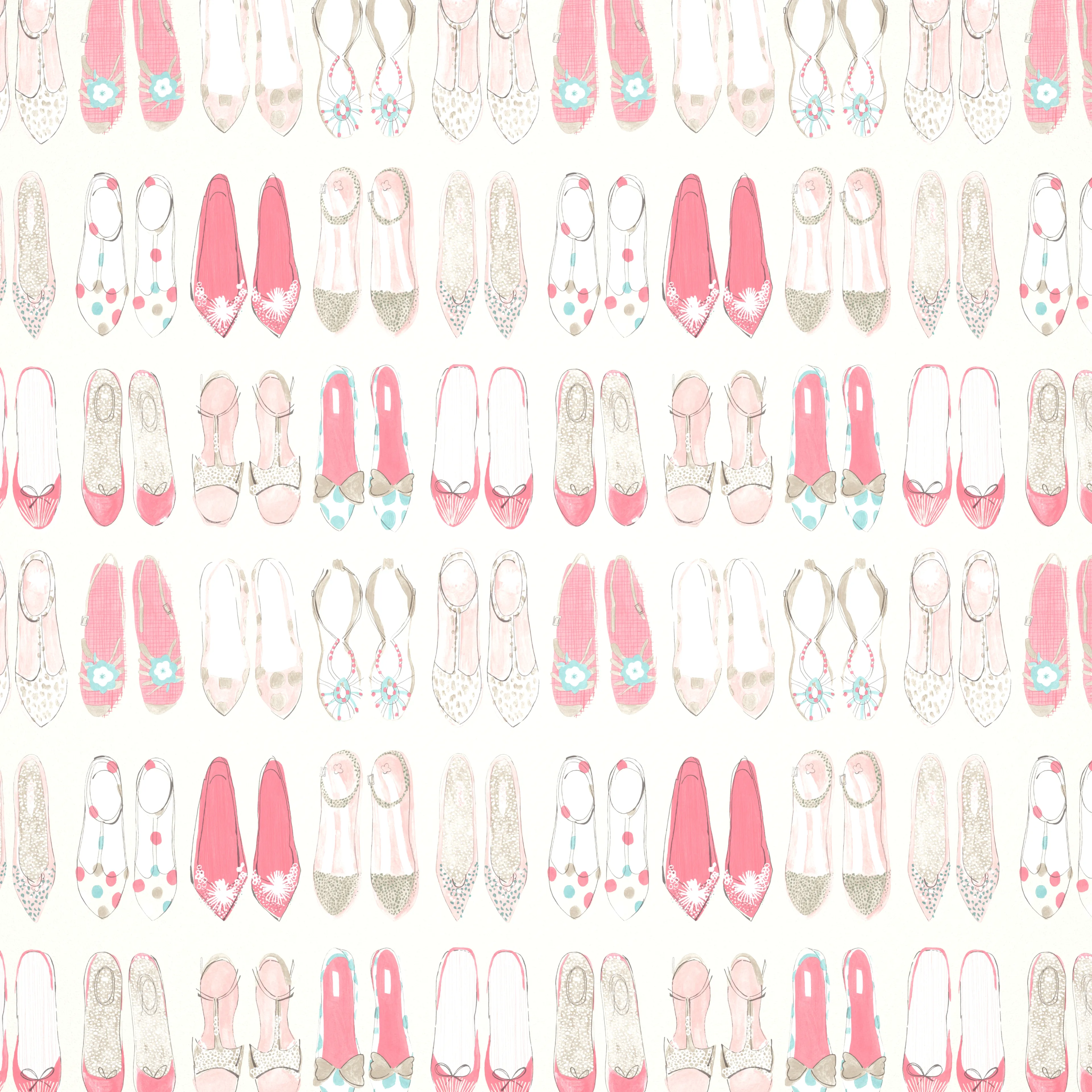 The children's wallpaper World at Your Feet with pink shoes with different patterns is a playful wallpaper for the children's room or maybe the big closet? Which shoes will you take today?
