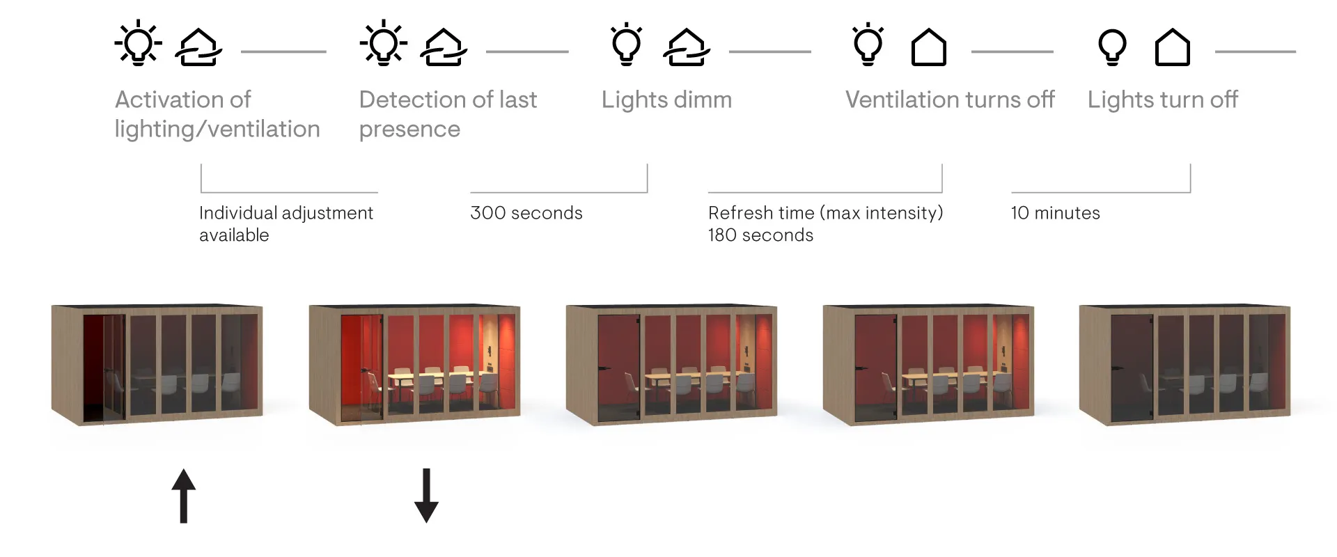 Tack vare SILENT ROOMs specialdesign garanteras rätt nivå av ljudabsorption, vilket blockerar både inkommande och utgående ljud. De interna akustikväggarna är skapade för att eliminera eko i rummet, vilket skapar en mysig atmosfär. Rummet är utrustat med fyra kraftfulla men tysta fläktar som kombinerat med tre LED-lampor skapar en varm och inbjudande känsla där du kan utföra uppgifter som kräver hög koncentration. Den intelligenta kontrollenheten anpassar ventilation och belysning efter dina behov, och aktiverar kraftigare ventilation när en användare lämnar rummet, allt för att förbereda för nästa användare. För en förstärkt tyst miljö är modeller med klädda ytterpaneler designade för att ytterligare dämpa ljud, vilket förbättrar akustiken i hela kontorsutrymmet.