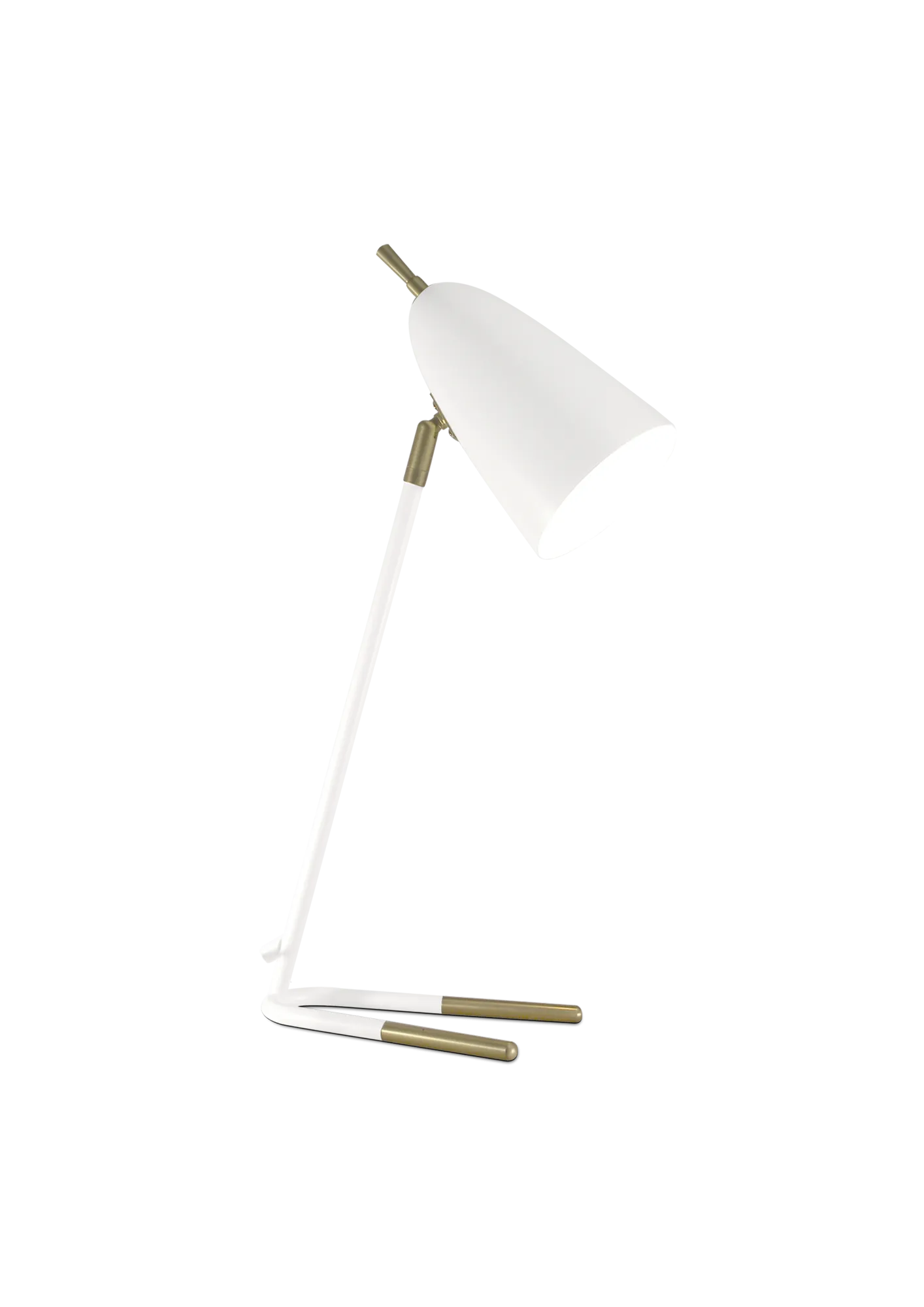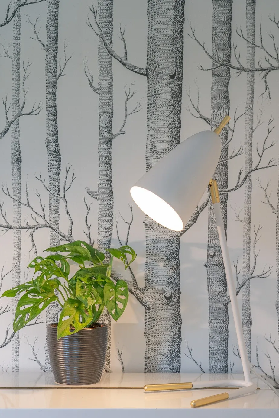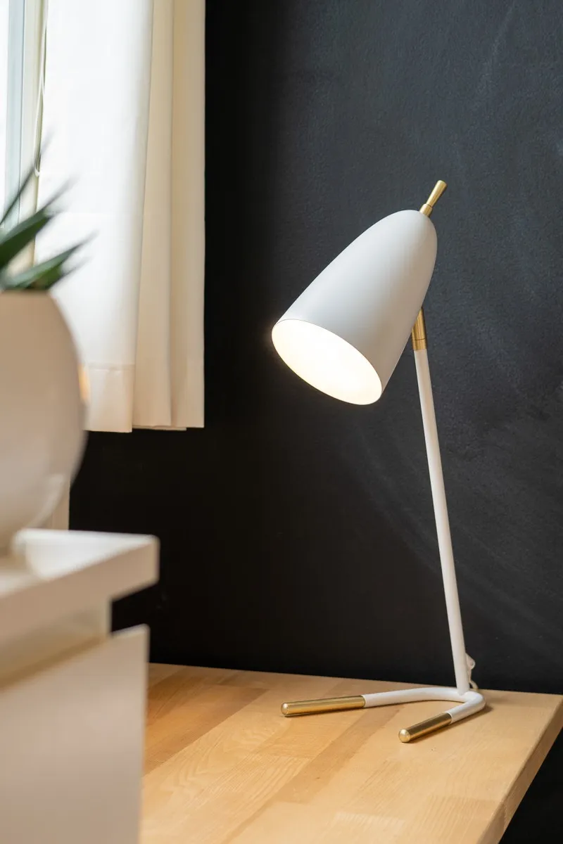 Aiden modern bordslampa från Sessak. Den vackra bordslampan finns i svart eller vitt med mässingsdetaljer.