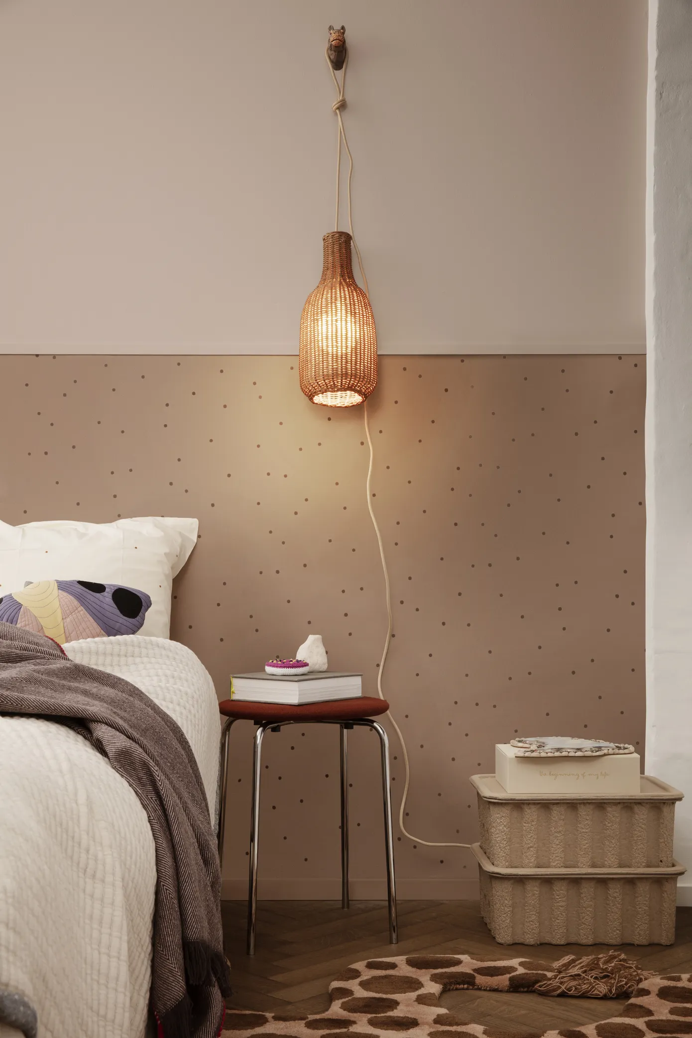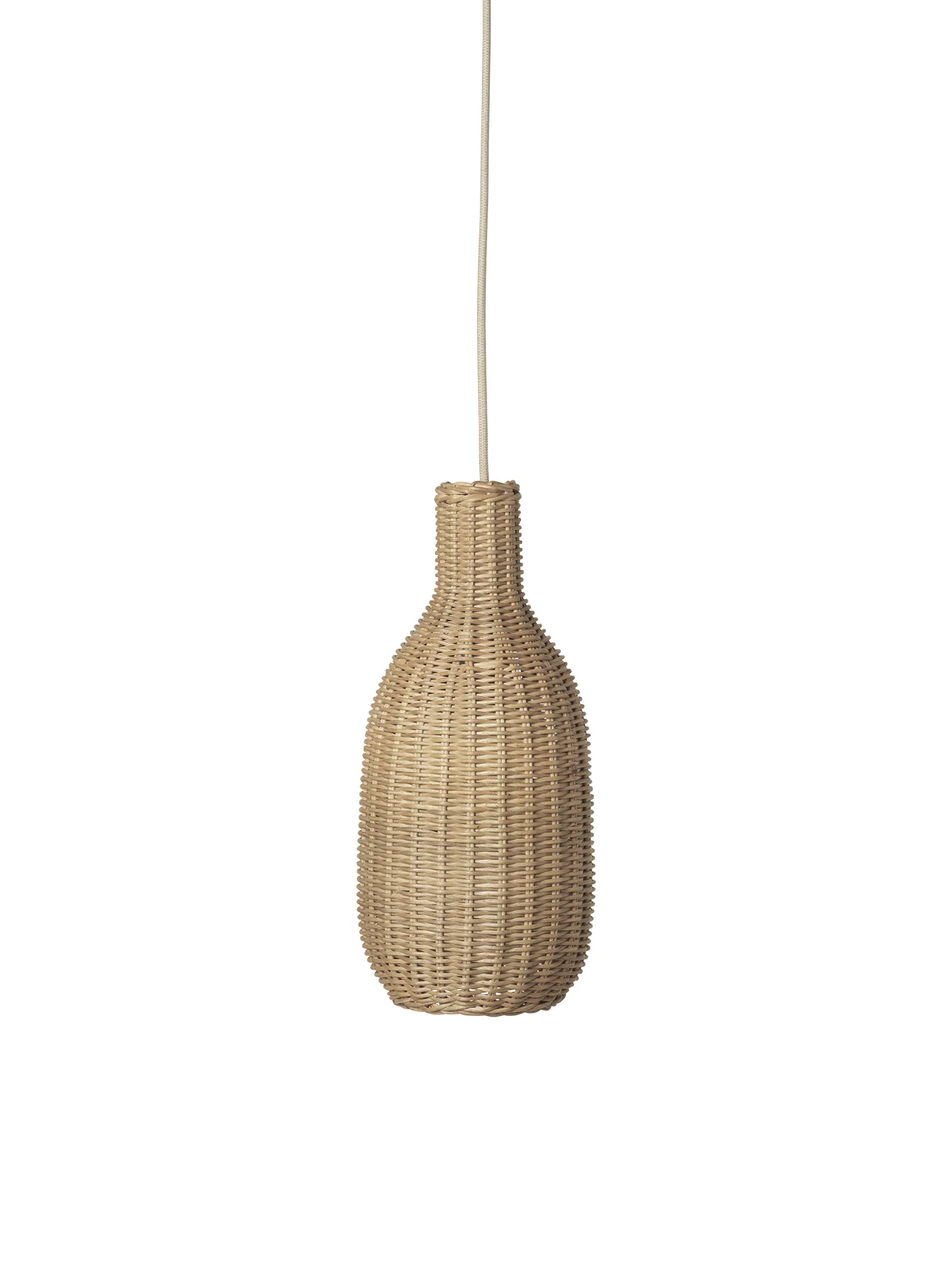 Ferm Living Braided Bottle är en vacker taklampa i rotting som passar såväl i vardagsrum som i barnrum. Den flätade lampskärmen ger vackra ljusmönster på väggen. Köp sladd och stöpsel skilt, Fabric Cord Set passar bra till den här lampan.