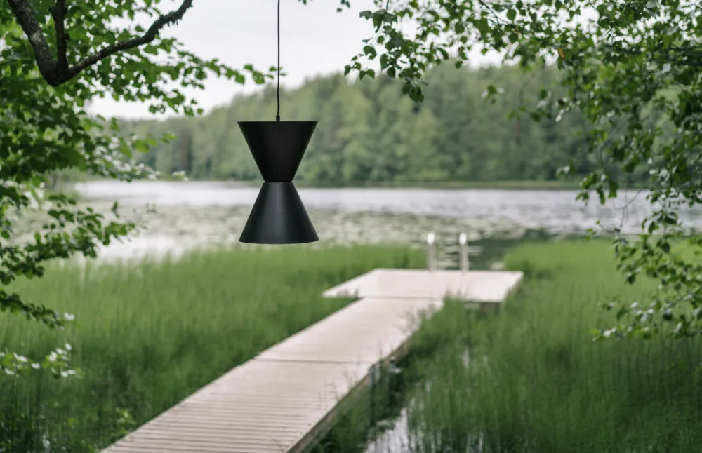 Taklampan Länsi från Sessak är både modern och tidlös. Den dekorativa taklampan släpper igenom ljus både uppåt och nedåt. Lampan har designats av Matti Syrjälä.