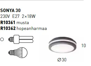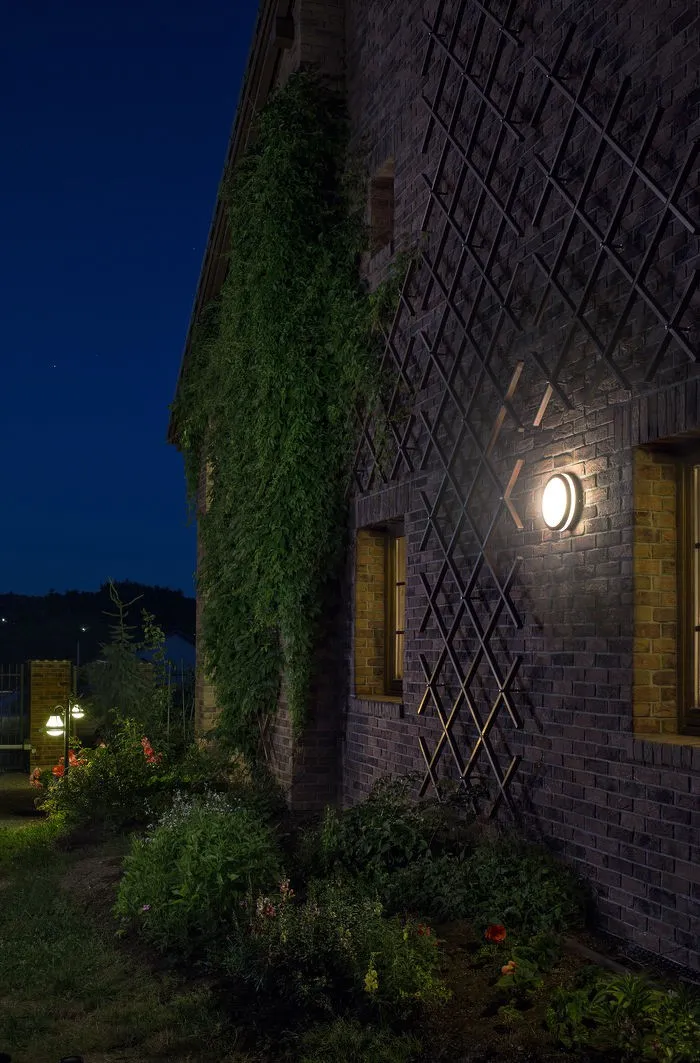 En lampa gjord av aluminium för utomhusbruk. Lampan har en opalisk kupa av polykarbonat. Lampan kan fästas i taket eller på väggen.