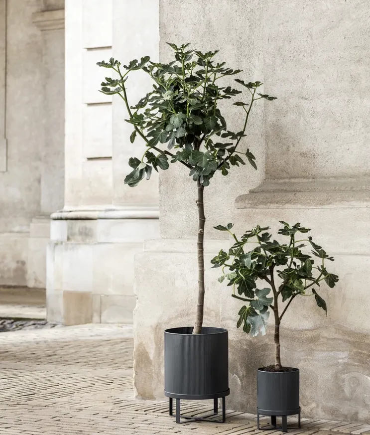 Ferm Living stora kruka Bau Pot Large är snygg och stilren. Krukan, som står på en ställning, har dräneringshål i botten. Den kan användas också inomhus men då som täckande ytterkruka eller snygg förvaring.