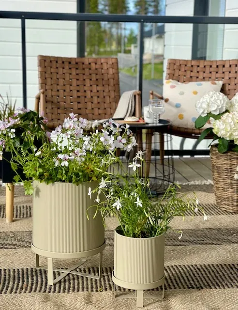 Ferm Living lilla kruka Bau Pot Small är snygg och stilren. Krukan, som står på en ställning, har dräneringshål i botten. Den kan användas också inomhus som täckande ytterkruka eller snygg förvaring.