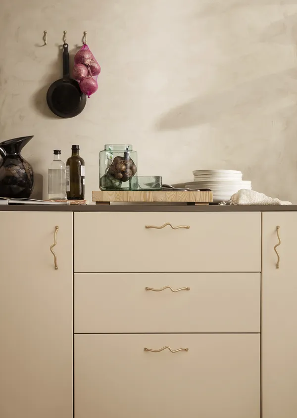 Ferm Livings snygga handtag Curvature Handle i mässing. Produkten är handgjord och unik. Passar som handtag på skåp i badrum, hall, kök eller sovrum.