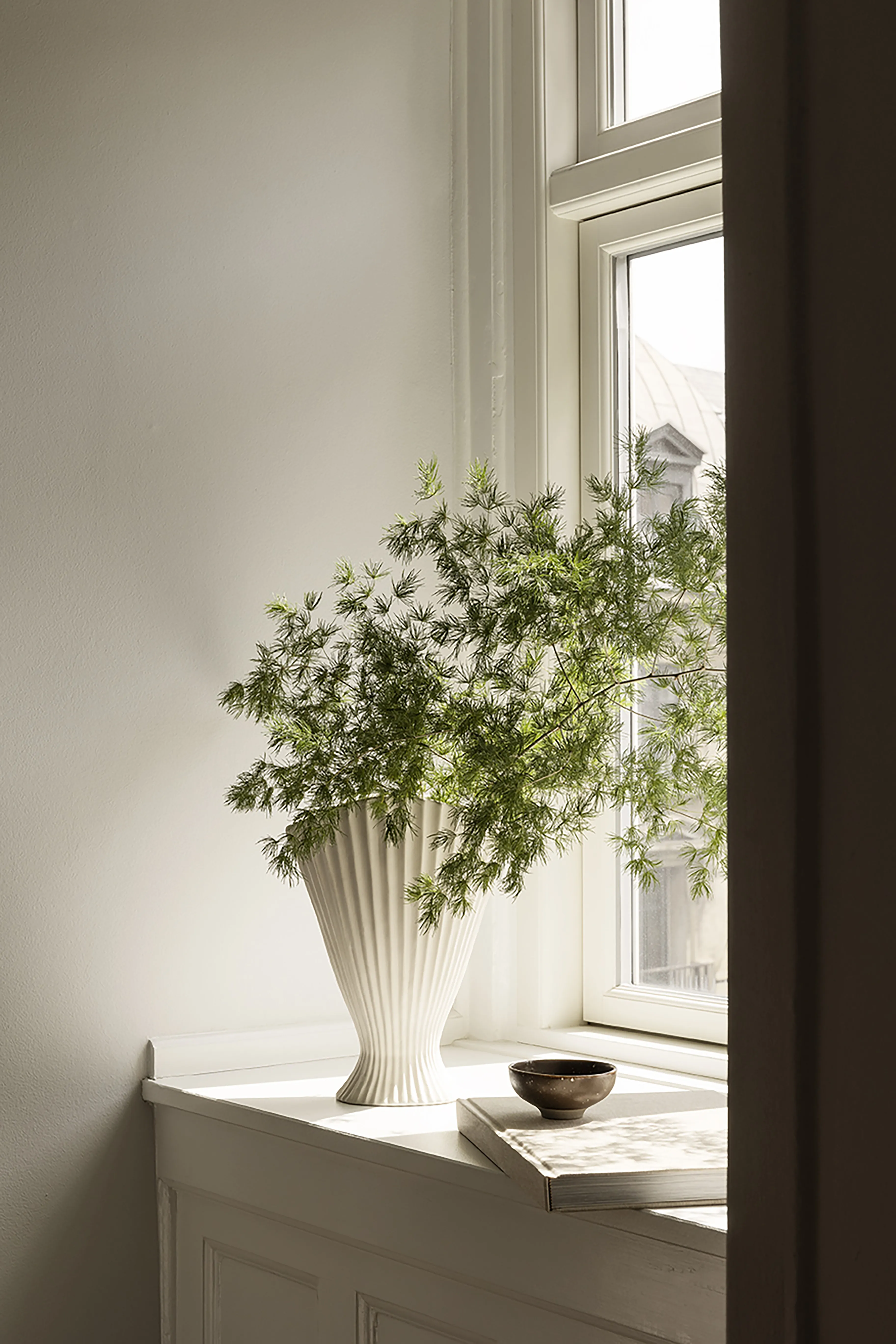 Ferm Livings vita keramikvas Fountain Vase är vacker med veckade linjer. Skålen står på fot och är dekorativ med en blomsterdekoration på bordet, eller utan blomma som blickfång.