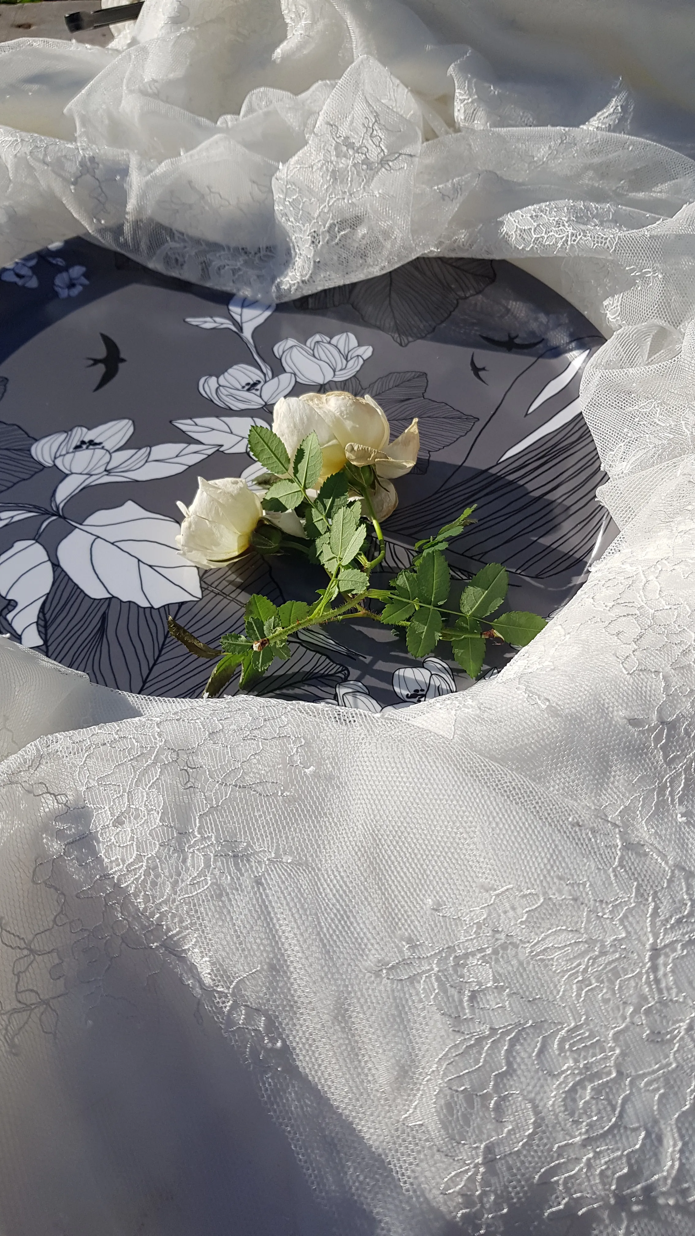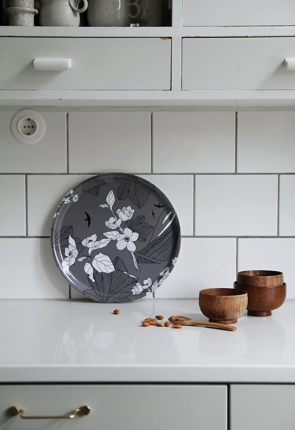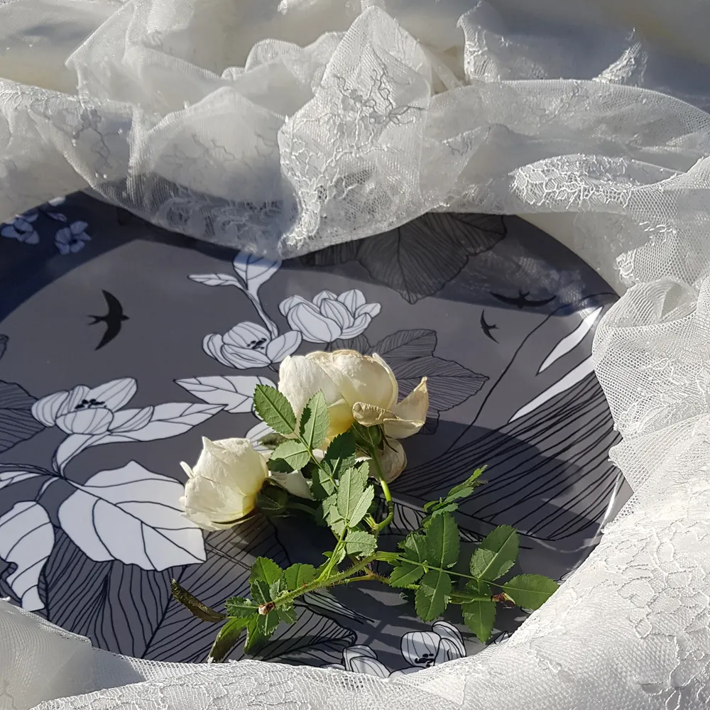 Den blåa brickan, som nu utgått ur sortimentet, står för närheten till havet. Den blåa lyfter träbåten som finns i alla brickor och samtidigt får svalorna en blå himmel att segla på.