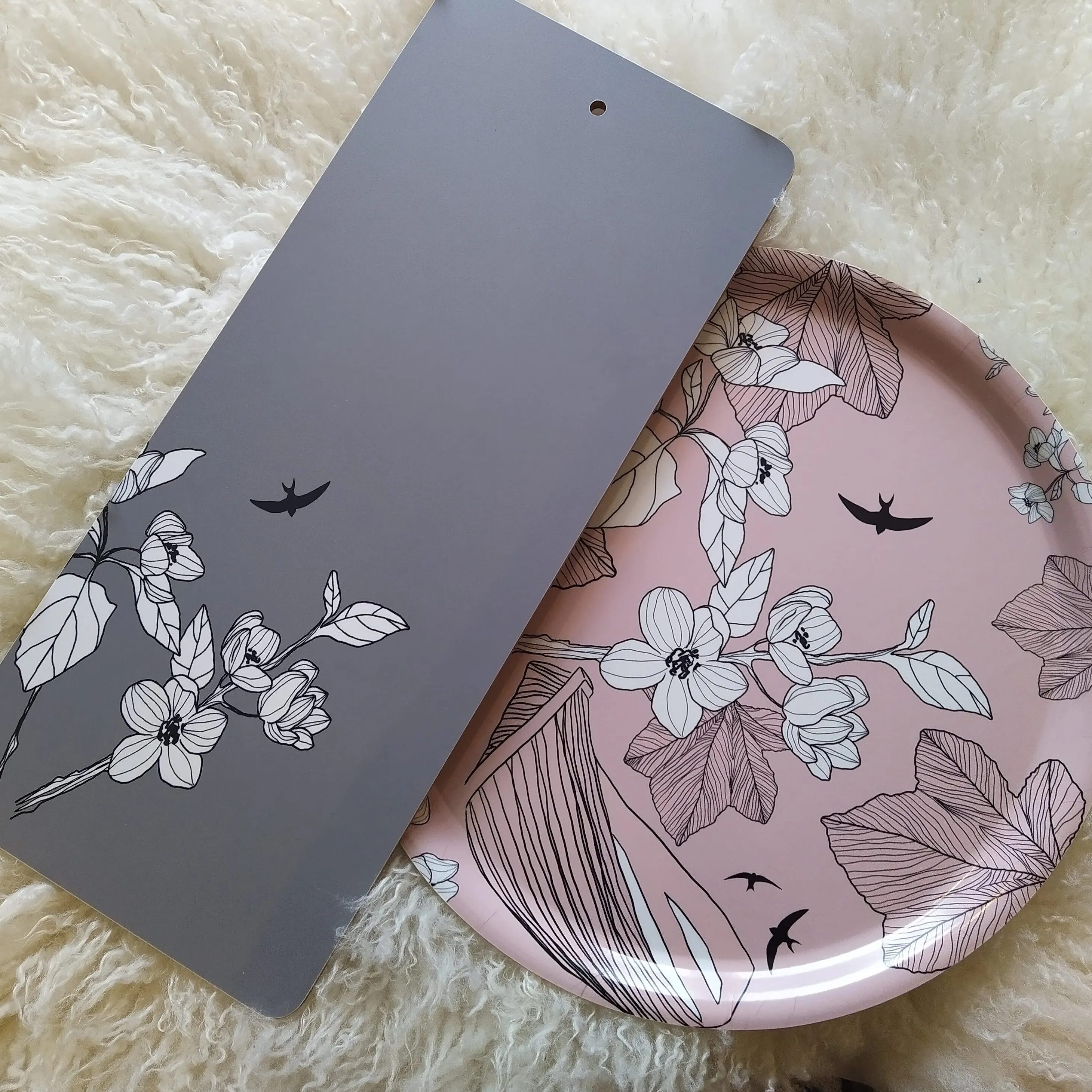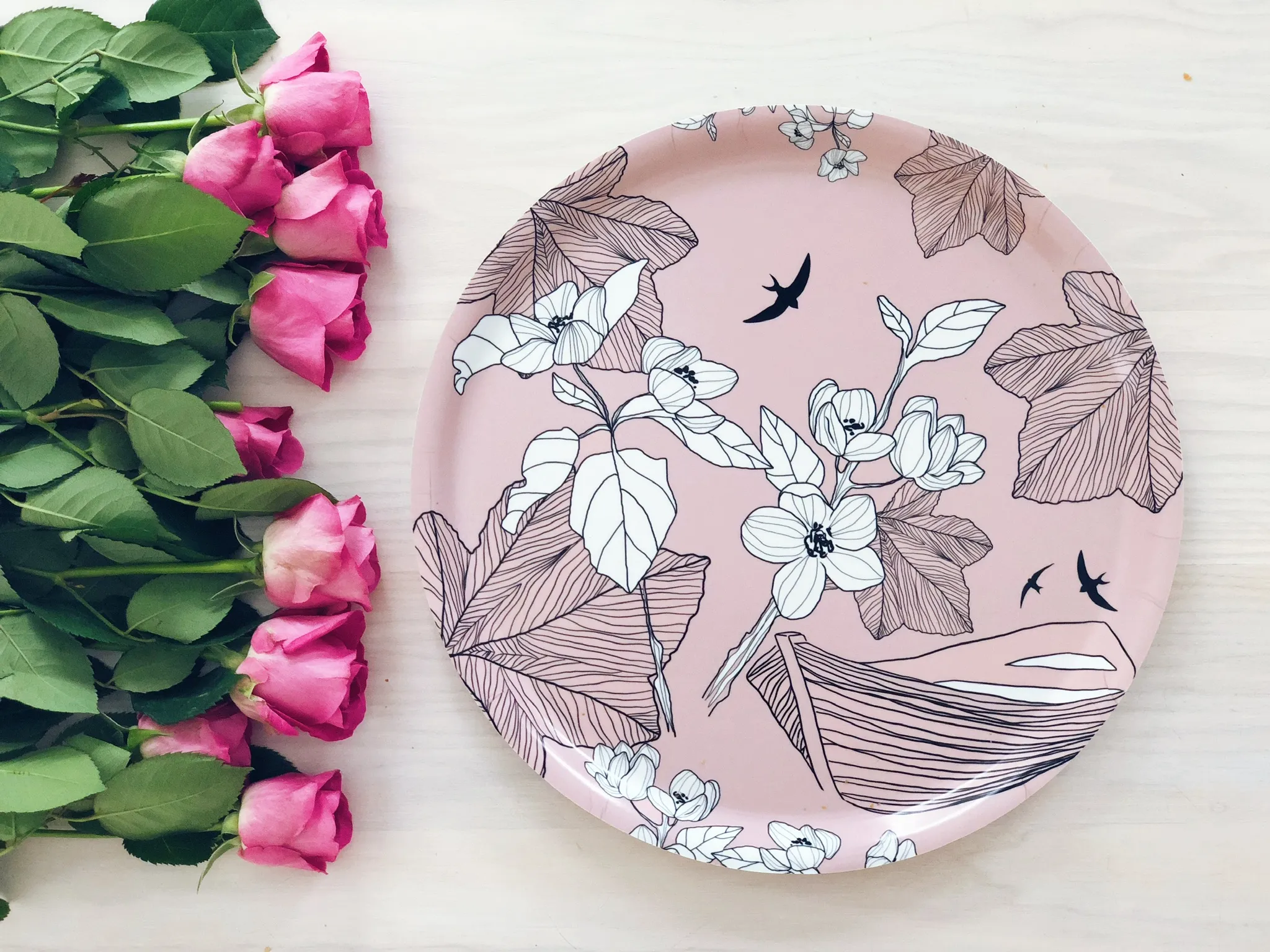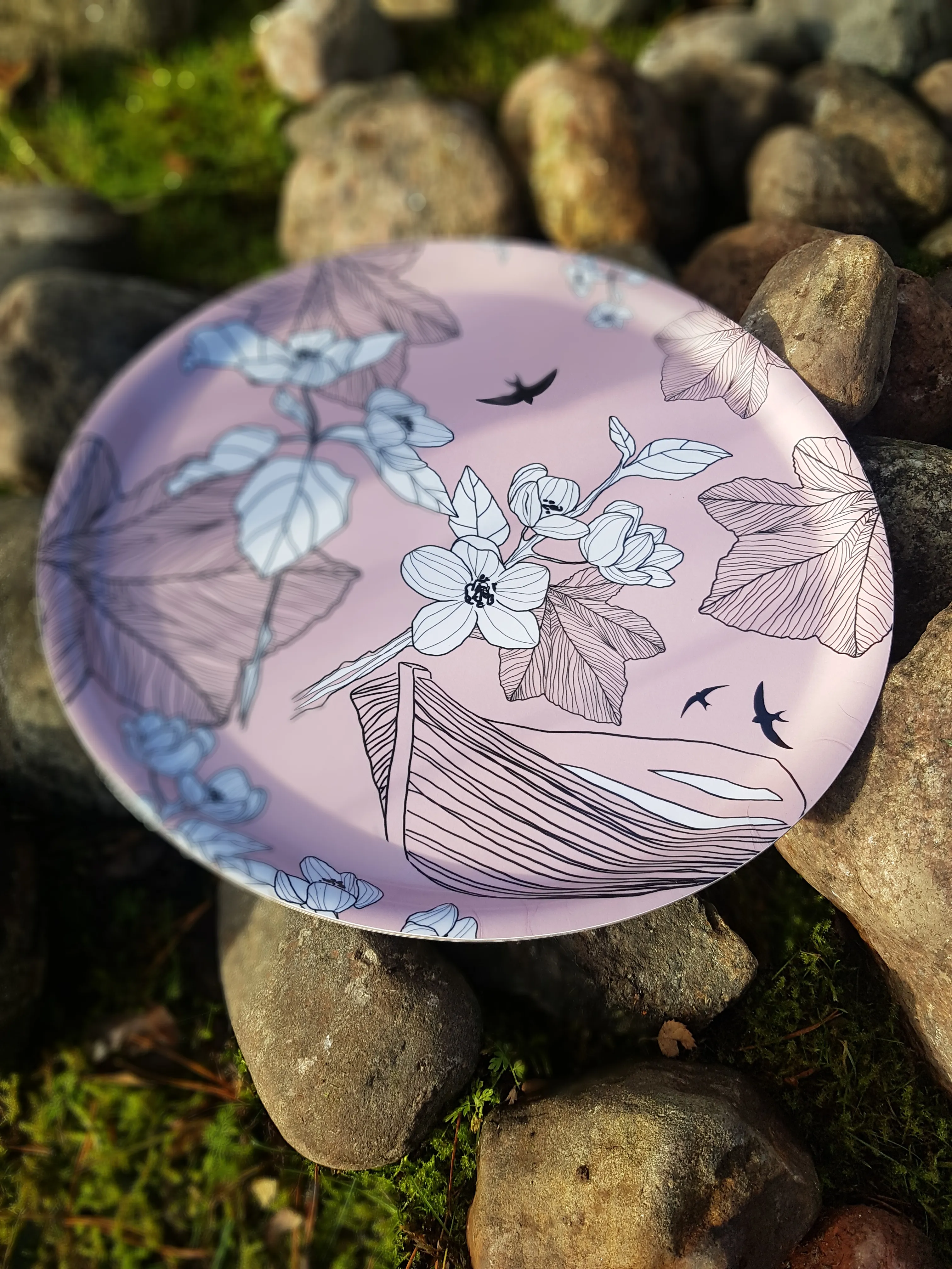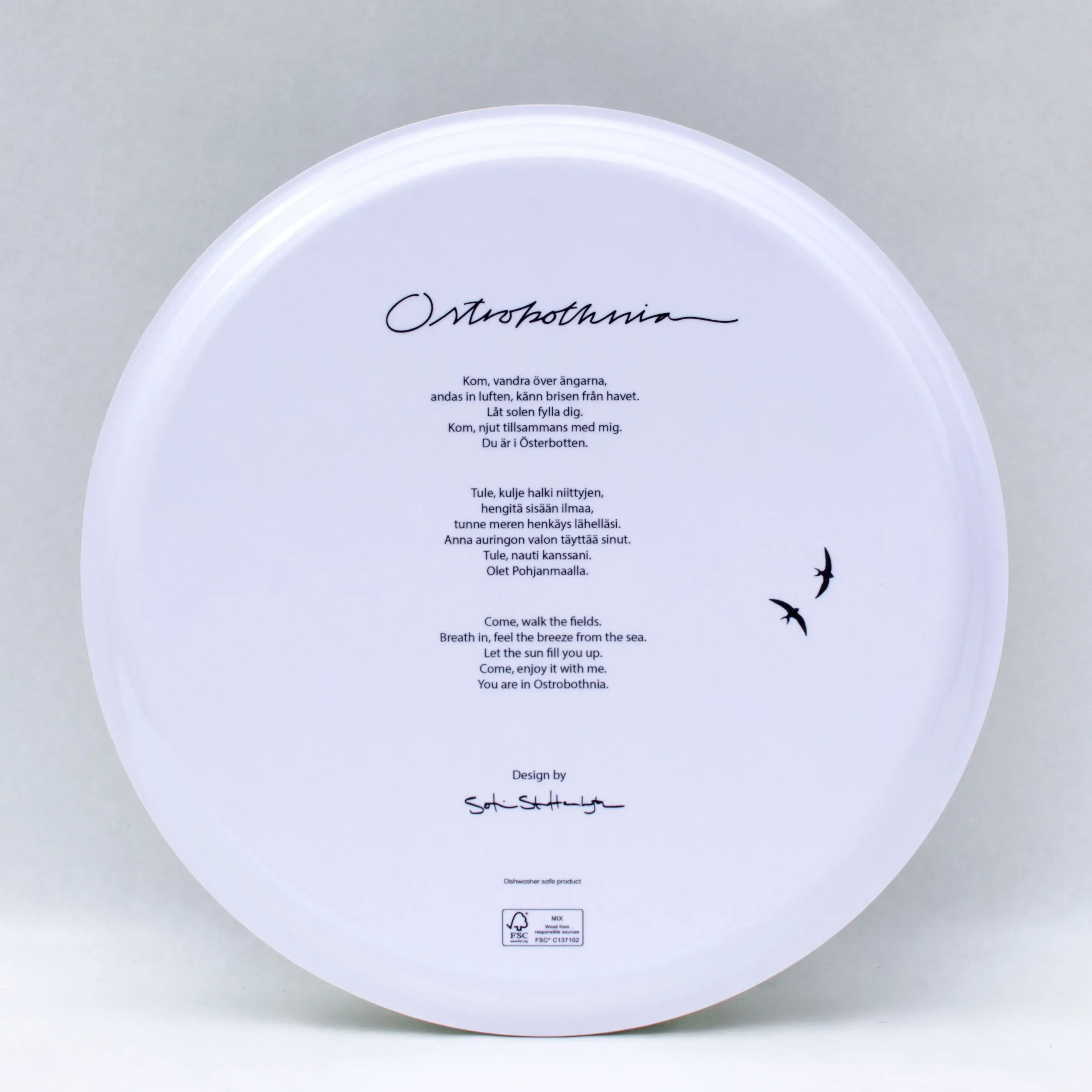 Österbottenbrickan i rosa är romantisk och lugn och tar oss till den österbottniska våren med blommande äppelträd. En fin gåva från Österbotten och till österbottningar. Brickan är designad av Sofie Staffans-Lytz.