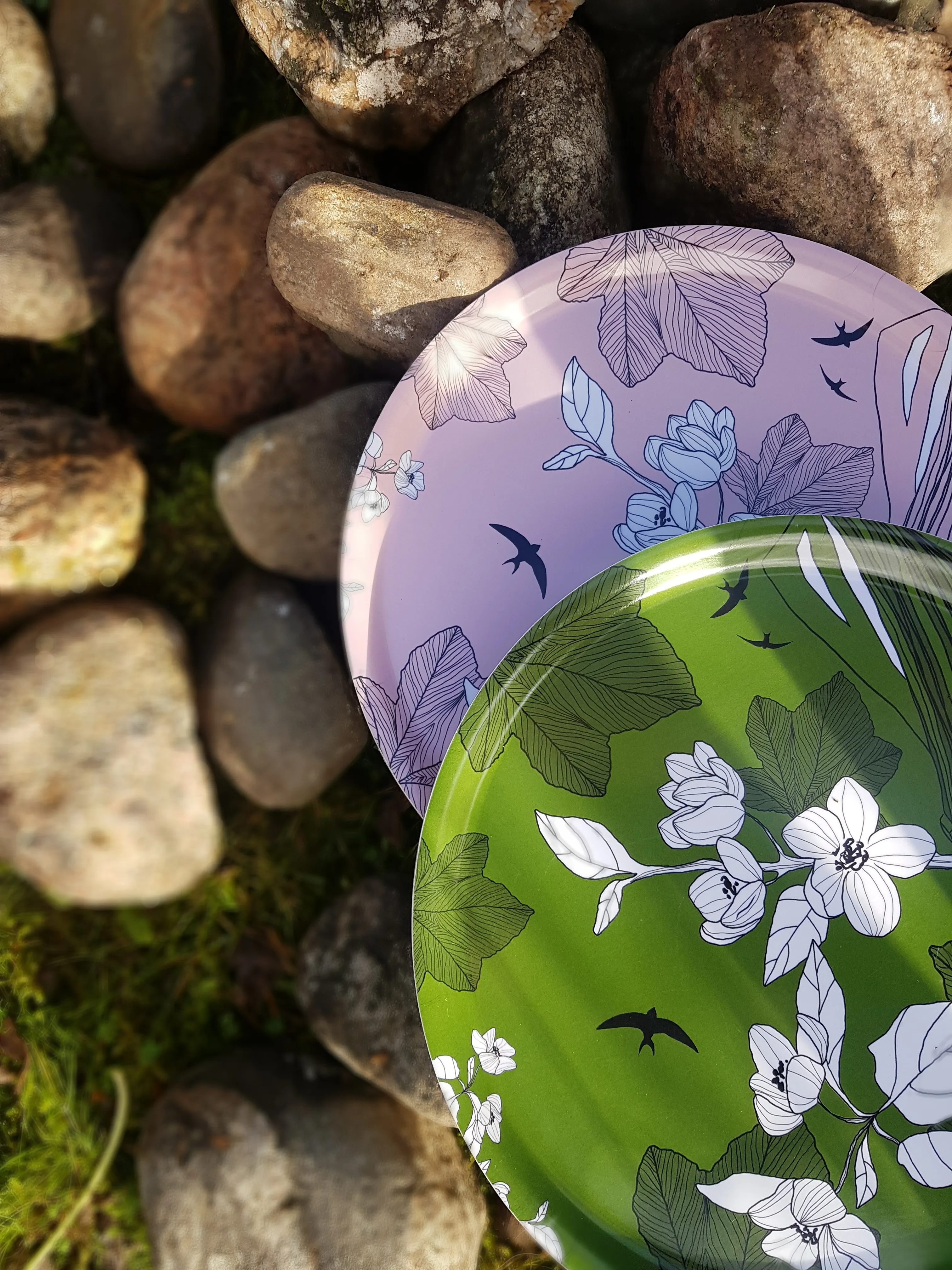 Den blåa brickan, som nu utgått ur sortimentet, står för närheten till havet. Den blåa lyfter träbåten som finns i alla brickor och samtidigt får svalorna en blå himmel att segla på.