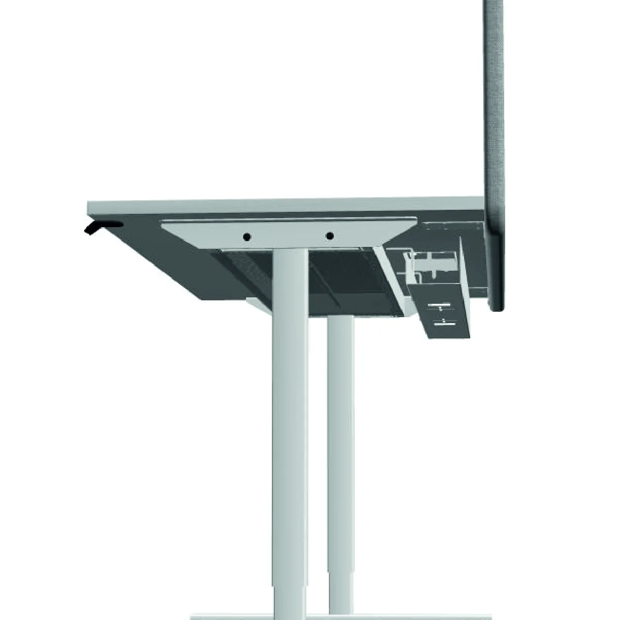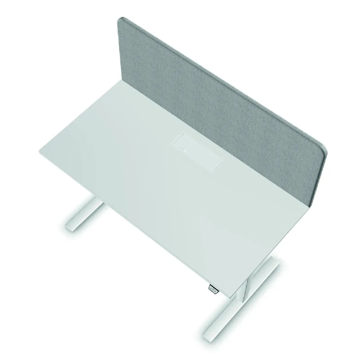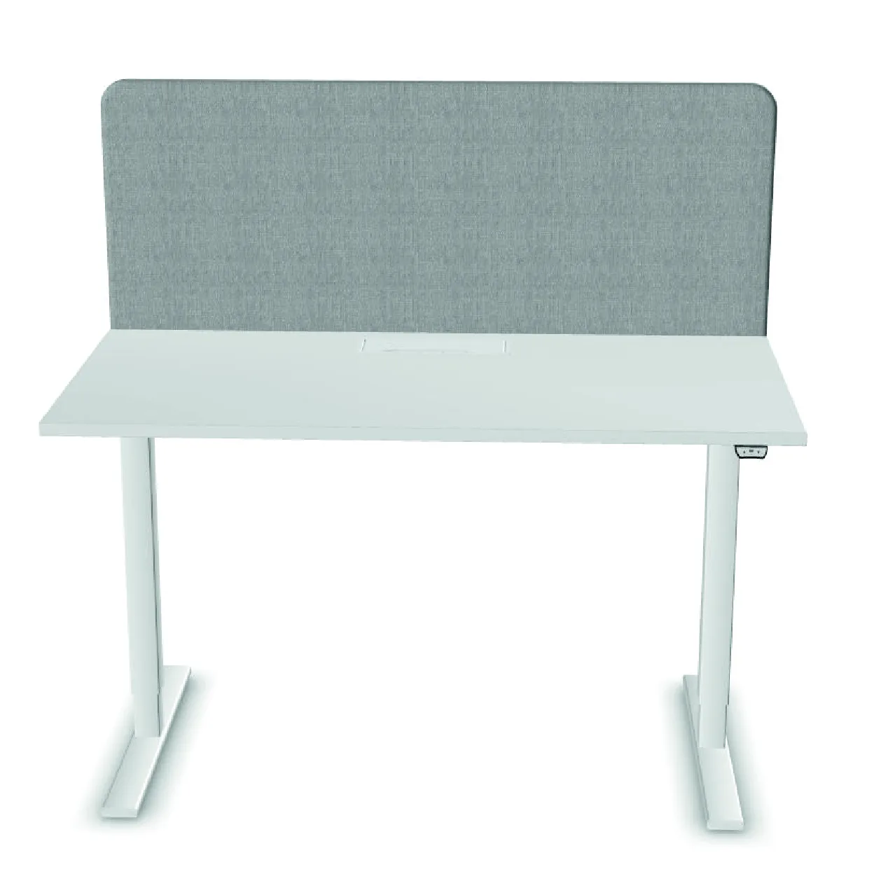 Skrivbordet One med akustikskärm i Mesh-tyg är höj- och sänkbart och gör din arbetsplats hemma mer ergonomisk. Motorn som höjer skrivbordet startar och stannar mjukt. Det vita skrivbordet har hål för sladdar. Kabelhylla att fästa under bordet ingår.