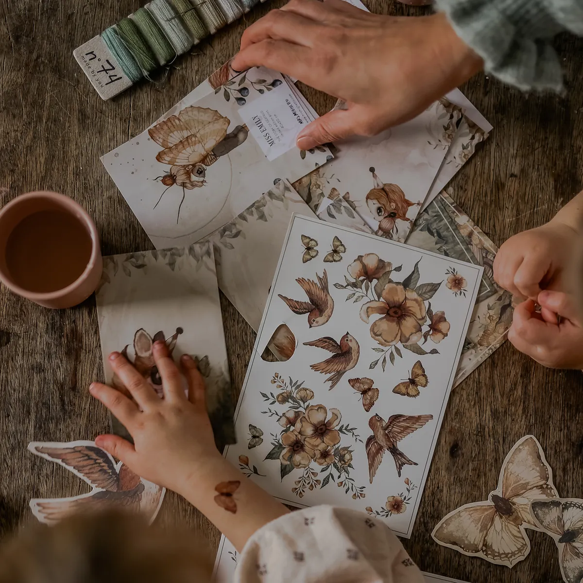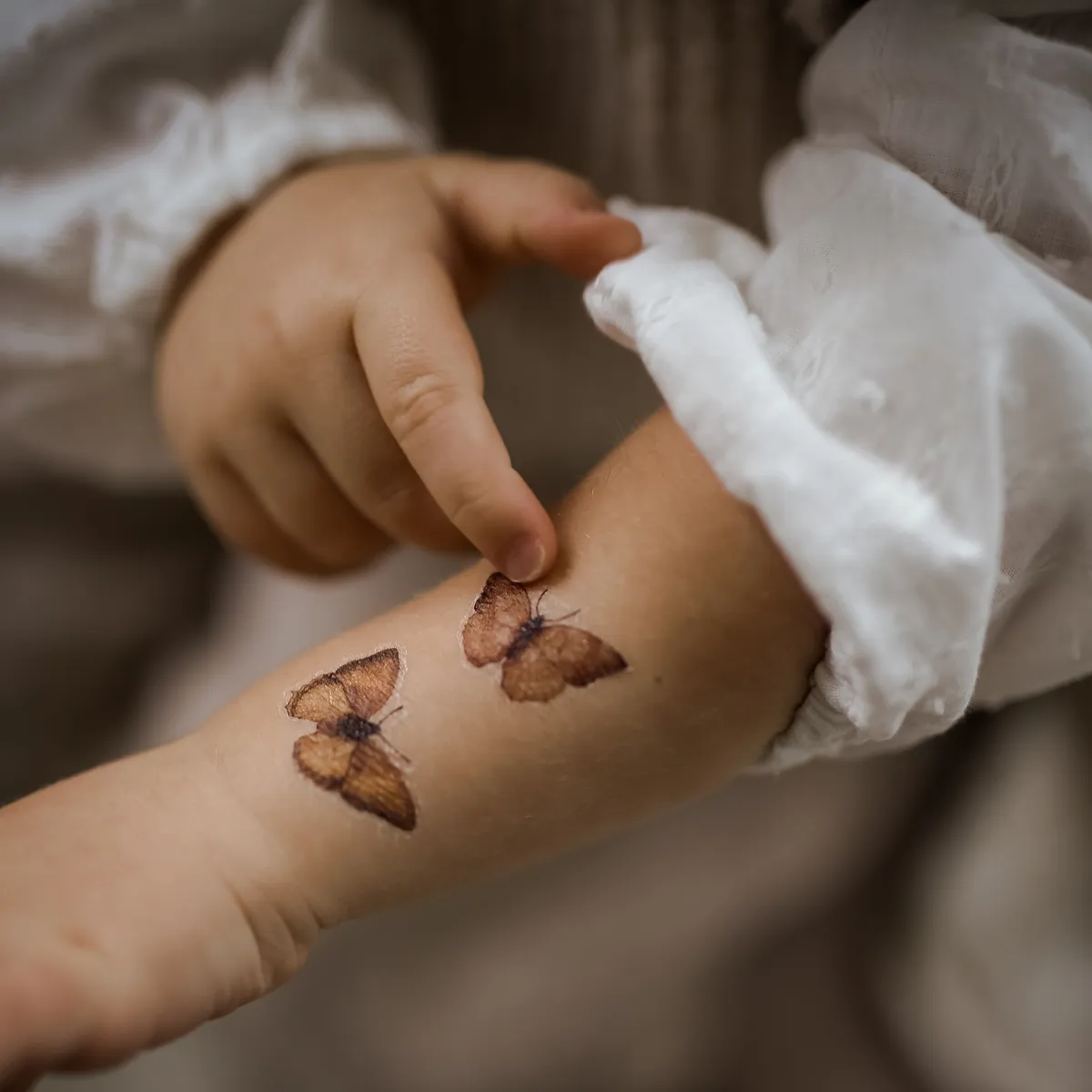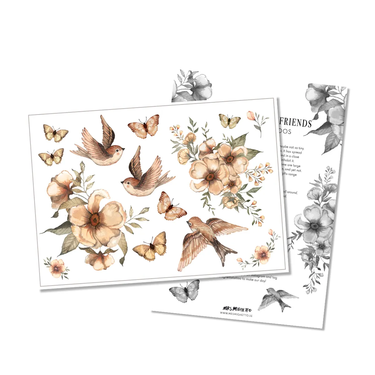 Flowers & Flying Friends barntatueringar håller 2-7 dagar och enkla att lägga fast. Söta tatueringar med fåglar, fjärilar och blommor till barnen. En uppskattad present!