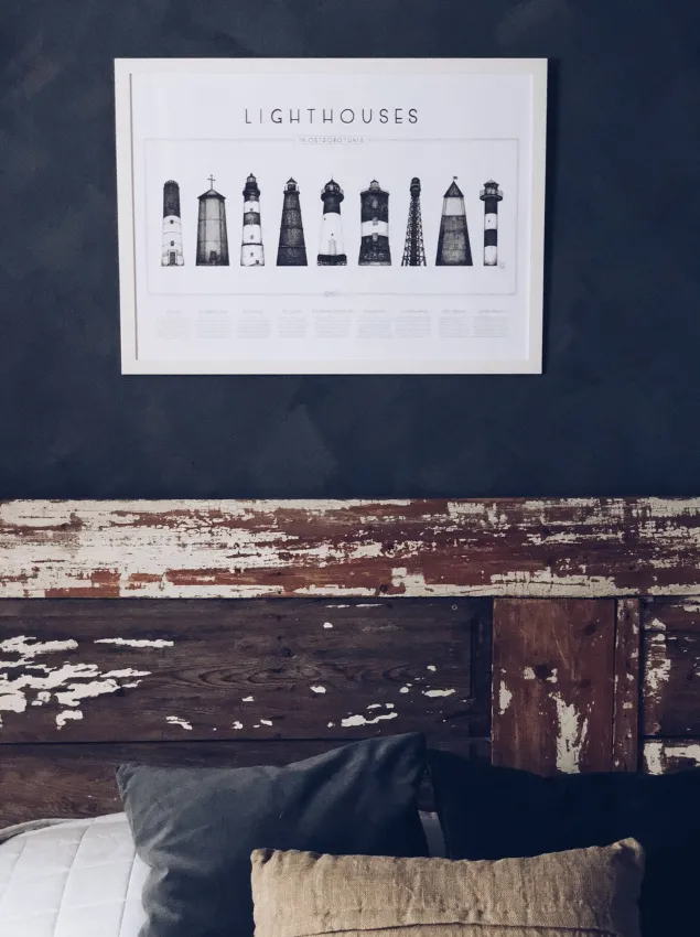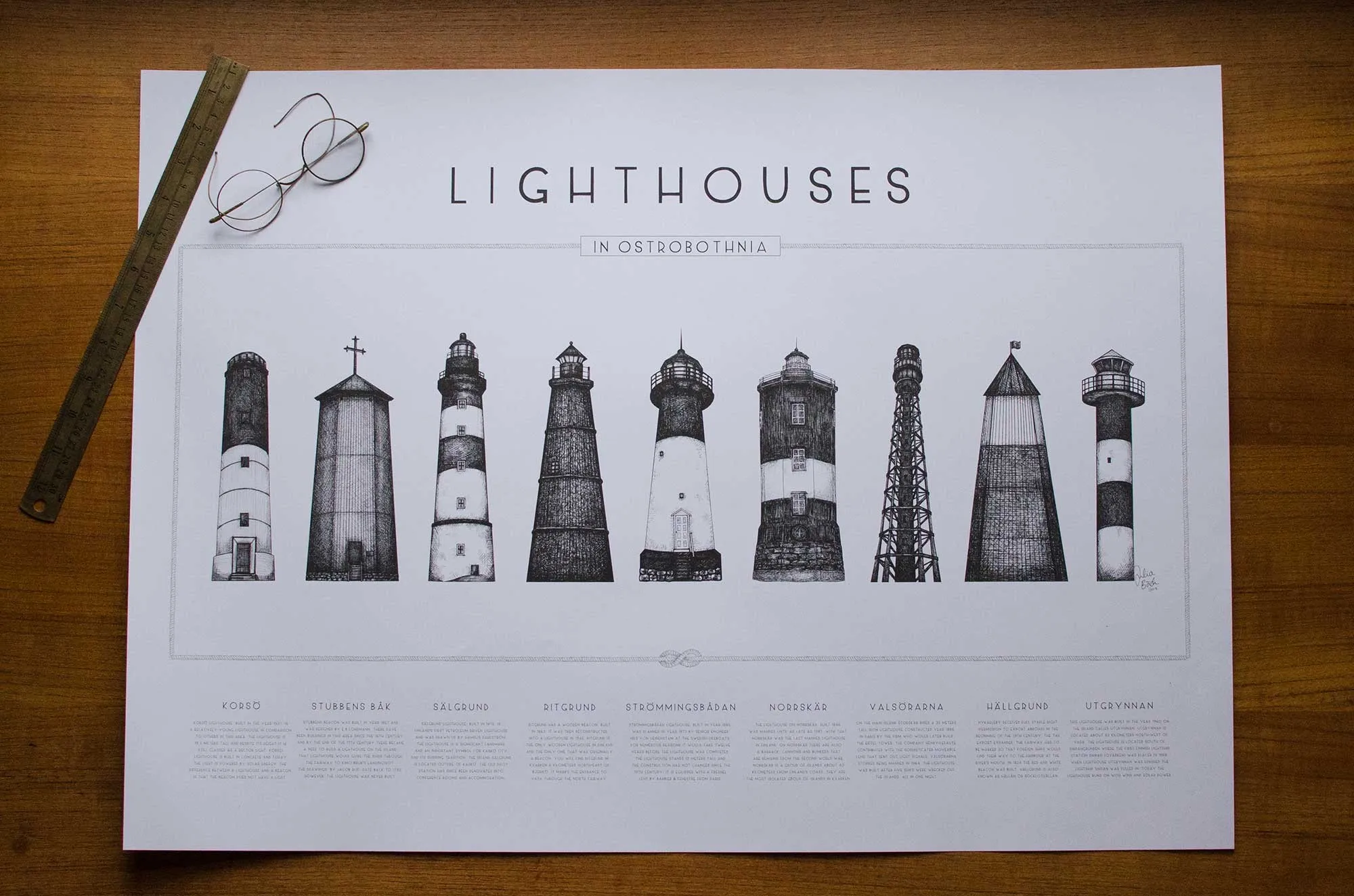 Unik tryckt poster av hög kvalitet baserad på konstnären Julias Bäcks handritade skisser av fyrar och båk. Varje fyr kommer med sin egen historia. En snygg bit historia på din vägg!