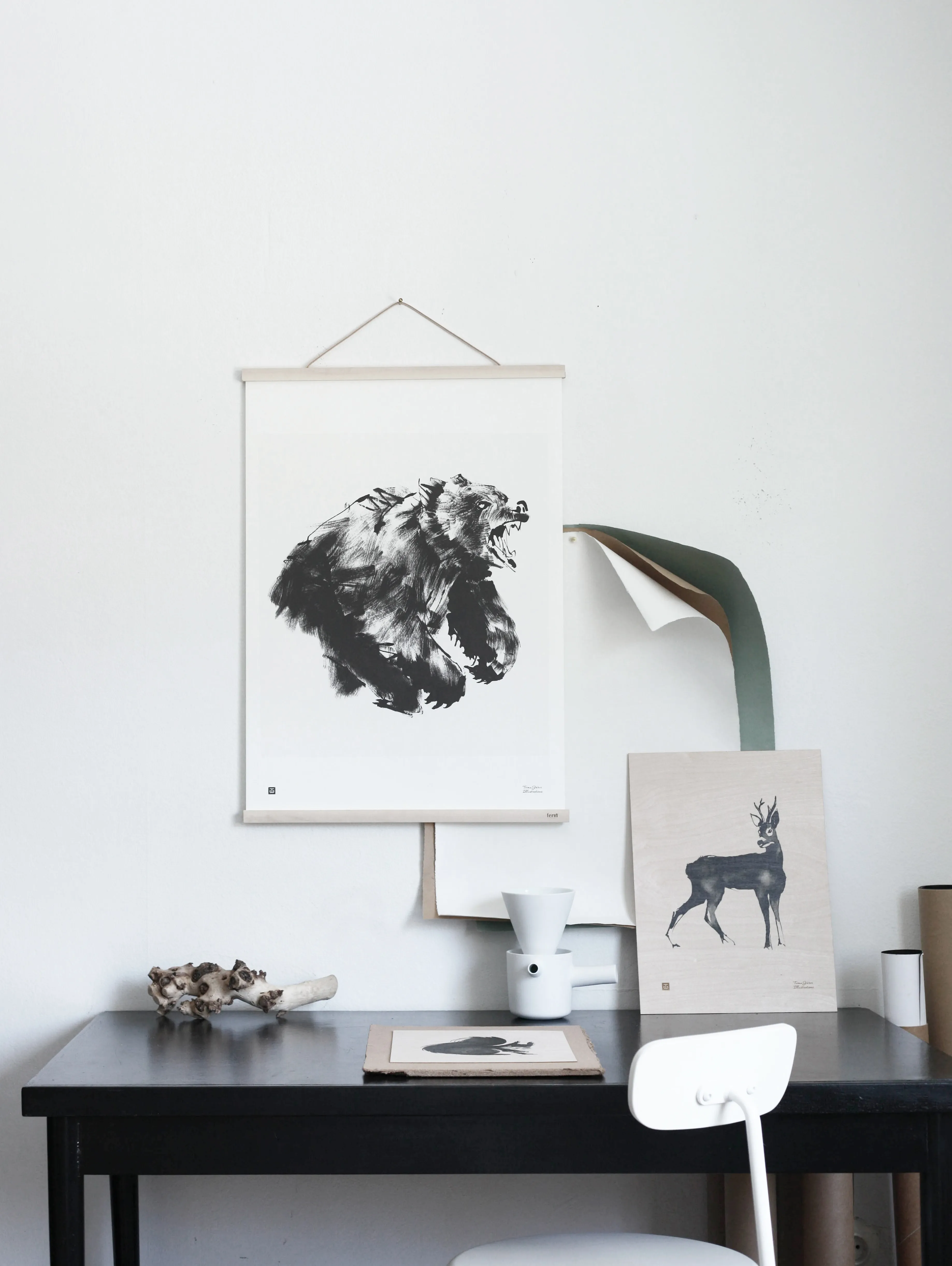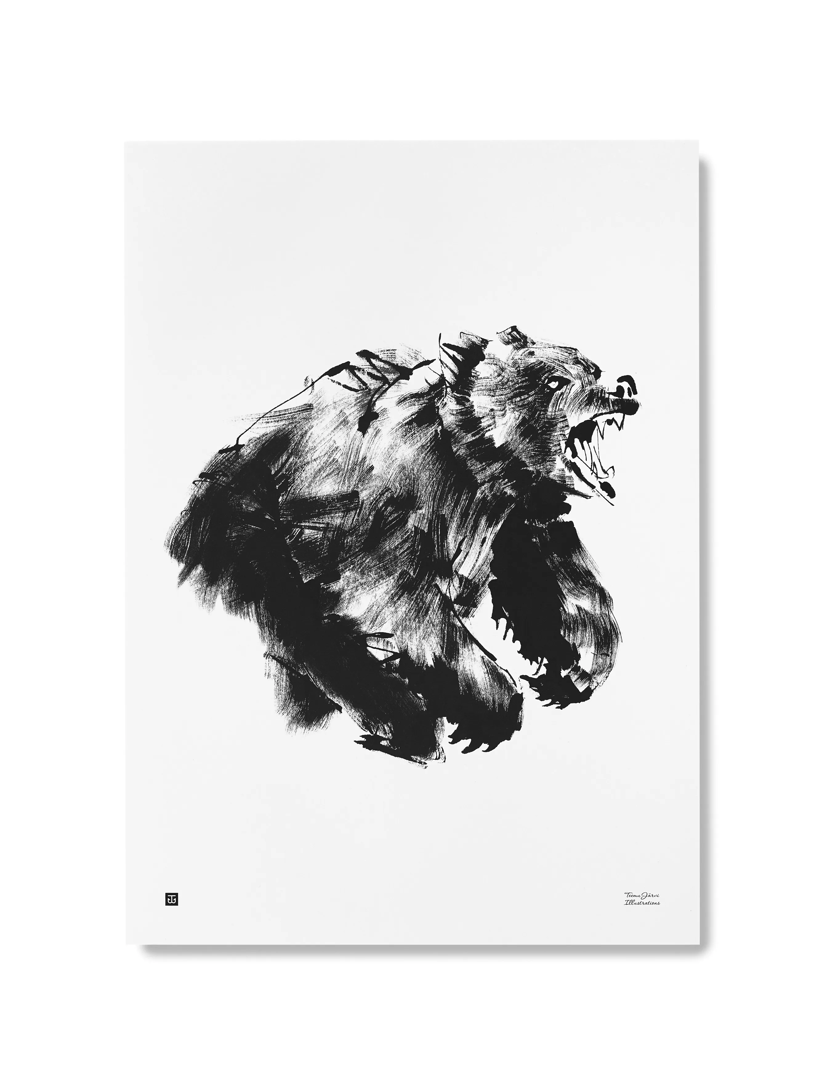 Teemu Järvi Illustrations svartvita plansch med en rytande björn. En modern men hållbar inredningsdetalj som lämpar sig både för barnrummen som hemmets andra rum.