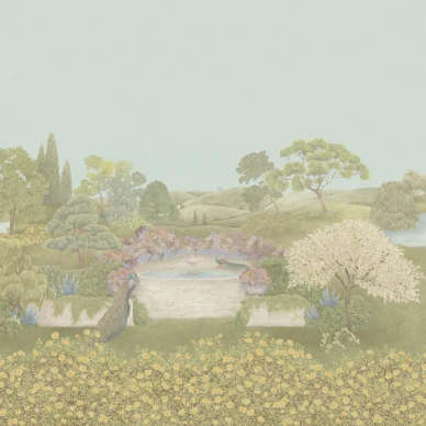 Designers Guilds paneltapet Bandipur Grasscloth är inspirerad av indiska landskapsmålningar med en bäck som rinner genom en grön dal. Tapetpanelen är tryckt på en gräsduk och har en tydlig struktur. Non woven-baksida. Panelen är 2,55 meter bred och 3 meter hög. Varje rulle innehåller 3 våder på 85 cm x 3 m. Tapeten kan upprepas i sidled och justeras enligt takhöjd.