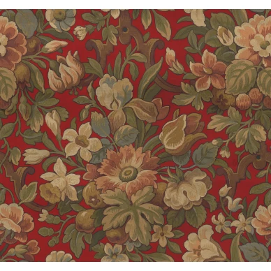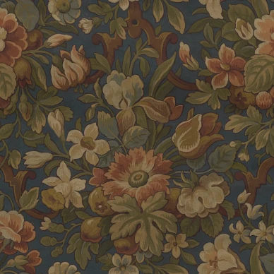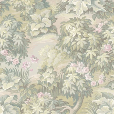 Trädtapeten Benjamin har ett tätt mönster av slingrande eklöv och exotiska fåglar. Tapeten passar i kök, vardagsrum och sovrum.
