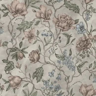 Blommiga tapeten Blossom II är romantisk med stora blommor. En klassisk blomstertapet till sovrum, kök eller vardagsrum. Tapeten har tydlig tygstruktur. Tapeten har större mönster än Blossom Mini.