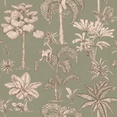 Elliot-tapeten är en fascinerande blandning av naturinspirerad konst och exotiskt berättande. Mönstret visar stora, lövklädda växter och hängande frukter, där lemurer – med sina randiga svansar – rör sig smidigt från gren till gren. Varje detalj är noggrant ritad med punktteknik, vilket ger djup och en känsla av gammaldags gravyr.
