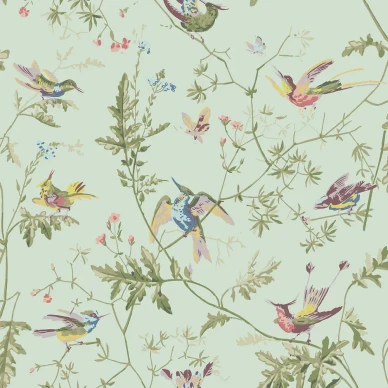 Sandbergs fågeltapet Eugen är romantisk med söta fåglar bland slingrande blommor och grenar. En fin tapet för vardagsrummet eller sovrummet.
