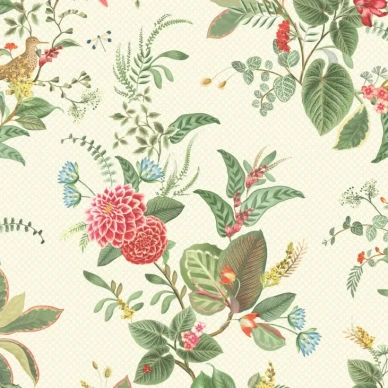 Eijffingers tapet Good Evening med färgglada blommor och fjärilar i olika färger mot en enfärgad botten. Tapeten är romantisk och passar bra såväl i vuxnas som barnen sovrum. Vinyltapeten har en matt yta som går att torka av. Den känns nästan som ett tyg på väggen.