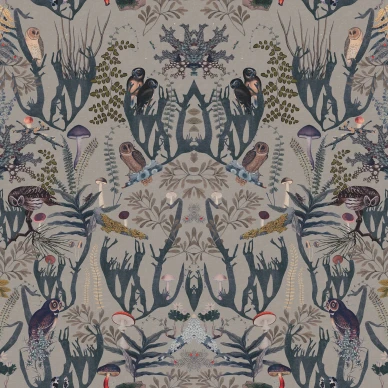 Långelid/von Brömssens fågeltapet Herons har ett lekfullt, rytmiskt mönster med gömda fåglar bland bladen. En vacker och modern tapet som som vardagsrumstapet, sovrumstapet eller matsalstapet. Design: Emma von Brömssen.