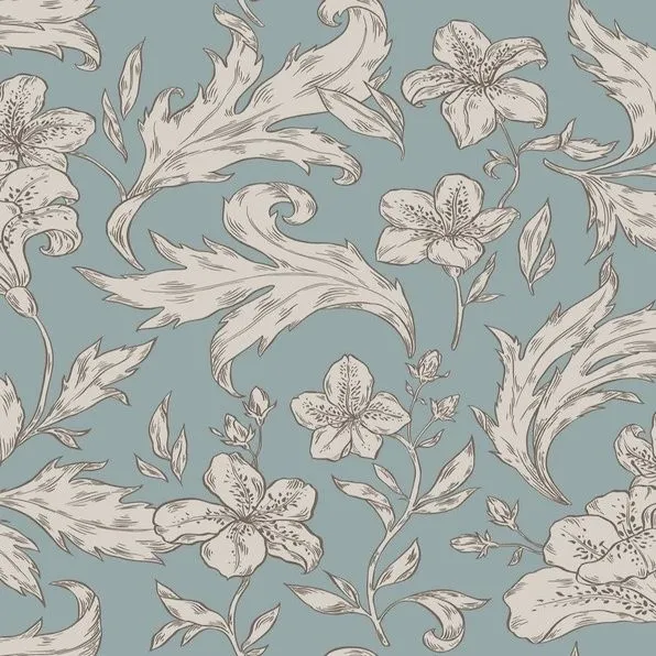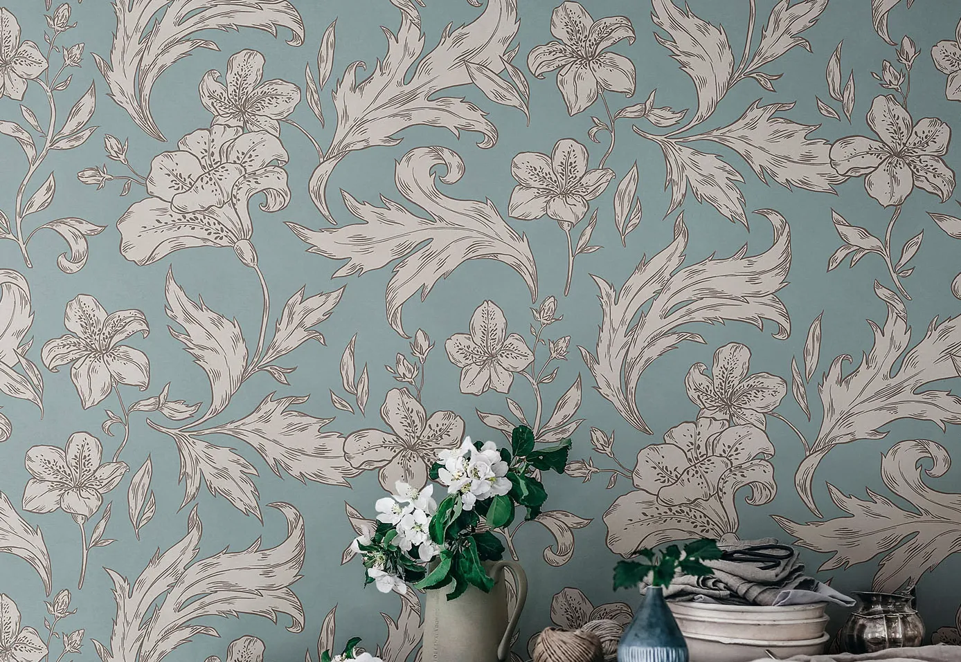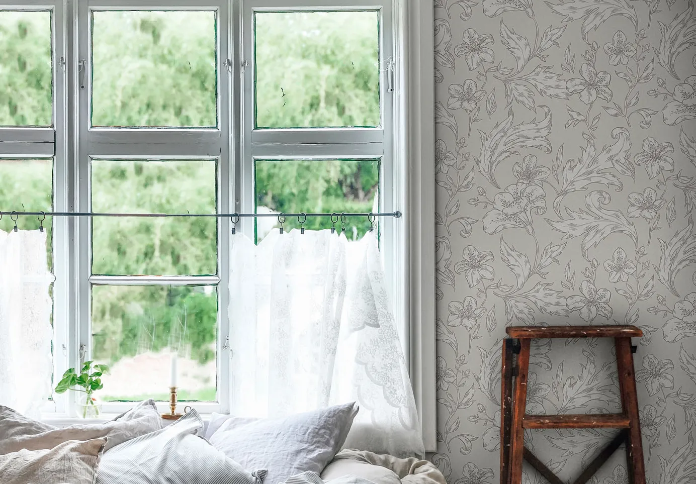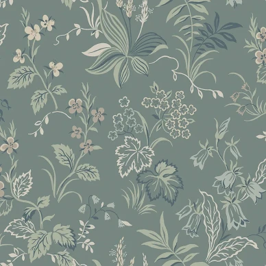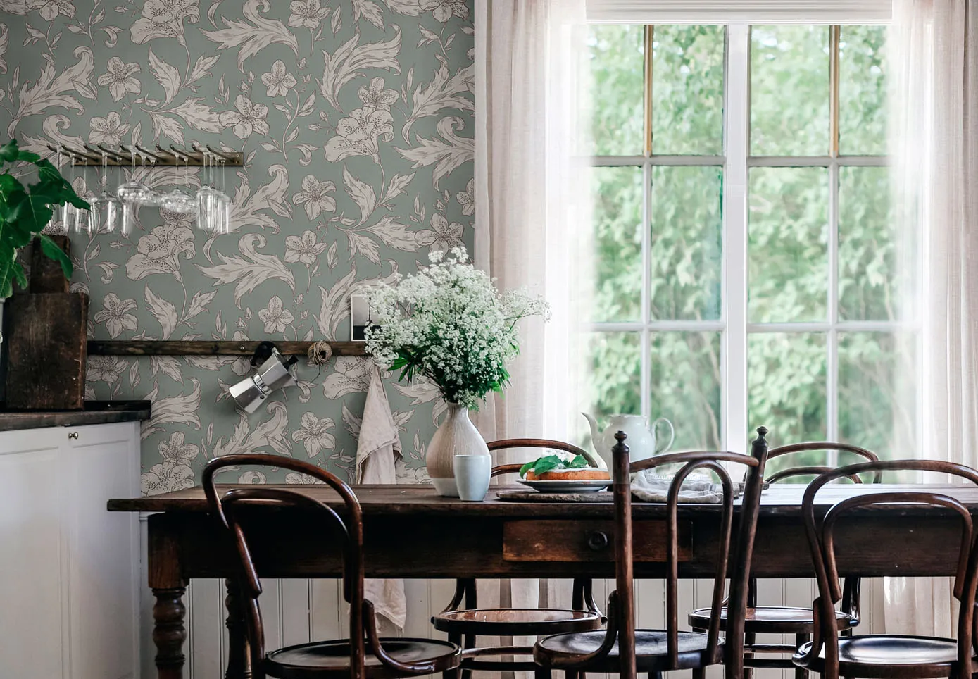 Sandbergs tapet Karin med stora blommor och blad är djärv men samtidigt mjuk. Tapeten fås i flera olika mjuka färgtoner och skapar en lätt känsla i rummet. Passar bra i köket och också i sovrummet.