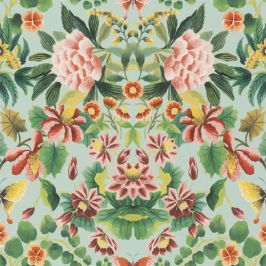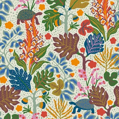 Blommiga tapeten Kvackstepp är tätt mönstrad och detaljrik med blommor och roliga detaljer som paddor och getingar. Det myllrande mönstret är skapat av svenska formgivaren Hanna Werning. Designtapeten passar i vardagsrum, sovrum, kök och matsal, hall eller hemmakontor. En framtida tapetklassiker!