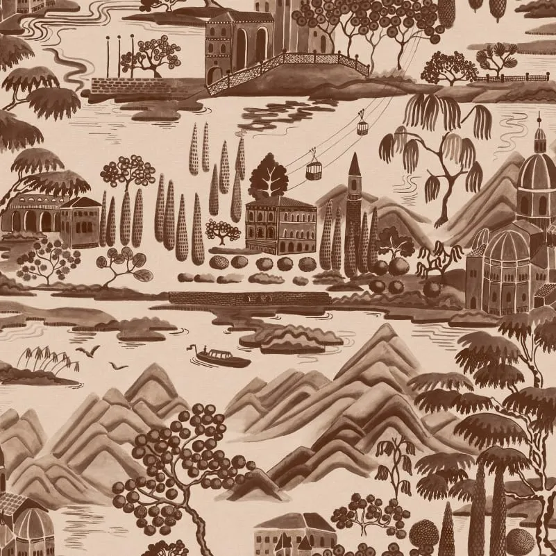 Denna tapets styrka ligger i dess bildliga karaktär. Den skänker rummet en känsla av landskap och kulturellt djup utan att kännas tung. Villorna, vattnets stillhet och bergens silhuetter tillsammans skapar en klassisk toile-känsla som känns både traditionell och sofistikerad.