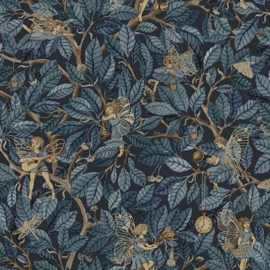 Sandudds tapet Lehvistö har ett tätt men luftigt bladmönster. Luftigheten förstärks av de glansiga detaljerna.