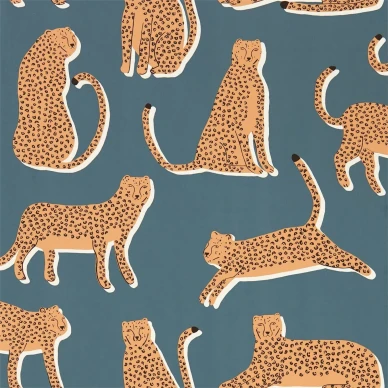 Djurtapeten Leopard Walk med ståtliga leoparder som marscherar på rad är en rolig tapet med regelbundet mönster. Tapeten passar i vardagsrummet, matsalen, barnrummet eller varför inte hemmakontoret.