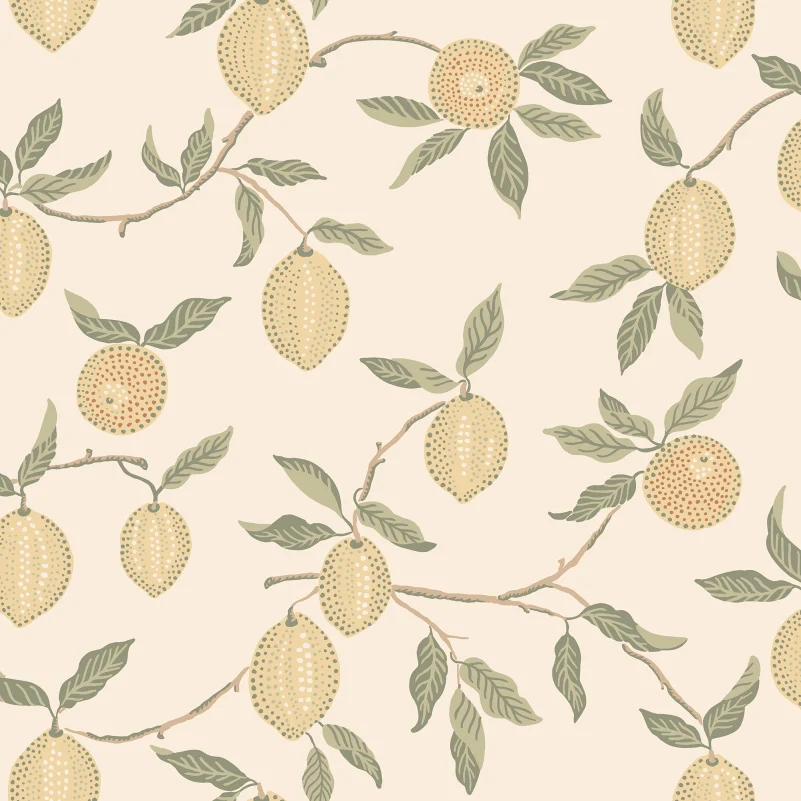 Limone-tapeten är ett mönstrat tapet där citronkvistar, blad och frukter bildar ett ljust och igenkännligt motiv på väggen. Mönstret ger omedelbart ett medelhavsinspirerat sken till rummet, men fungerar inte bara som en effekt, eftersom teckningens rytm är tydlig och helheten är lätt att hantera.