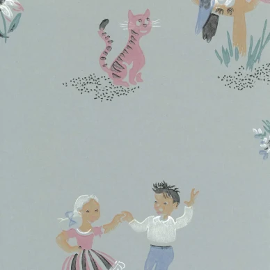 Maaria Wirkkalas teckningar återfinns på barntapeten Enkeli. Hon ritade dem som fyraåring 1958. Retrotapeten passar i barnrummet.