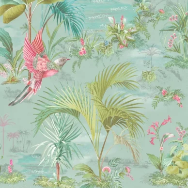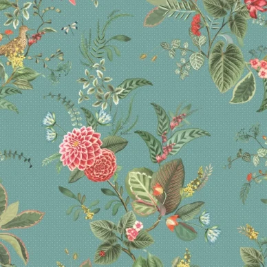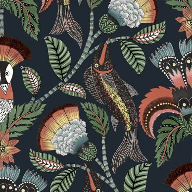 Boråstapeter Mårdgömma är en färggrann skogstapet med djur och andra intressanta detaljer.