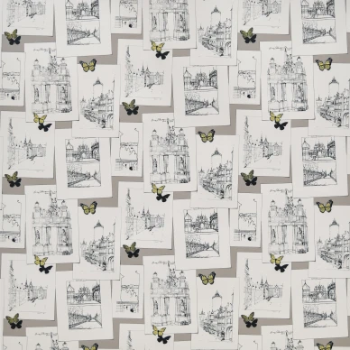 Cole & Son:s grafiska tapet Mediterranea med ett stadslandskap fyllt av fönster, tak och kupoler är detaljrik och tättmönstrad. Tapeten skapades på 1940-talet till Piero Fornasettis eget hus i Milano.