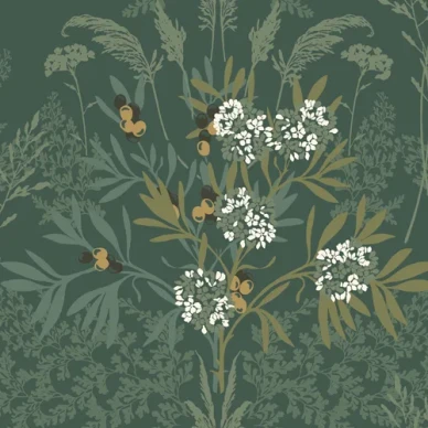 Muraltapeten Melsetter med fåglar i blommande träd är som ett tre meter högt konstverk. May Morris designade mönstret ursprungligen 1893 till sin pappa William Morris säng som sängtäcke. Två färgalternativ.
