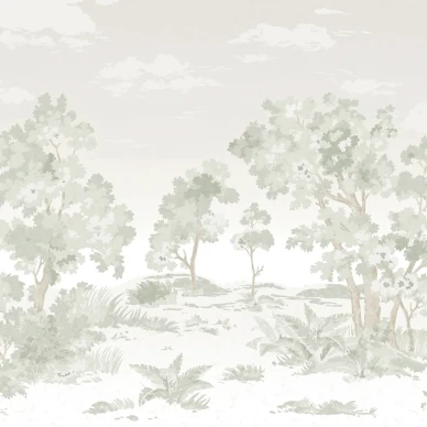 Designers Guilds landskapstapet Miyako Scene är dekorativ. Tapeten har många vackra detaljer med berg, fåglar och löv. Färgsättningen är lugn och rogivande och känns som en stor målning på väggen.