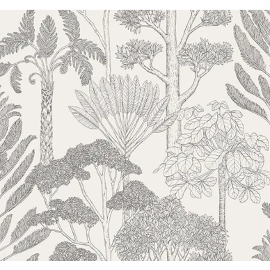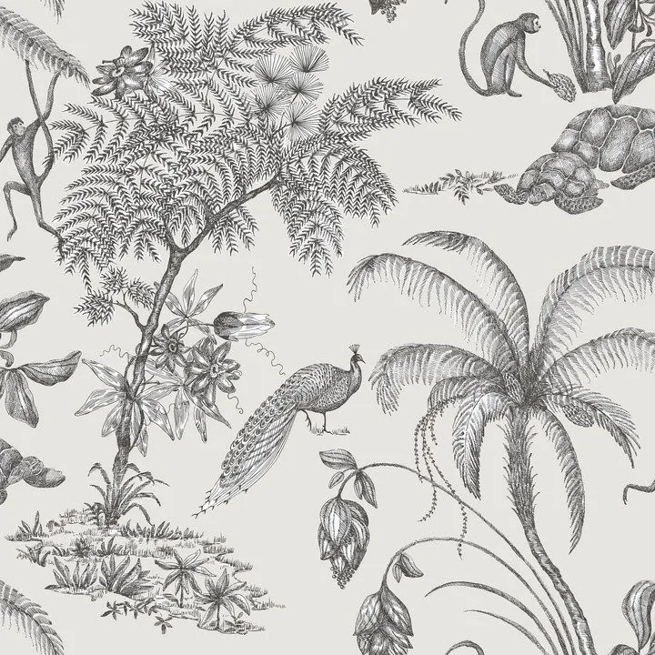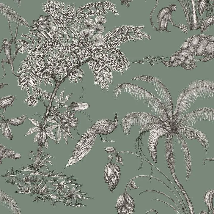 Sandbergs exotiska tapet Moa med apor, sköldpaddor och påfåglar bland palmer och vackra blommor. Tapeten passar såväl i barnrum som hall eller vardagsrum.