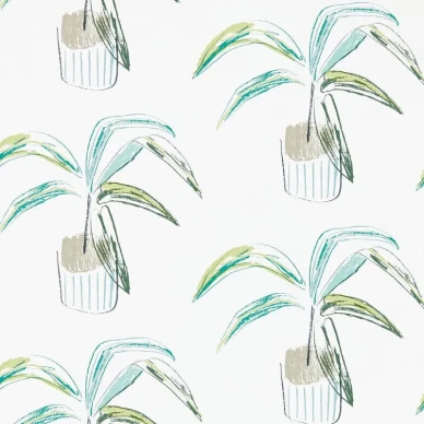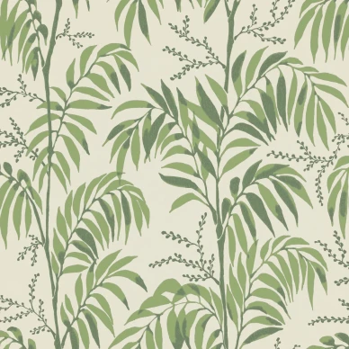 Palmtapeten Palm House med palmer som vajar är modern och grafisk. Det naivistiska mönstret kräver två tapetvåder - en högersida och en vänstersida. Två färgalternativ.